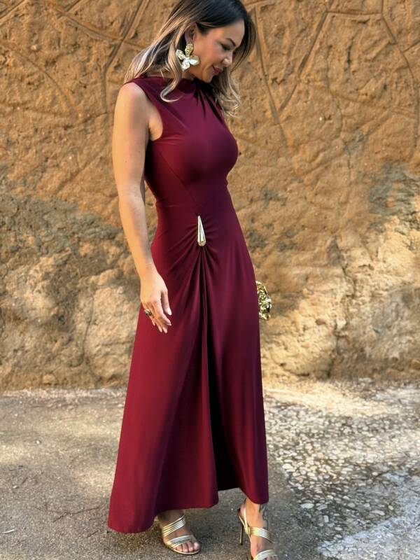 Vestido largo cuello halter atado en cuello, espalda descubierta, falda capada con corte lateral y detalle fajín central con broche concha dorada.
