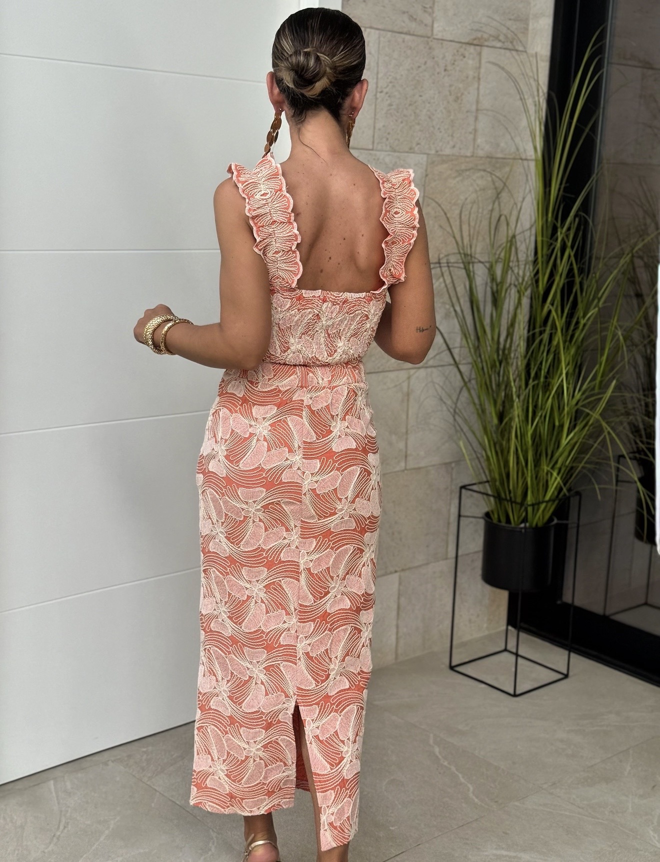 Conjunto top y falda con bordado sobrepuesto encima de forro, tirante ancho ondas y detrás nido de abeja, falda midi con cremallera lateral y goma trasera.