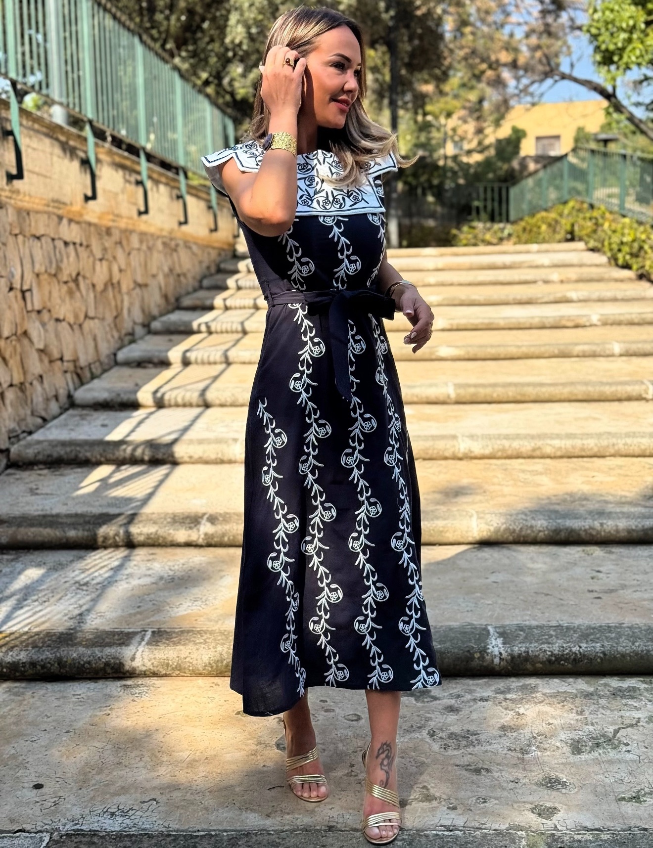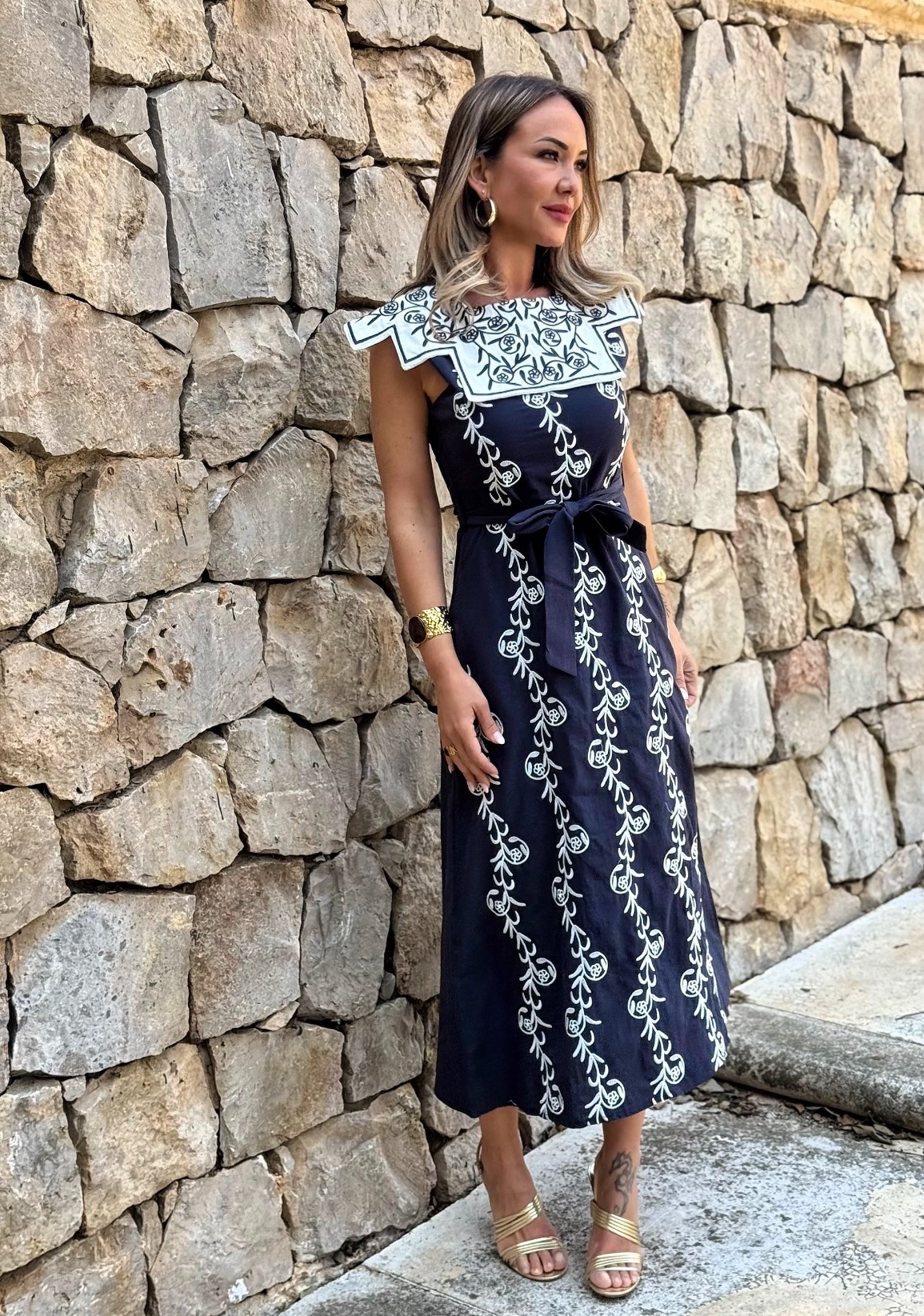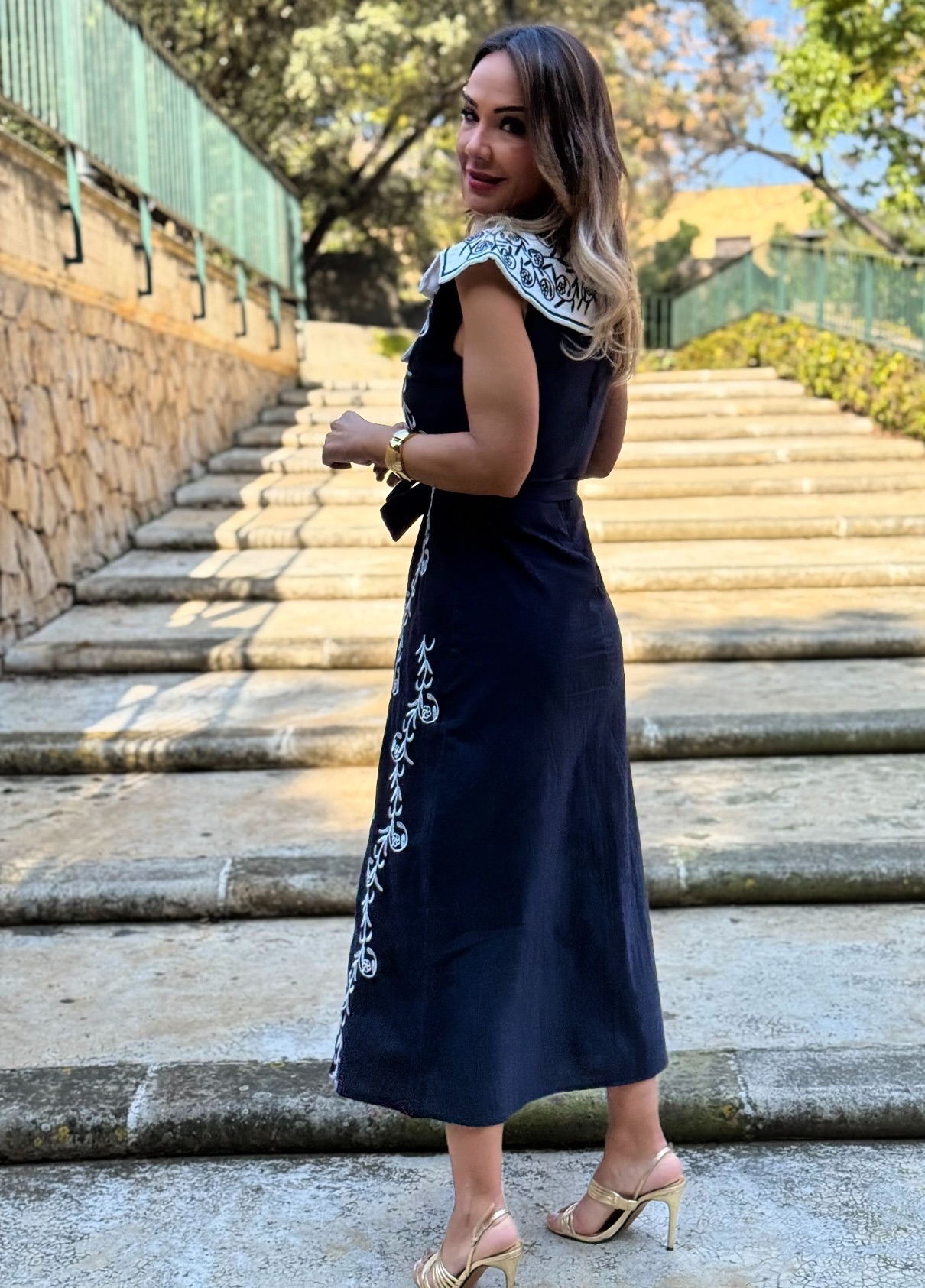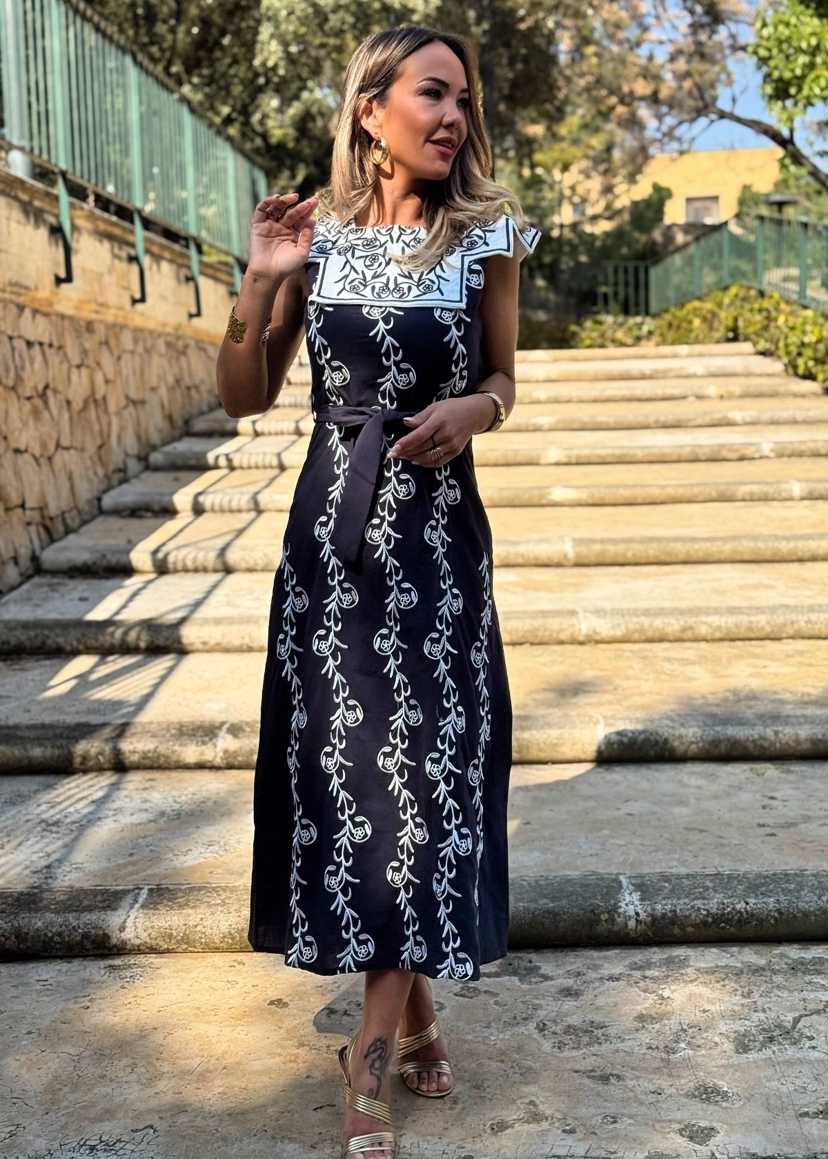 Vestido midi sin mangas cuello cuadrado babero con bordados, cinturón lazada en cintura.
