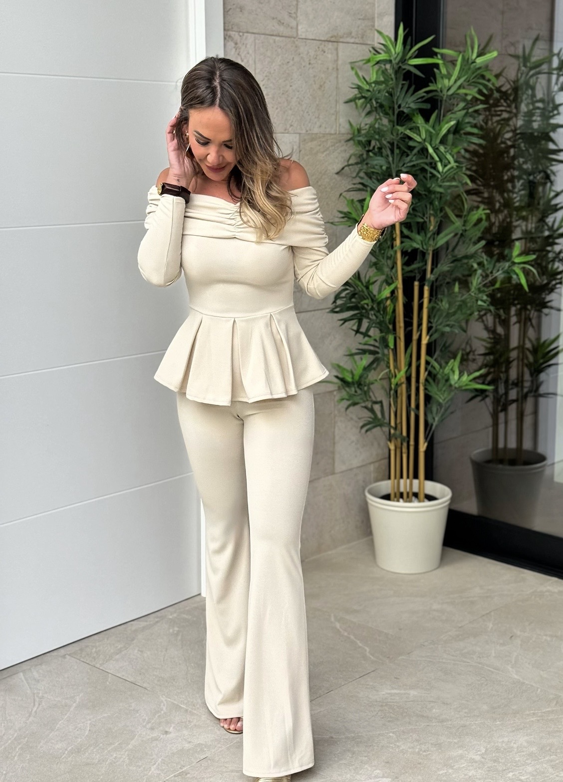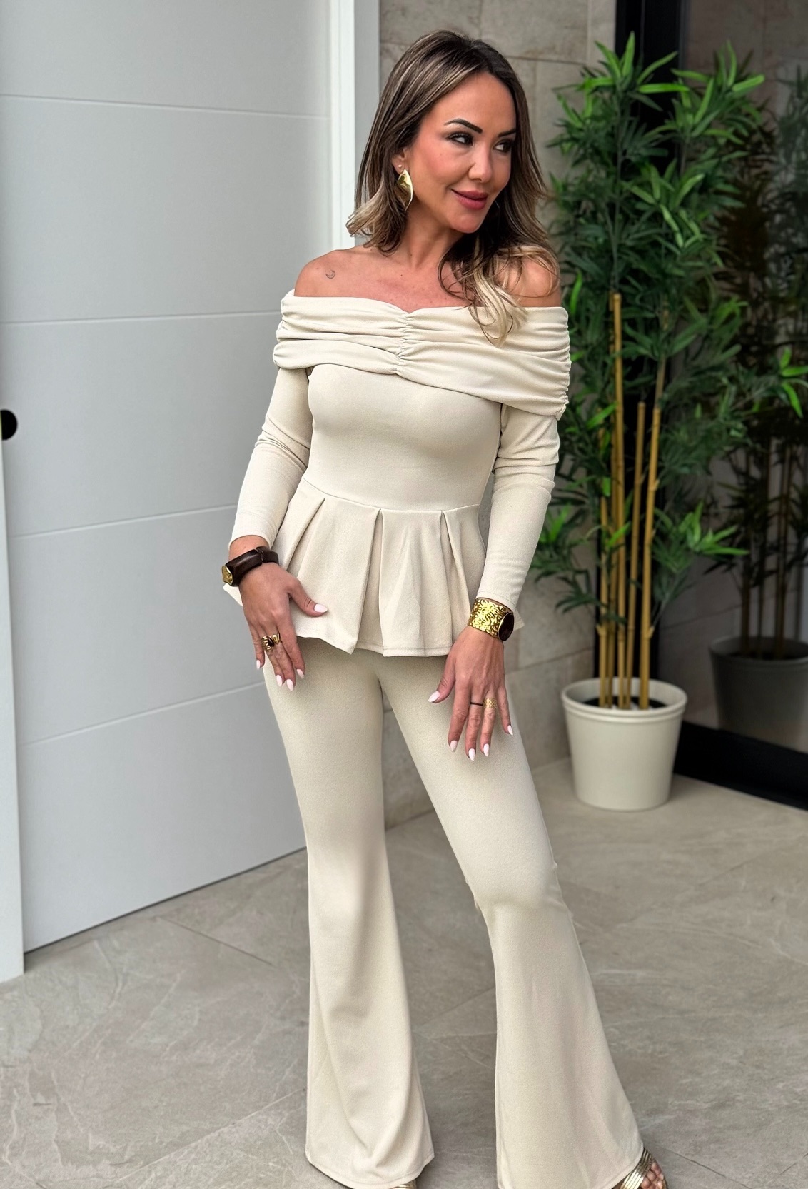Conjunto legging con goma en cinturita elástico y bajo campana, top escote bardot con volante bajo.