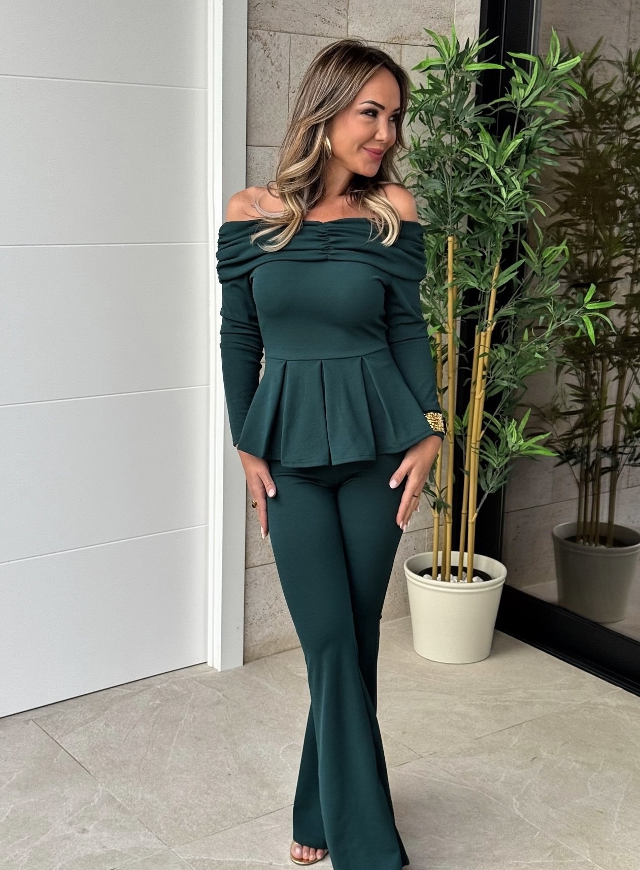 Conjunto legging con goma en cinturita elástico y bajo campana, top escote bardot con volante bajo.