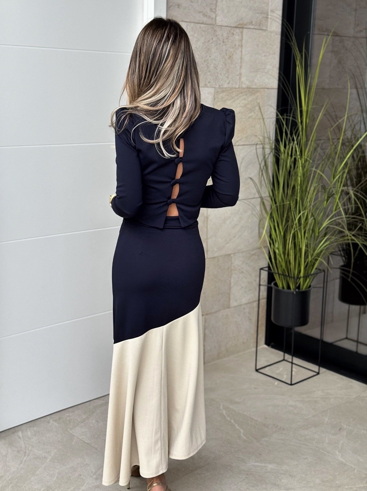 Conjunto top manga larga cuello redondo botones en espalda y falda con goma en cintura capada.
