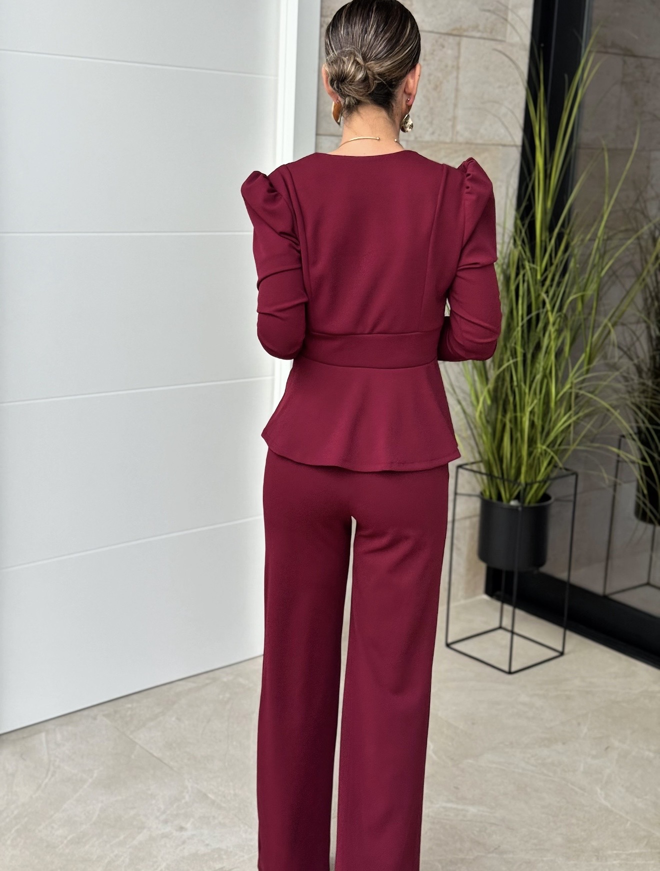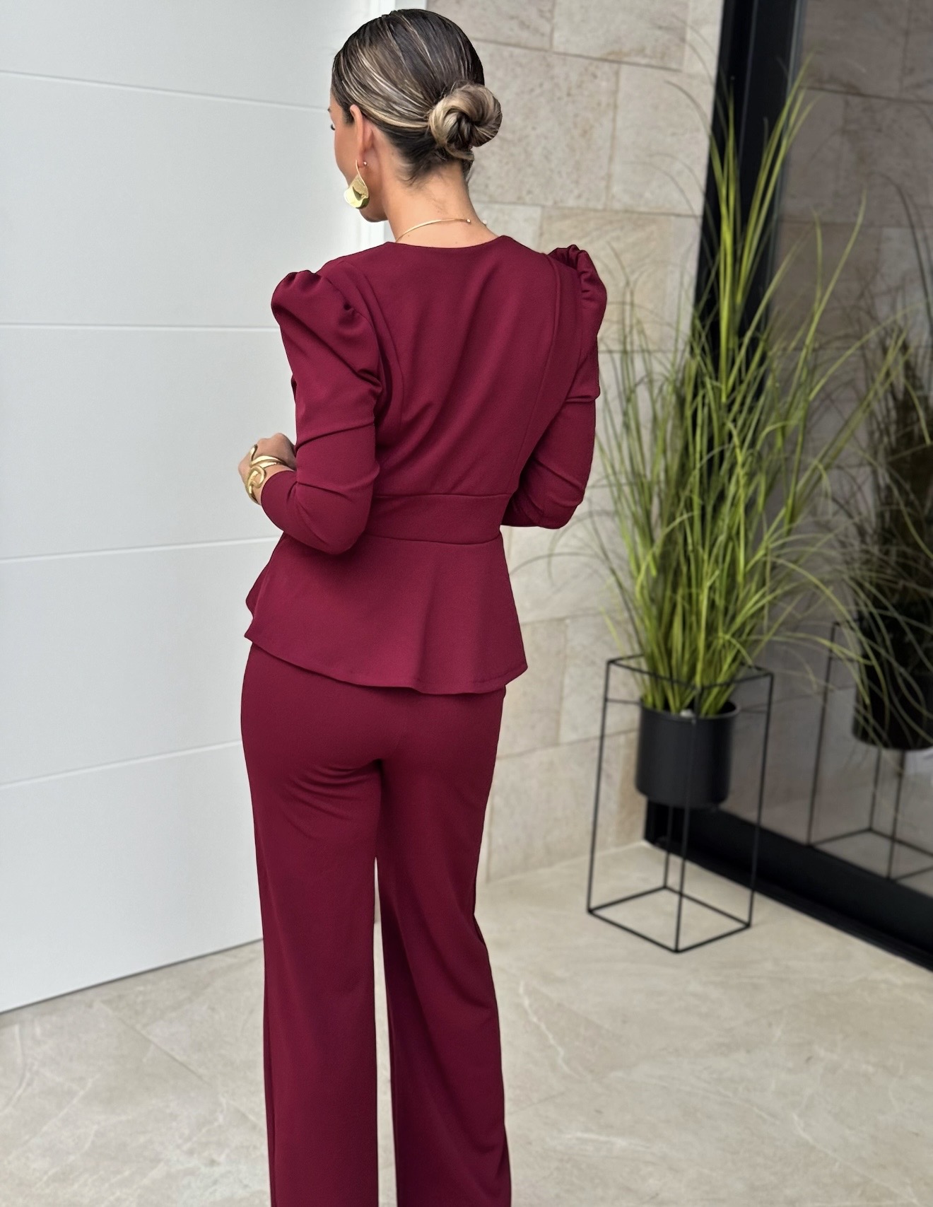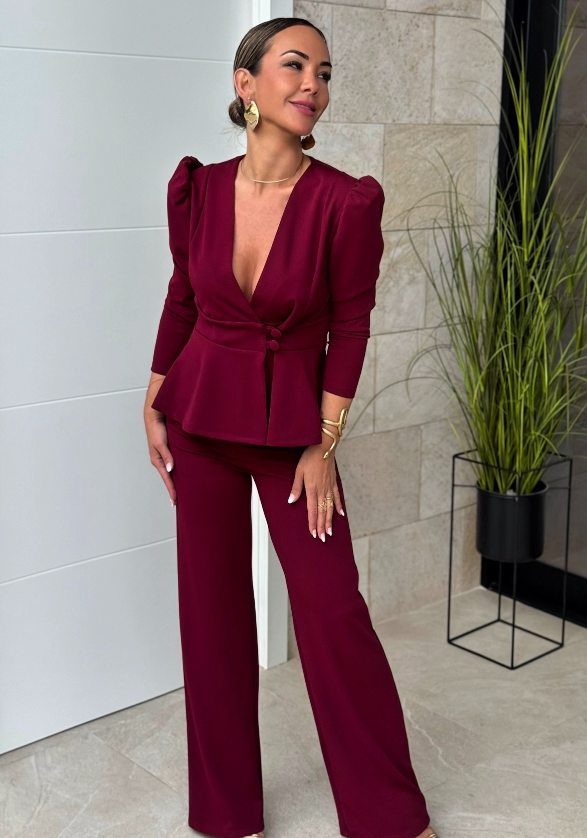 Conjunto Chaqueta cruzada con dos botones y pantalón con goma en cintura recto largo.
