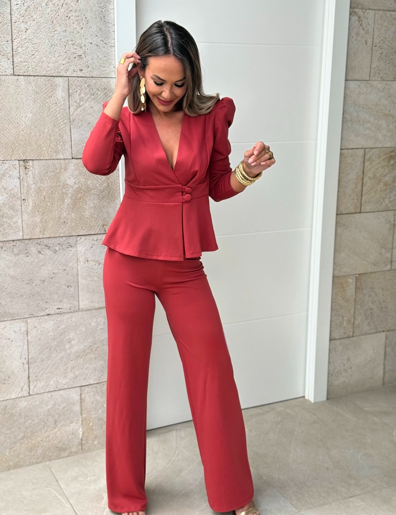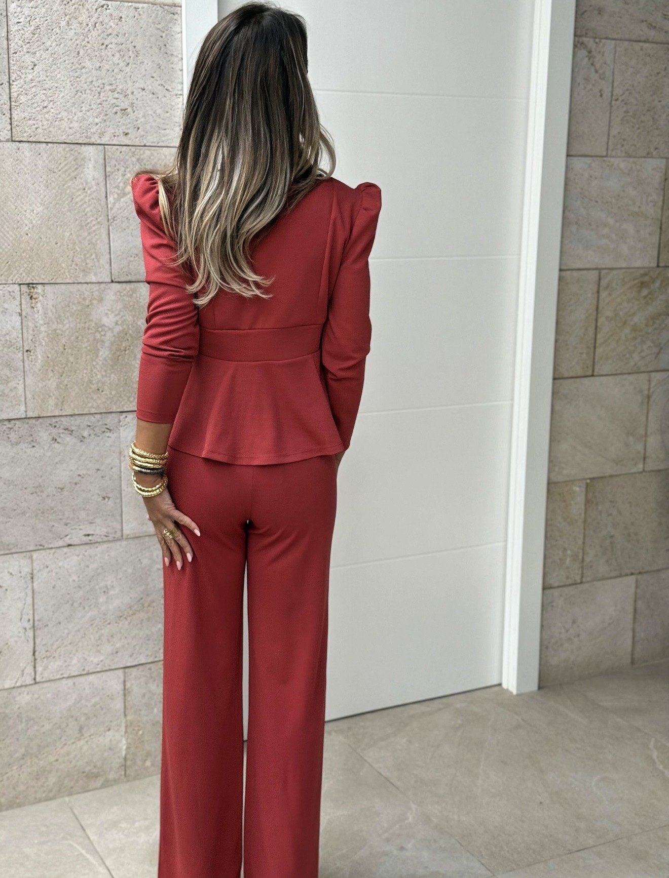 Conjunto Chaqueta cruzada con dos botones y pantalón con goma en cintura recto largo.