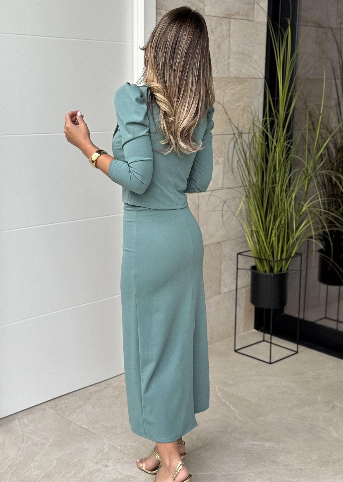 Conjunto falda midi recta con goma en cintura y corte detras, chaqueta manga larga cuello redondo detalle botones delante.