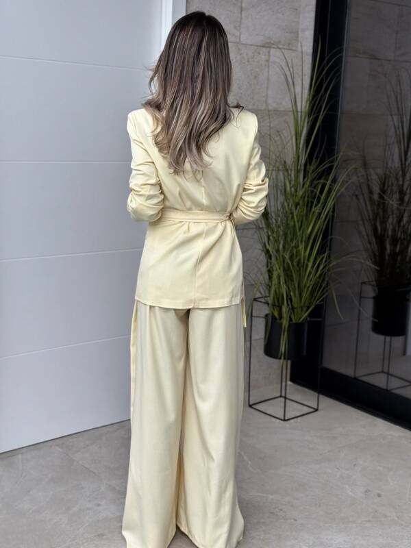 Conjunto calado con ondas de top tirante fino engomado en espalda y cremallera lateral, pantalón con goma en cintura y cremallera recto con forro corto.