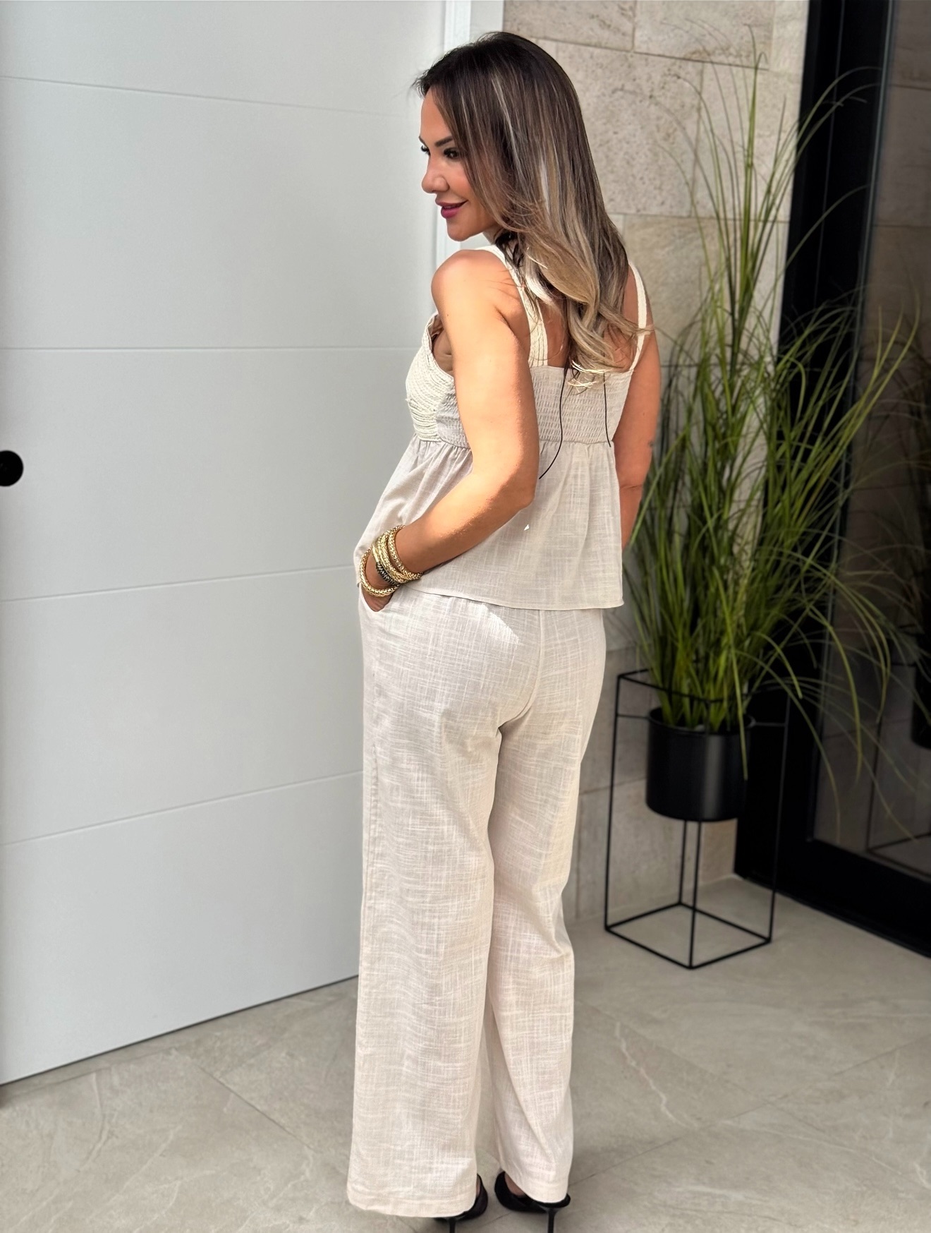 Conjunto top tirante ancho con nido de abaje en espalda y detalle cuerda en pecho, pantalón con goma en cintura recto.
