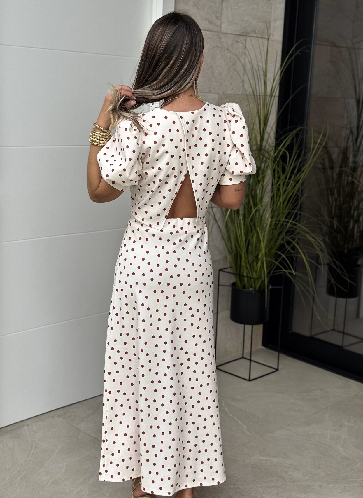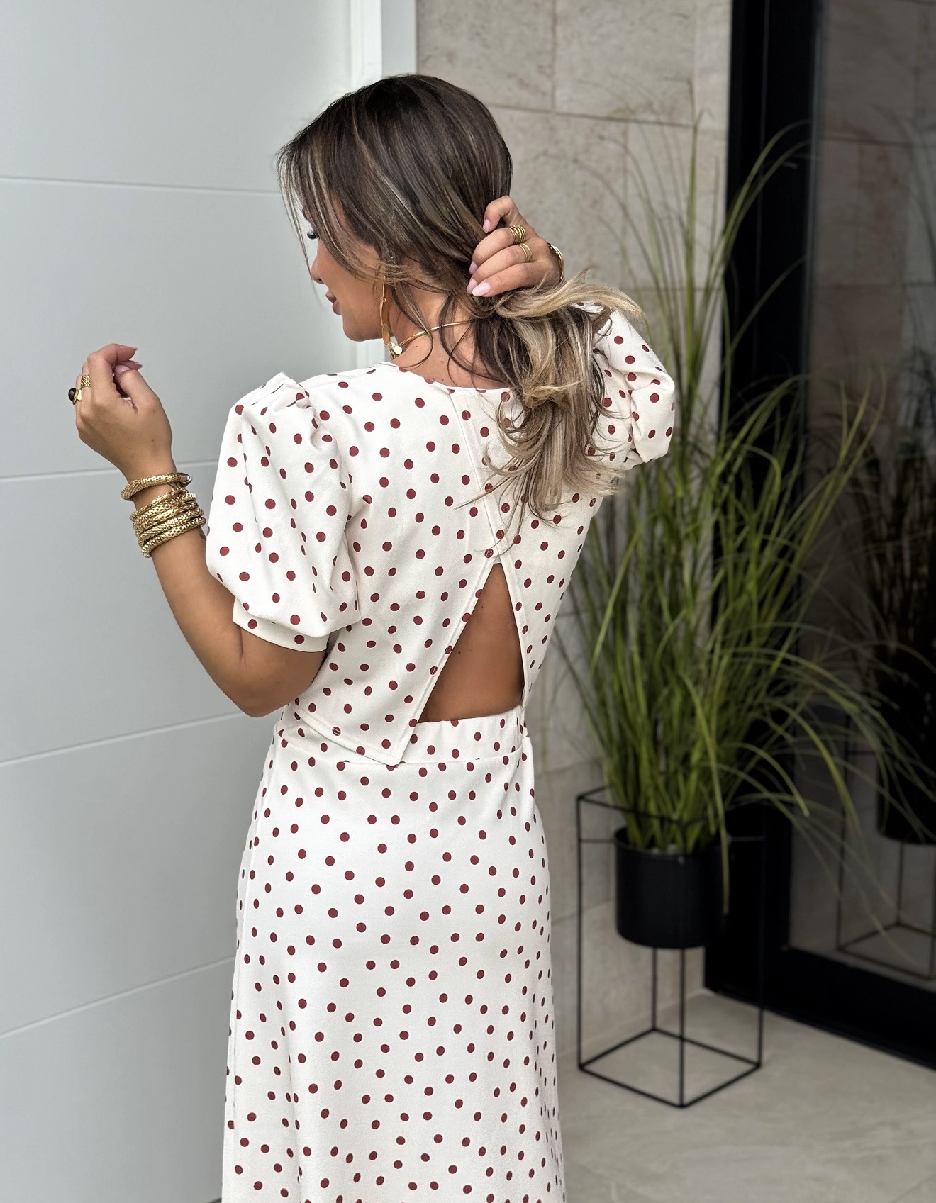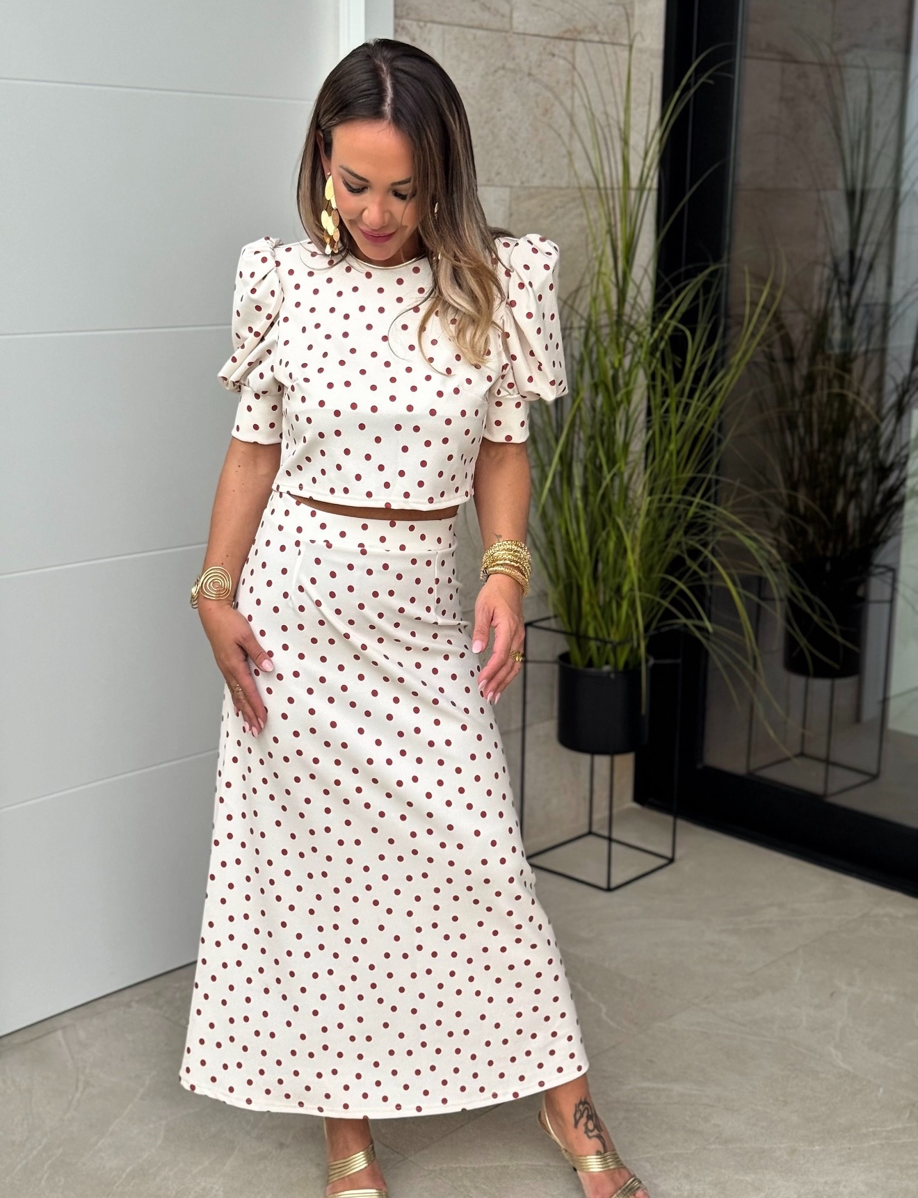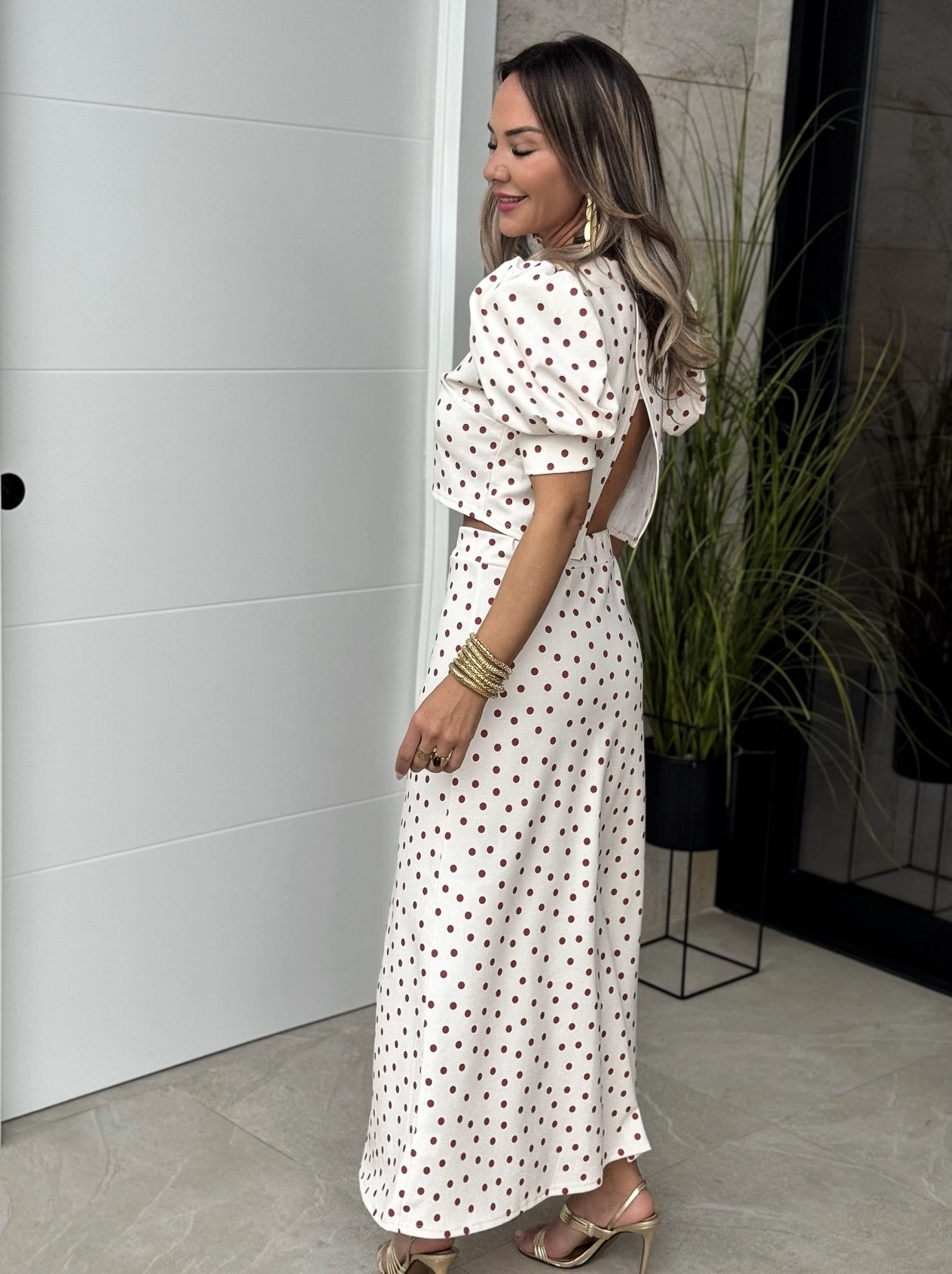 Conjunto Top cuello redondo manga corta con puño espalda cruzada descubierta, falda con goma en cintura corte evasé.