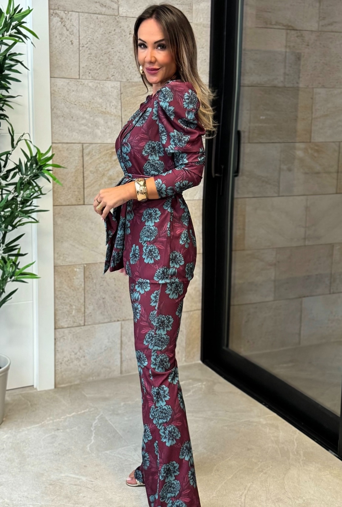Conjunto Fajín Estampado Flor Vino Turquesa