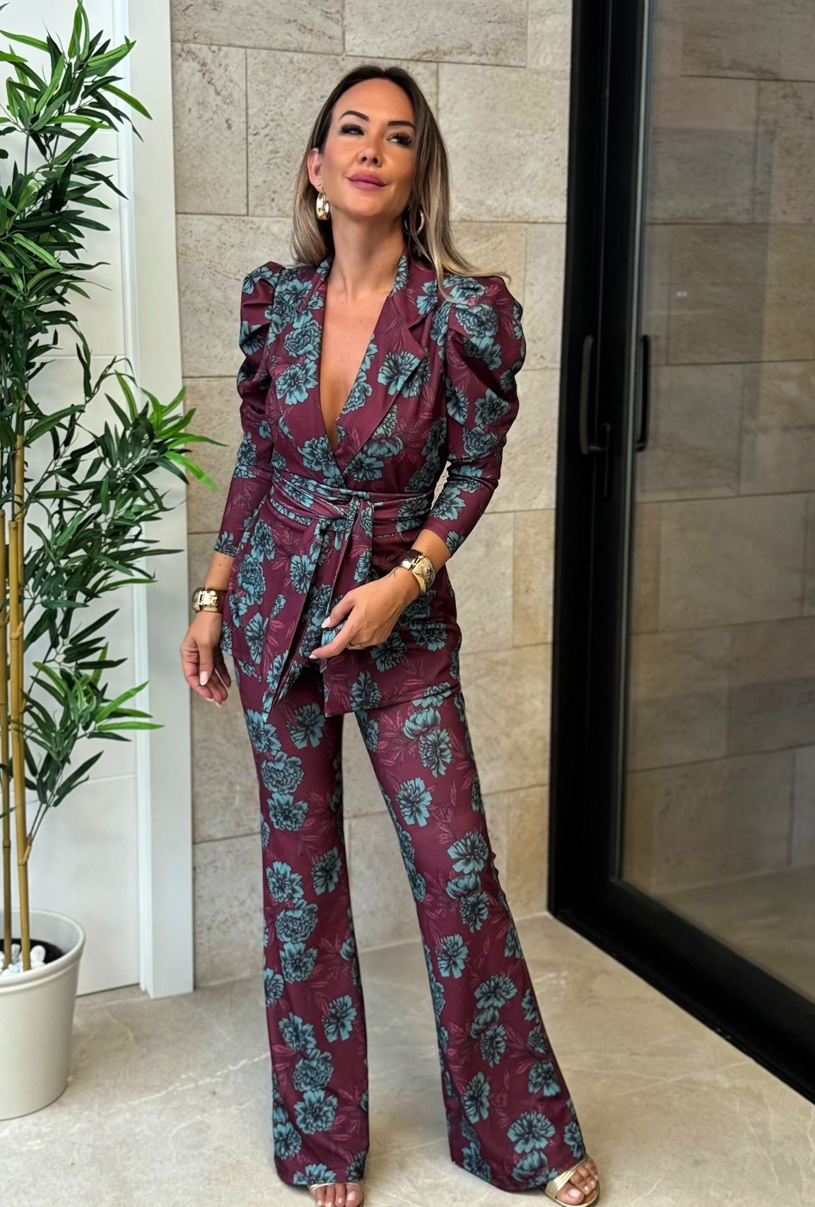 Conjunto chaqueta cruzada con fajín y manga larga abullonada, pantalón con goma tipo leggins y bajo campana.