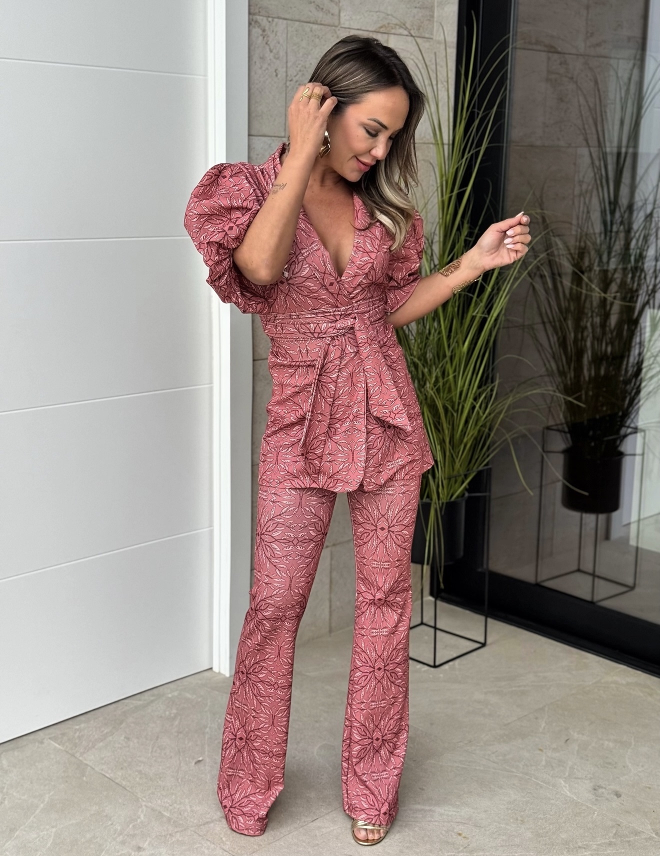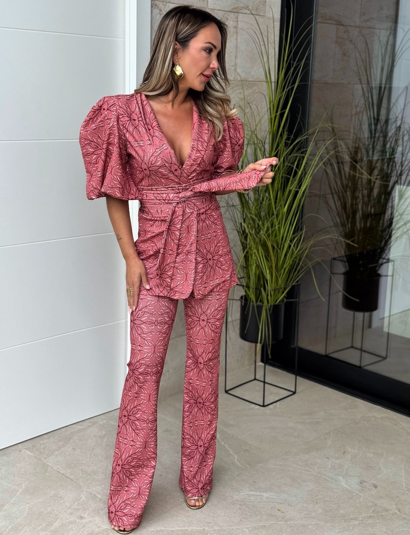 Conjunto chaqueta cruzada con fajín y manga larga abullonada, pantalón con goma tipo leggins y bajo campana.