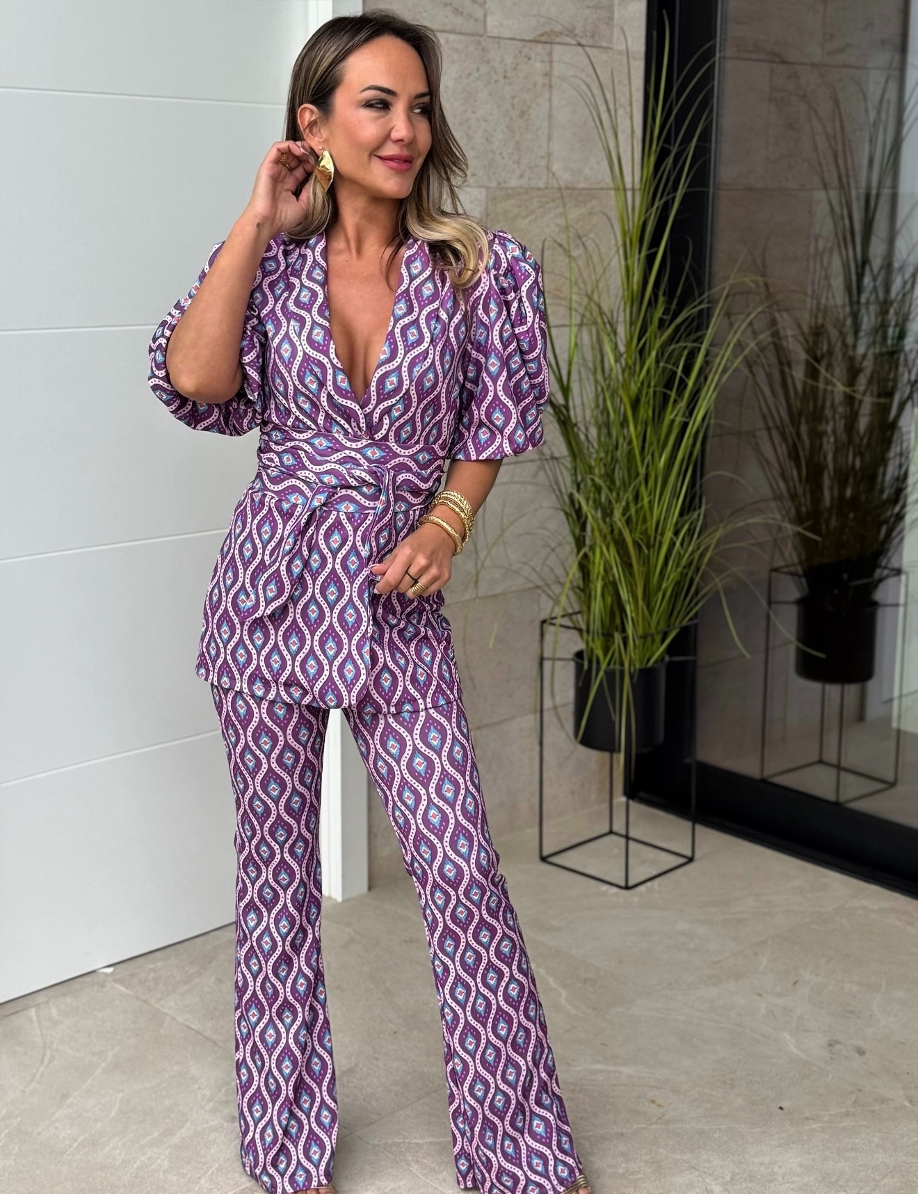 Conjunto chaqueta cruzada con fajín y manga larga abullonada, pantalón con goma tipo leggins y bajo campana.