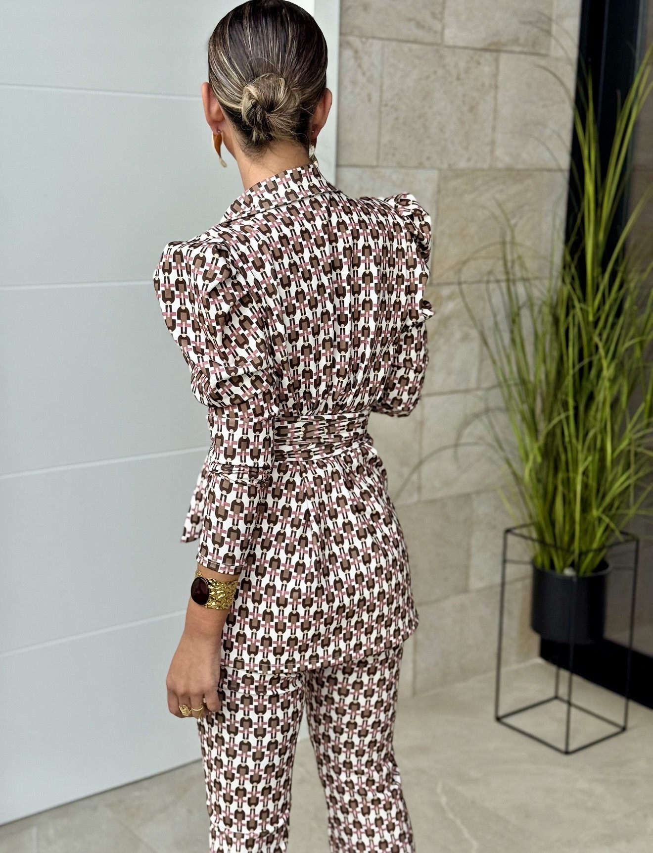 Conjunto chaqueta cruzada con fajín y manga larga abullonada, pantalón con goma tipo leggins y bajo campana.