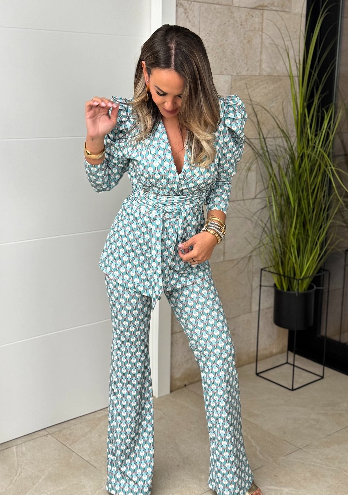 Conjunto chaqueta cruzada con fajín y manga larga abullonada, pantalón con goma tipo leggins y bajo campana.