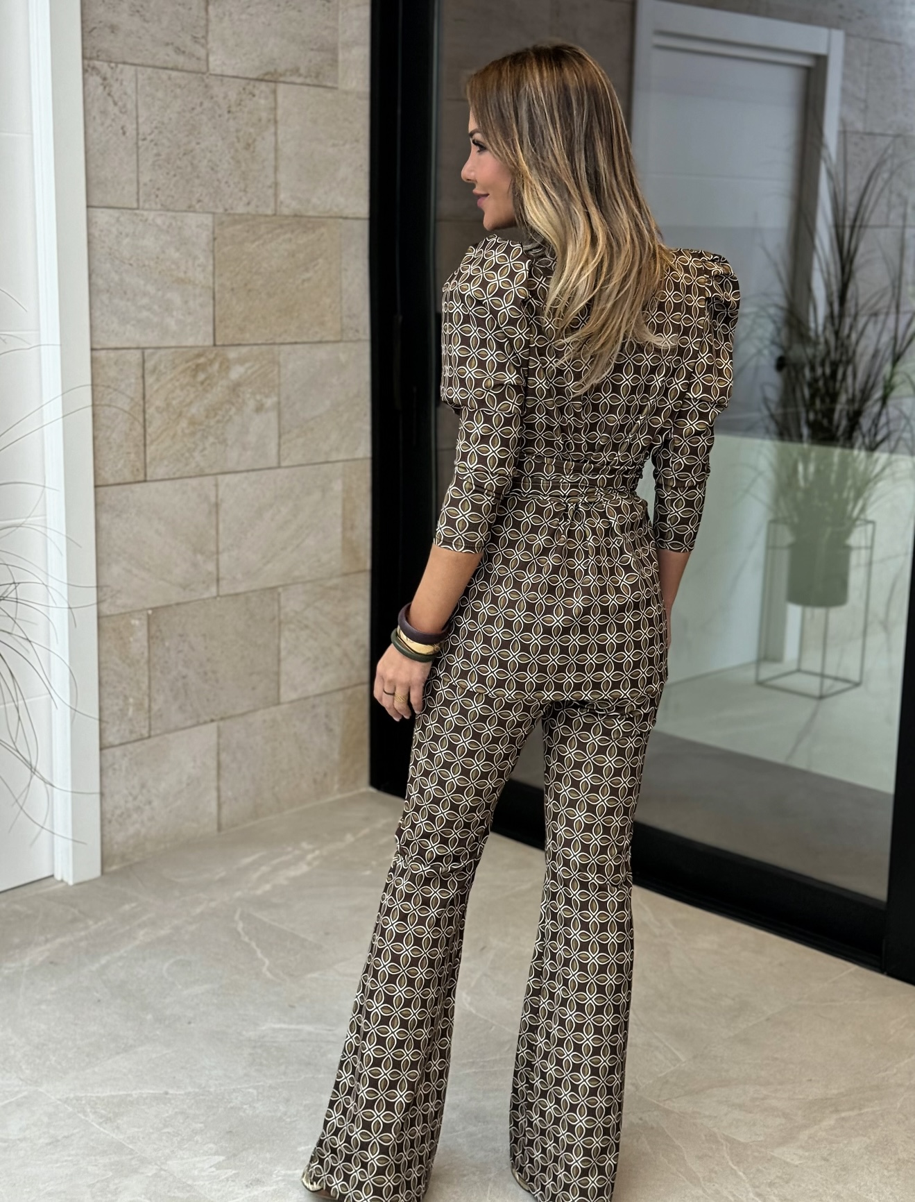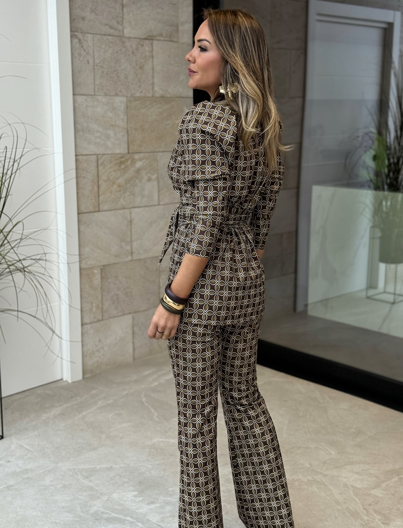 Conjunto chaqueta cruzada con fajín y manga larga abullonada, pantalón con goma tipo leggins y bajo campana.