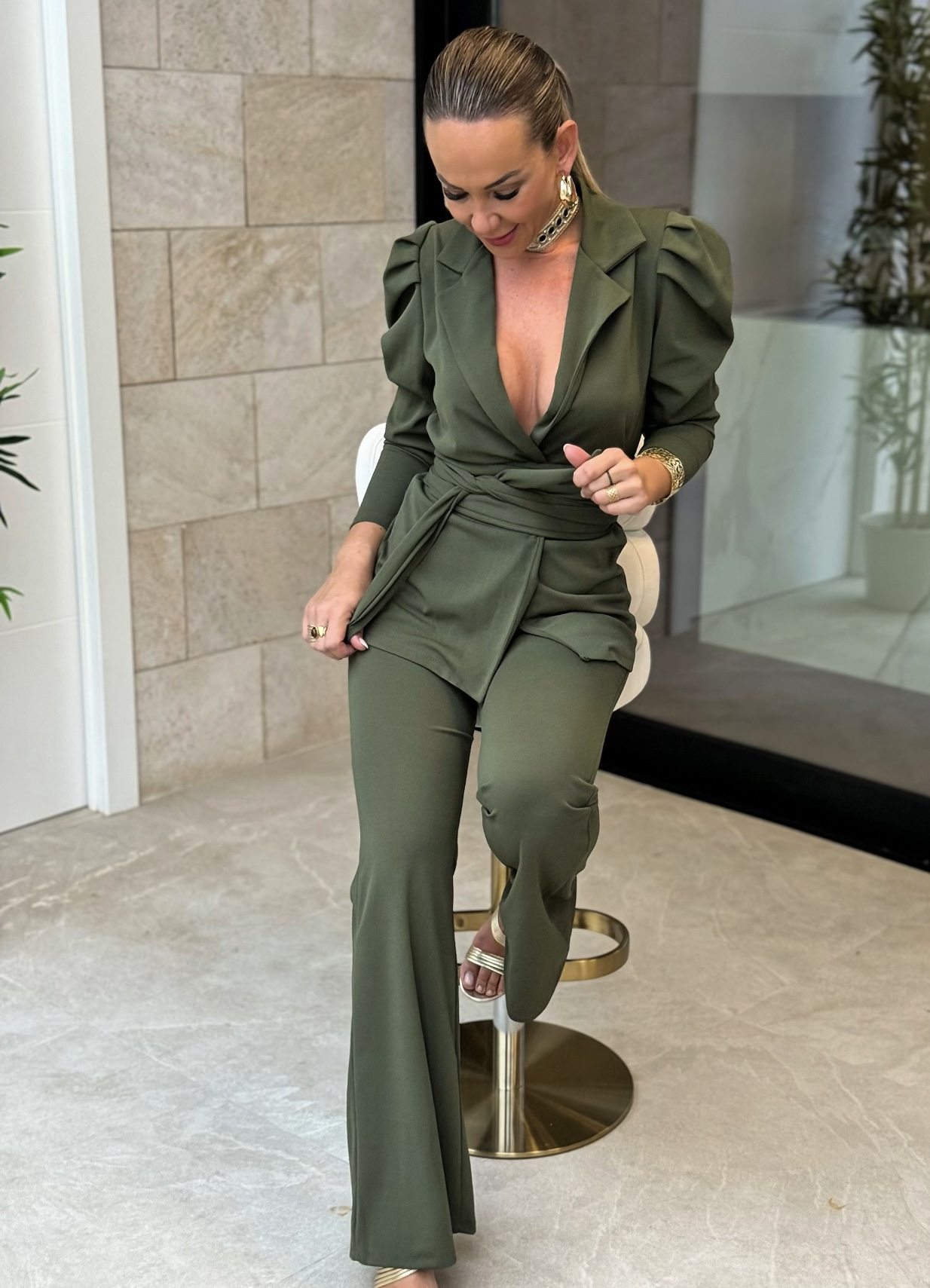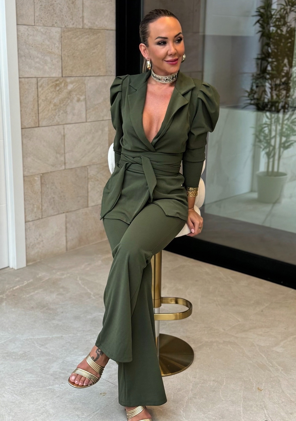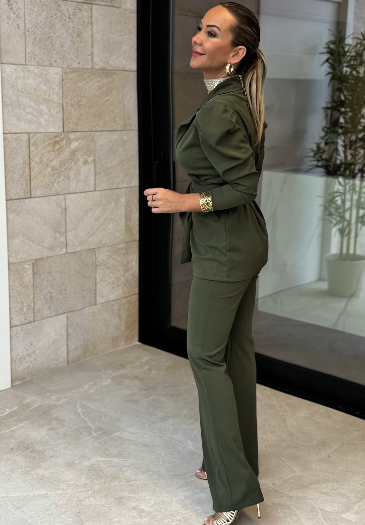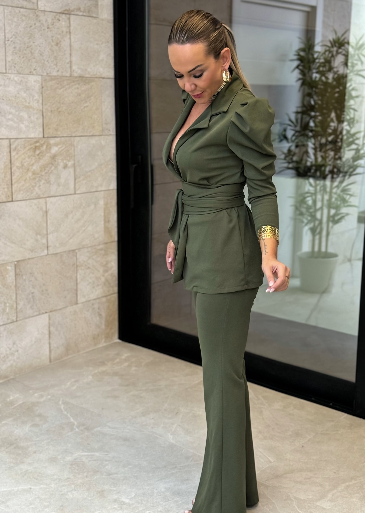 Conjunto chaqueta cruzada con fajín y manga larga abullonada, pantalón con goma tipo leggins y bajo campana.