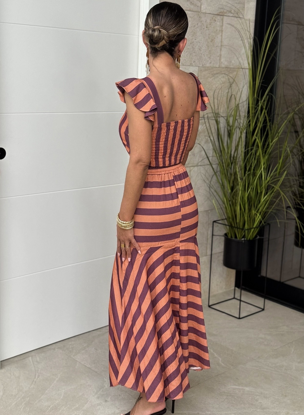 Conjunto top con tirante ancho y volatito con nido de abeja en espalda y falda corte sirena larga con goma en cintura detrás.