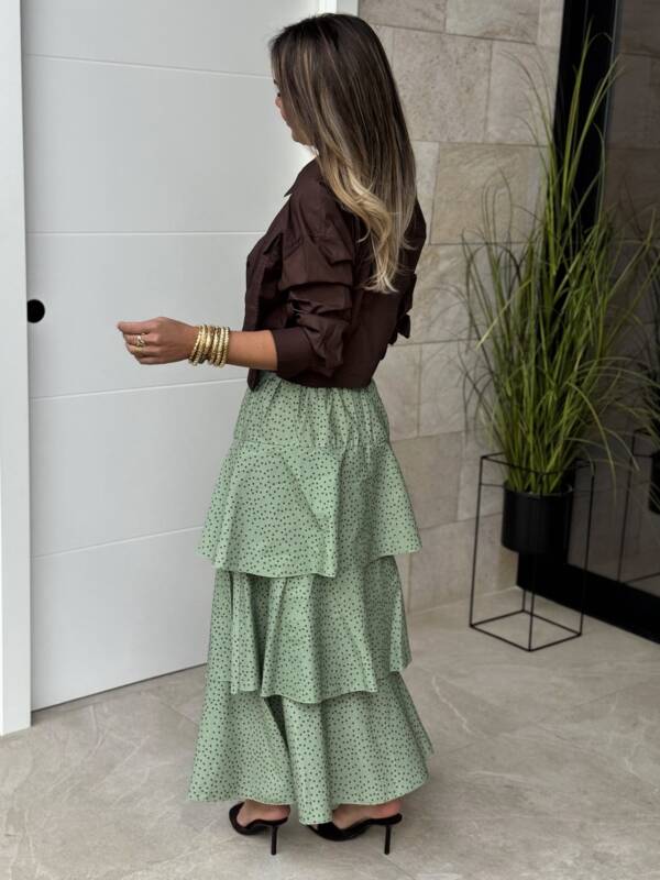 Conjunto pantalon con goma en cintura, boton y cremallera, camisa manga larga con botones, detalle flores caladas.