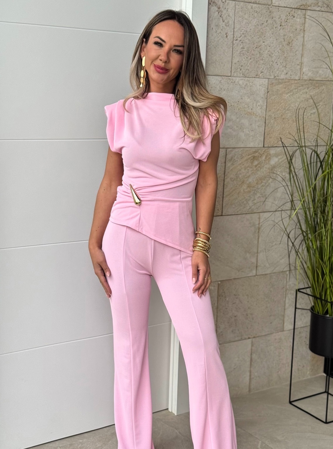 Conjunto top sin mangas con hombreras fruncido en lado con detalle gota dorada y pantalón con goma en cintura tipo legging.