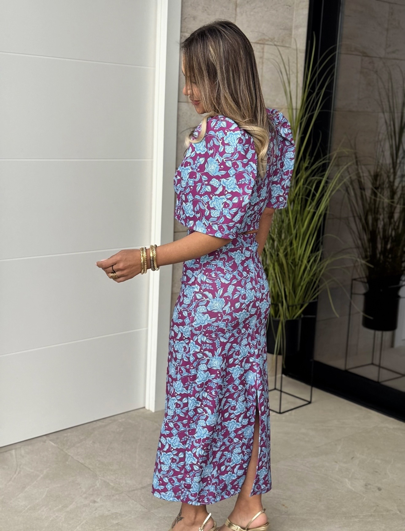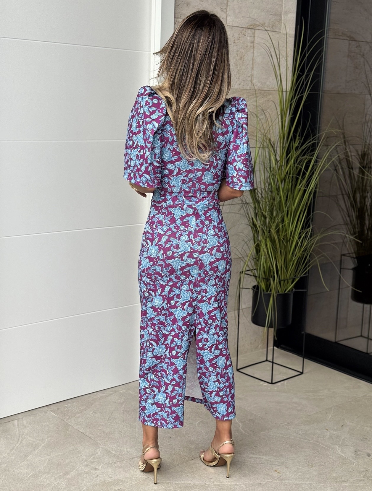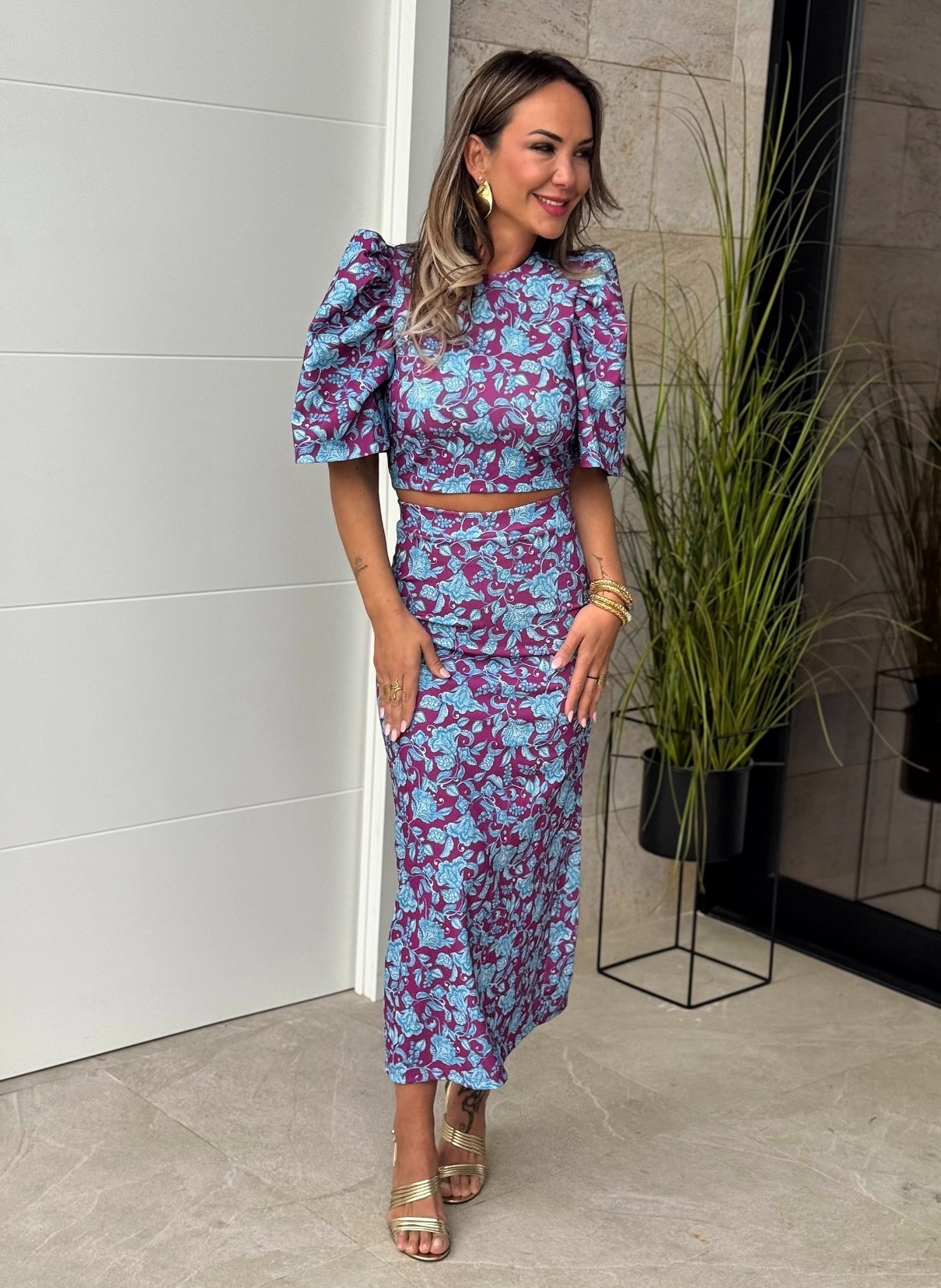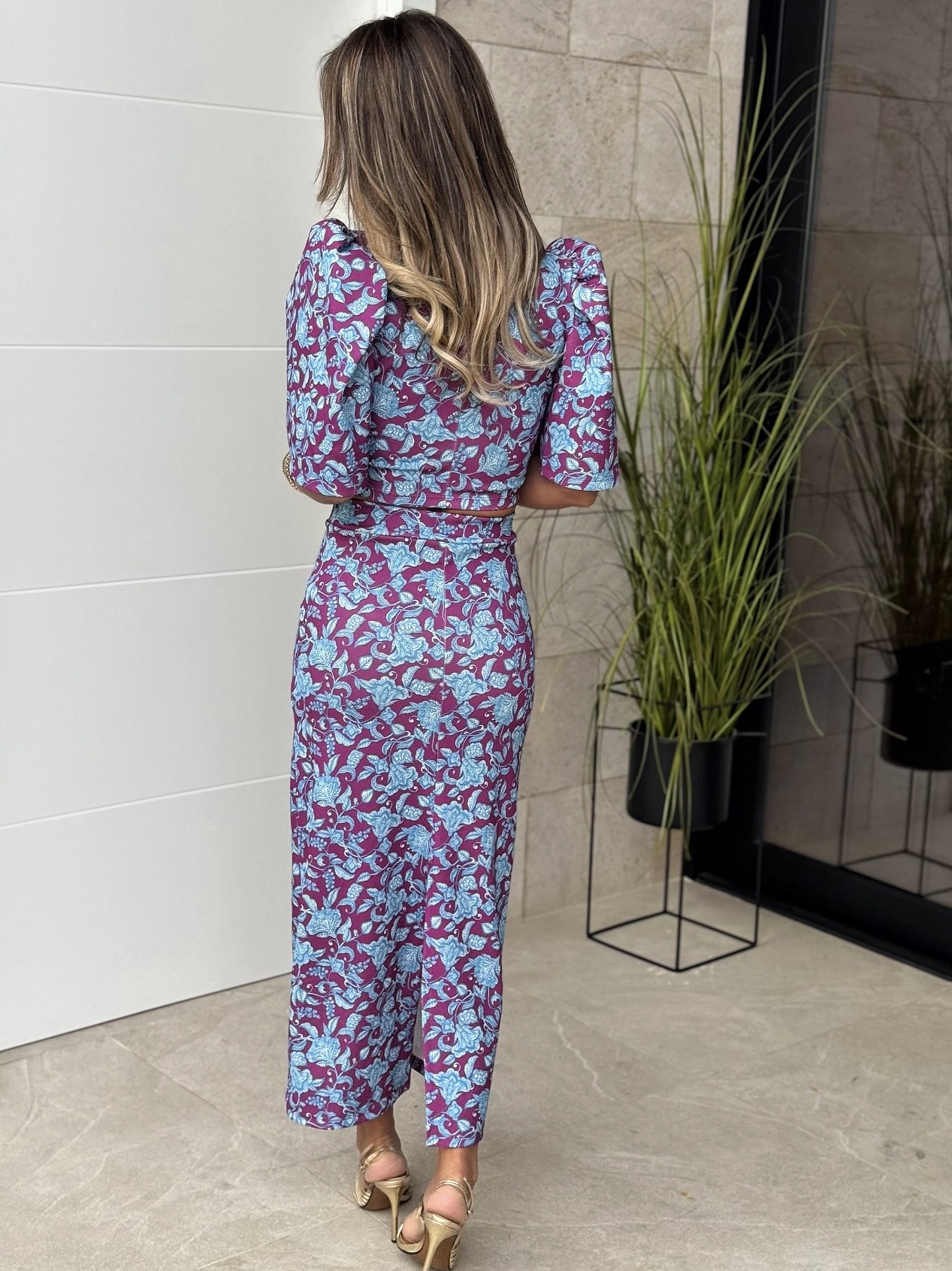 Conjunto Top cuello redondo manga campana y botón detrás, falda tubo recta con goma en cintura y corte detras.