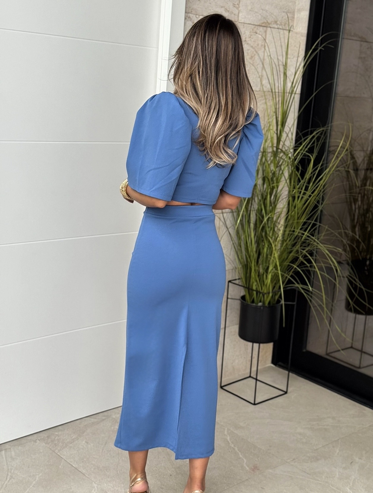 Conjunto Top cuello redondo manga campana y botón detrás, falda tubo recta con goma en cintura y corte detrás.