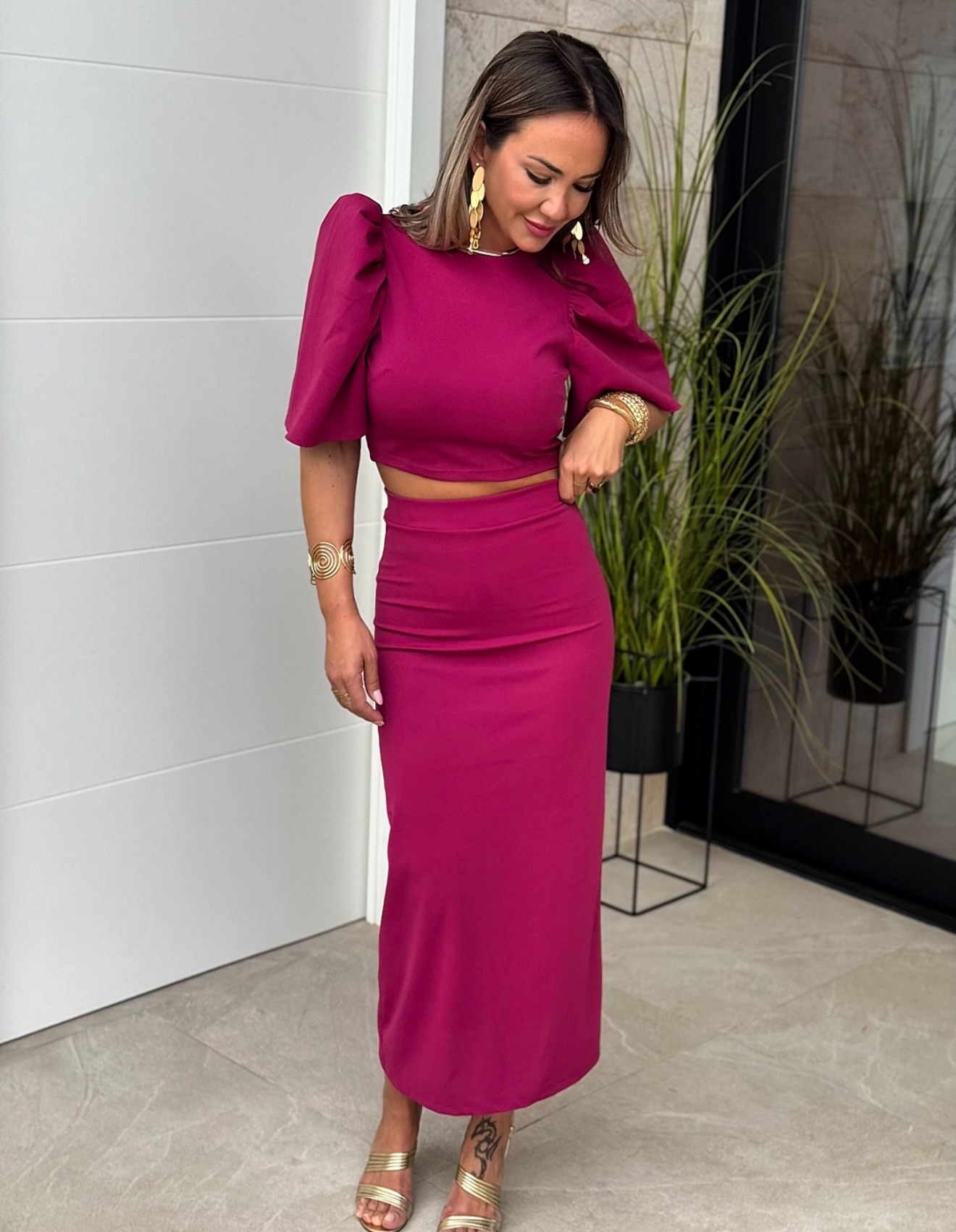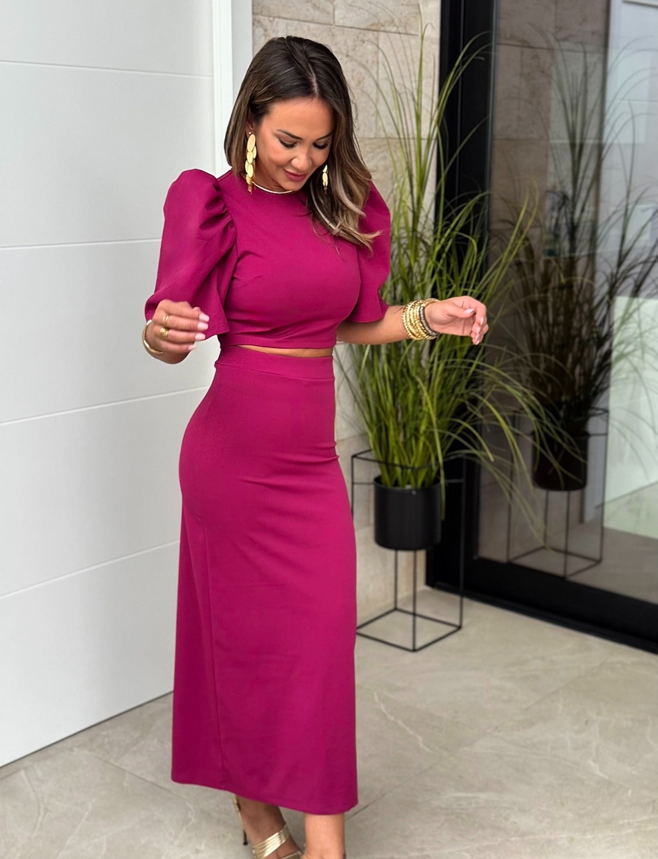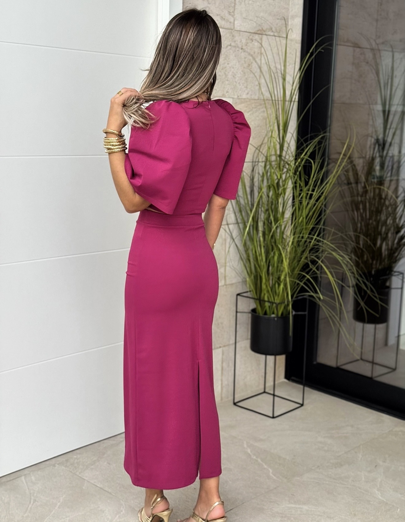 Conjunto Top cuello redondo manga campana y botón detrás, falda tubo recta con goma en cintura y corte detrás.