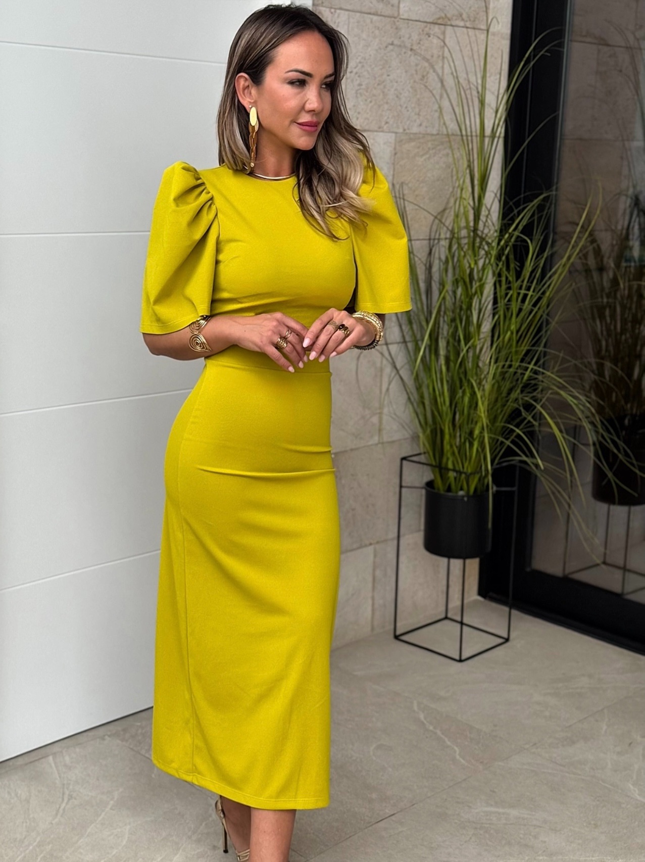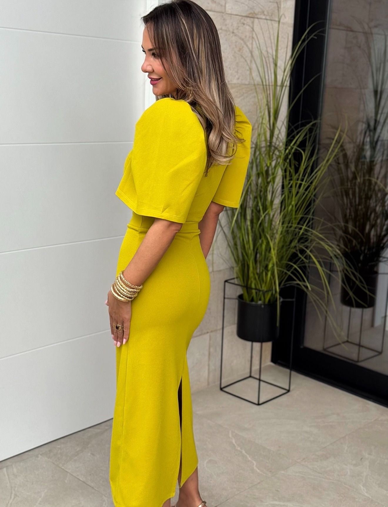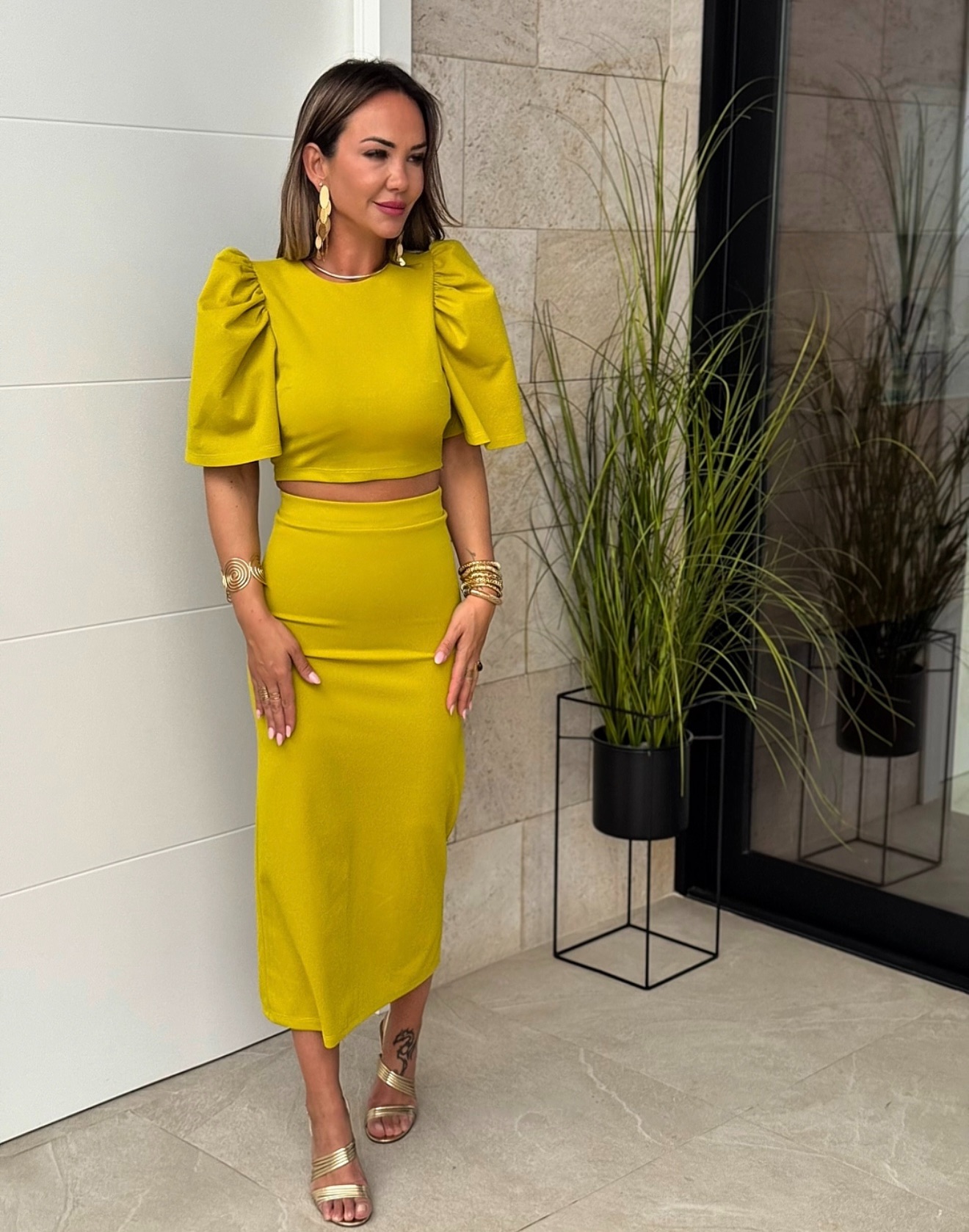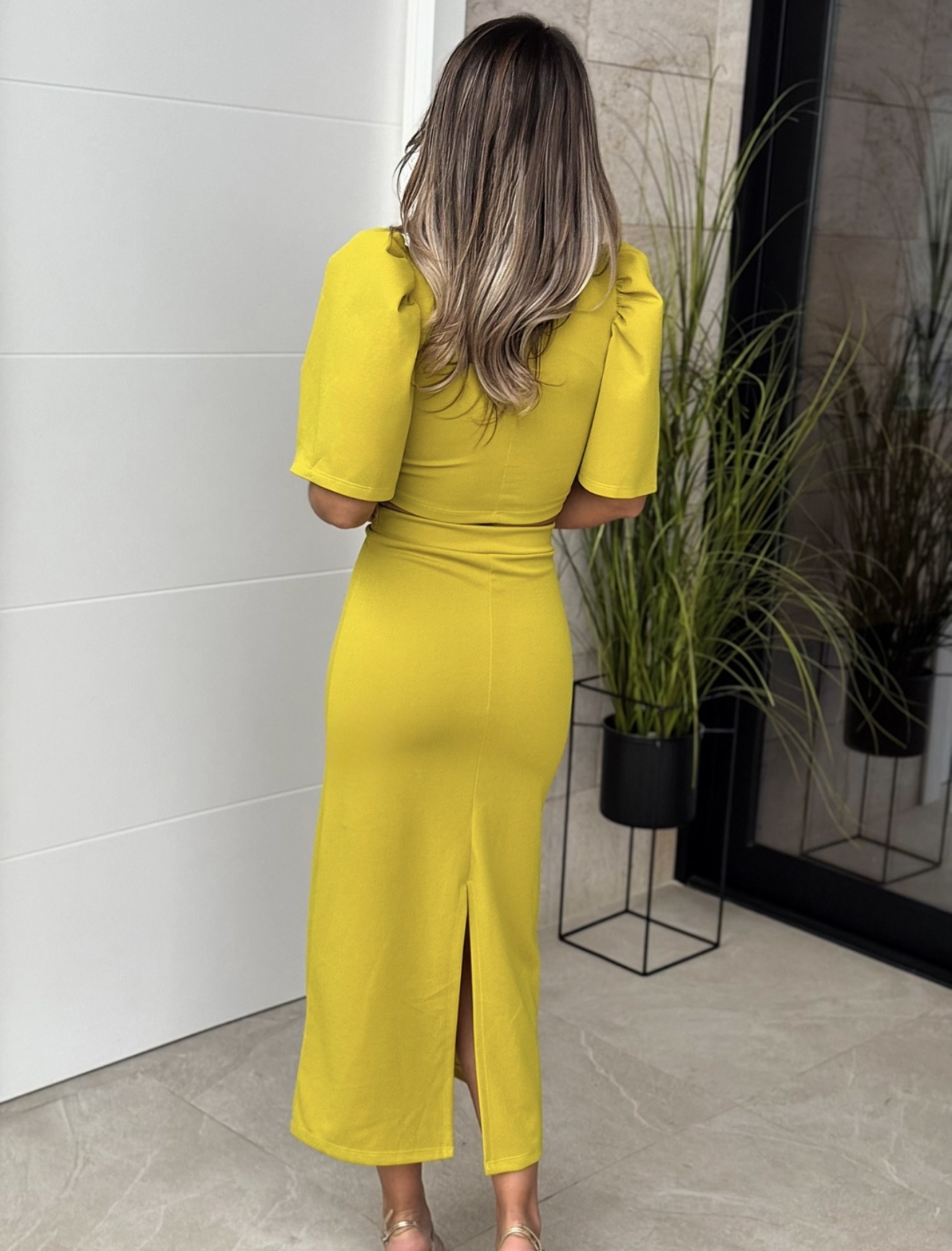 Conjunto Top cuello redondo manga campana y botón detrás, falda tubo recta con goma en cintura y corte detrás.