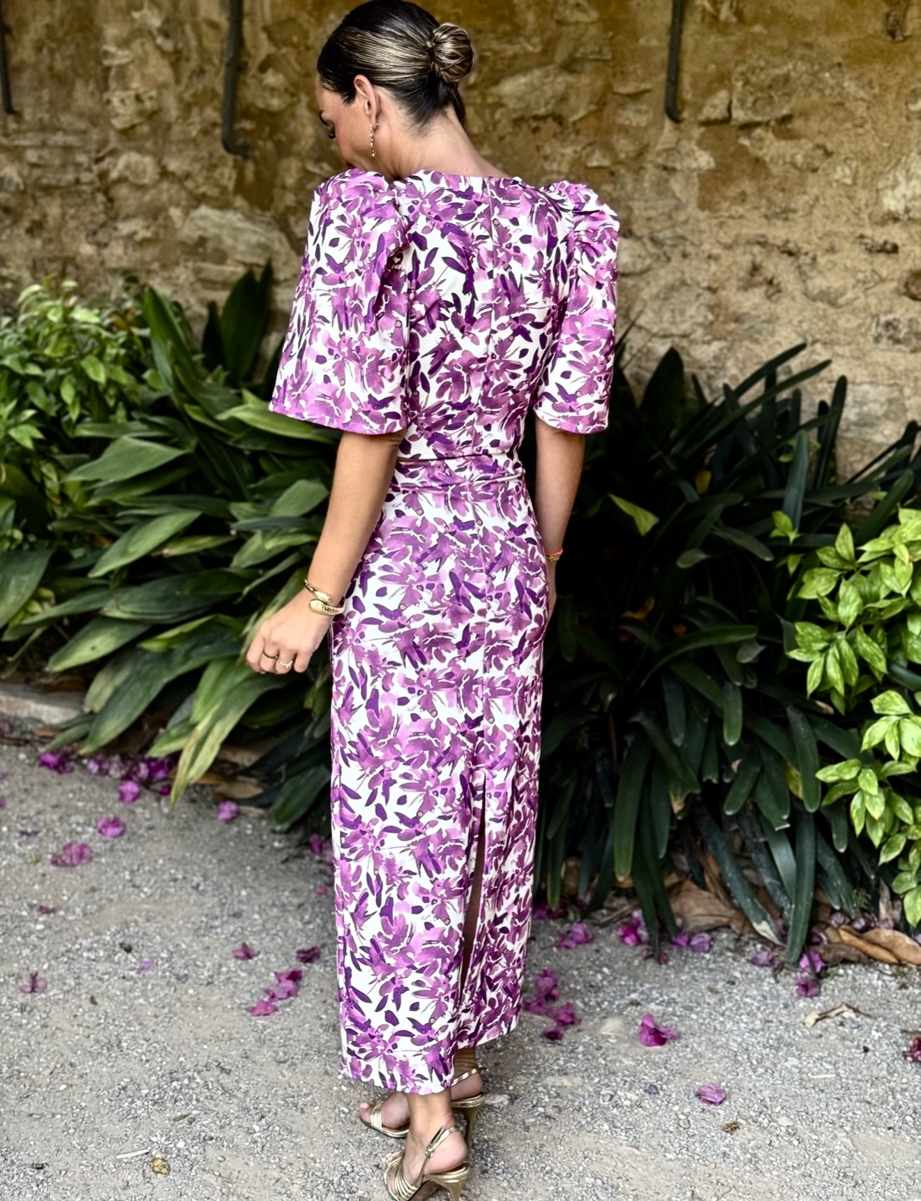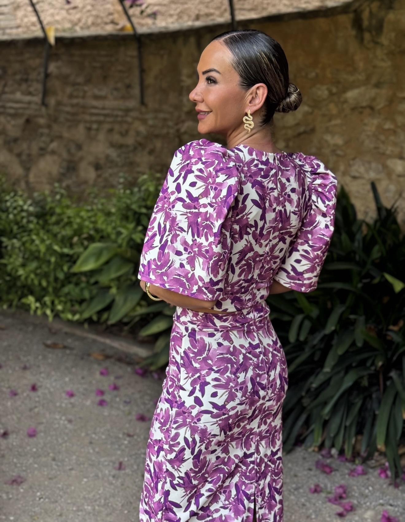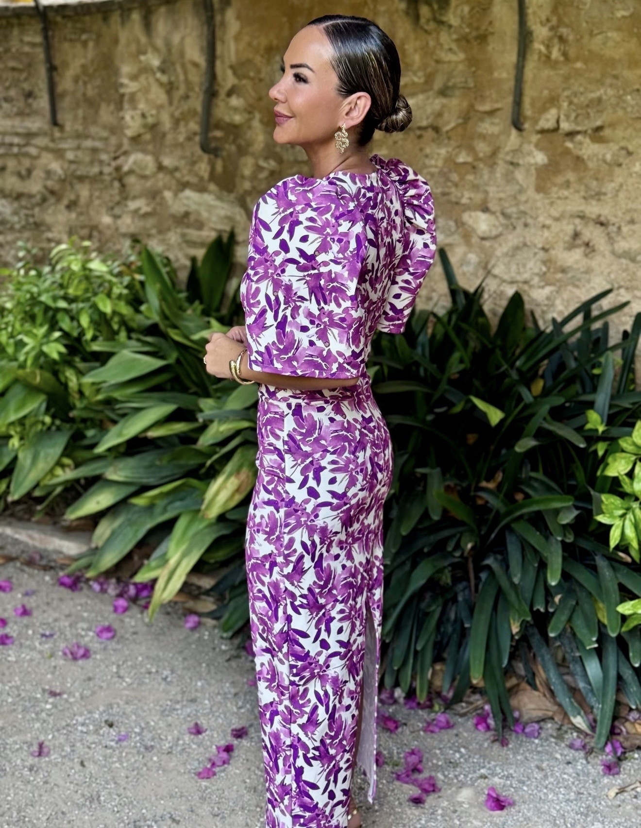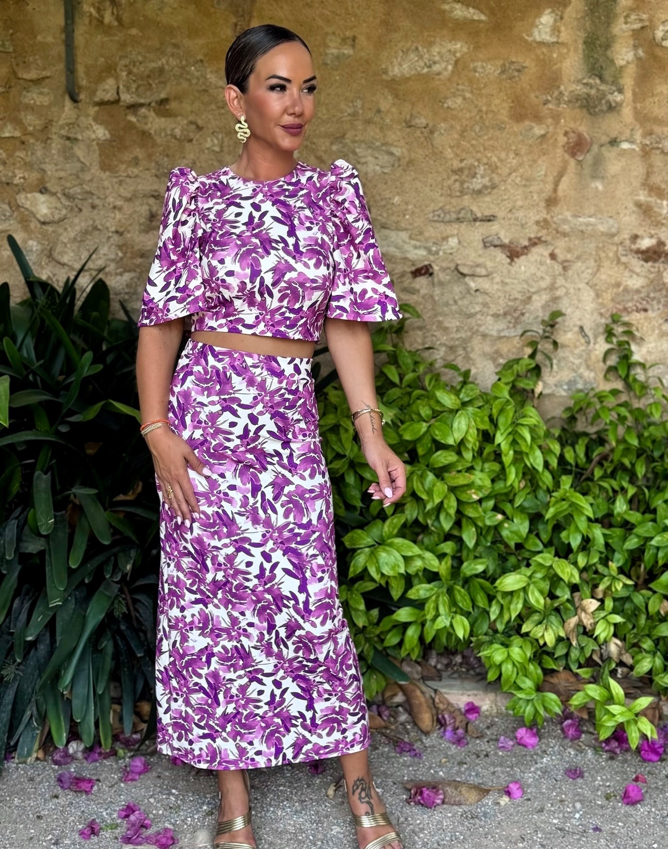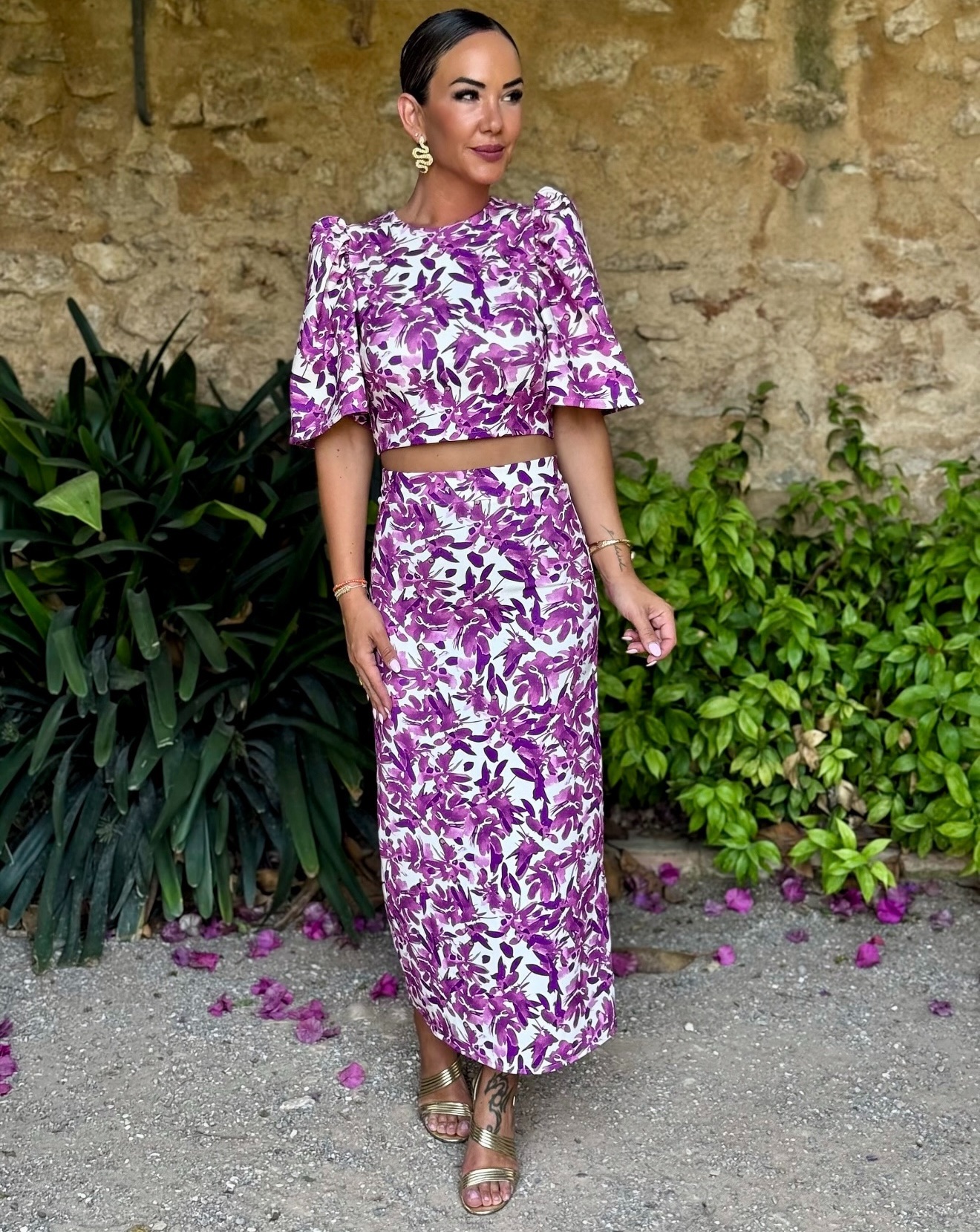 Conjunto Top cuello redondo manga campana y botón detrás, falda tubo recta con goma en cintura y corte detrás.