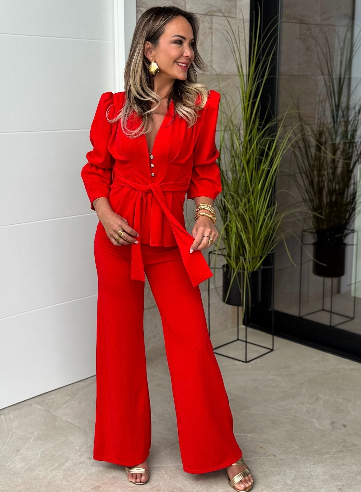 Conjunto chaqueta manga engomada escote pico con detalle botones y cinturón, pantalón recto con goma en cintura.