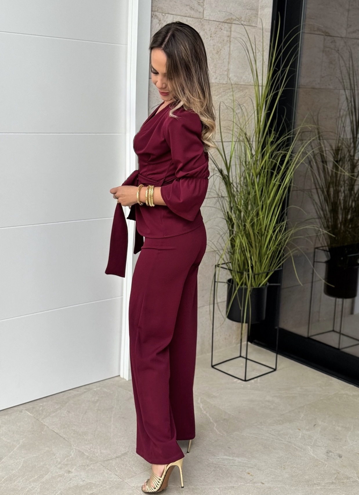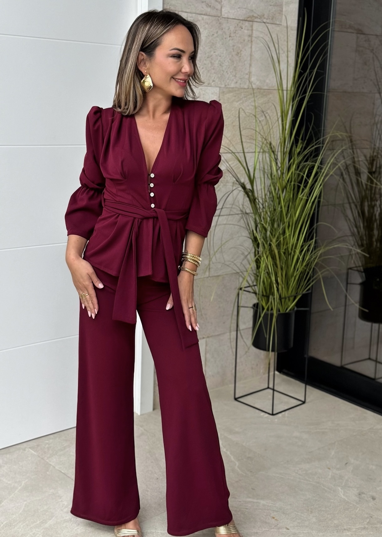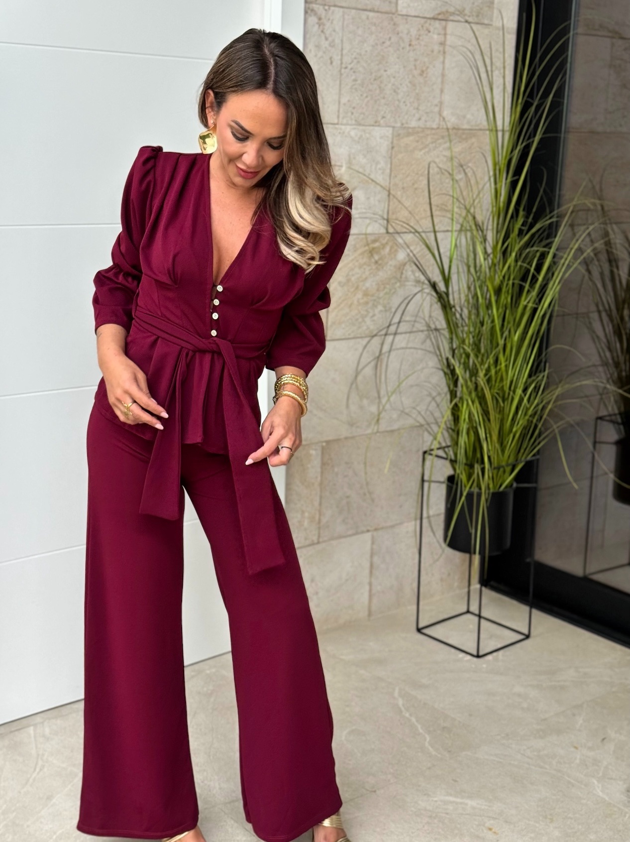 Conjunto chaqueta manga engomada escote pico con detalle botones y cinturón, pantalón recto con goma en cintura.