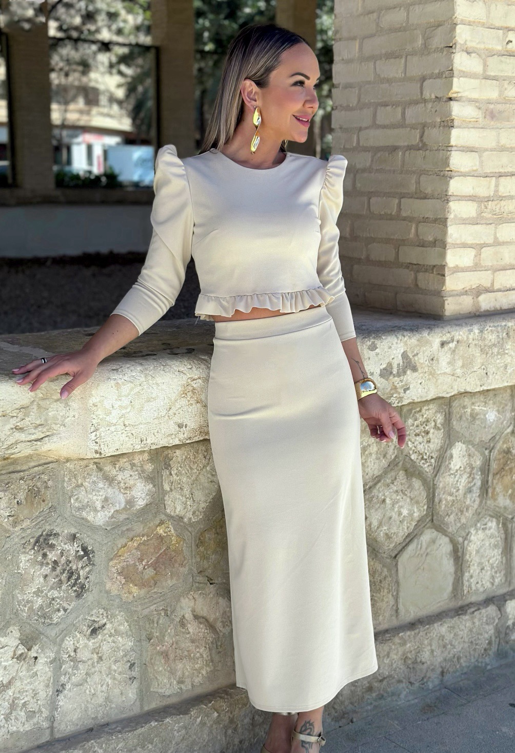 Conjunto falda midi con goma en cintura y corte detrás, top manga larga con volante en cintura y botones en espalda.