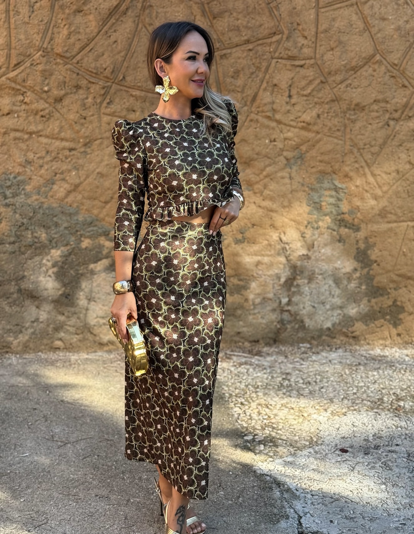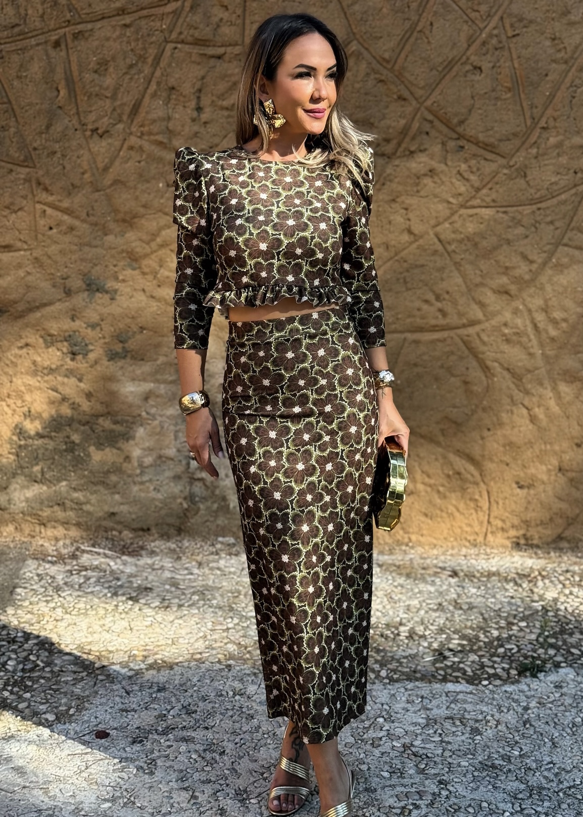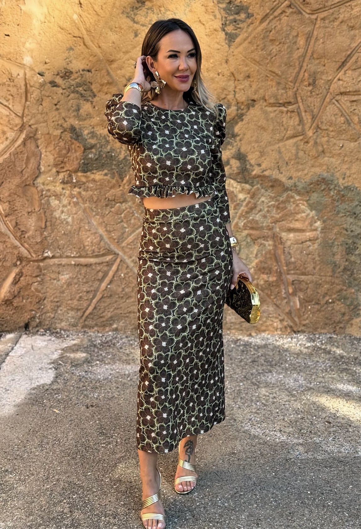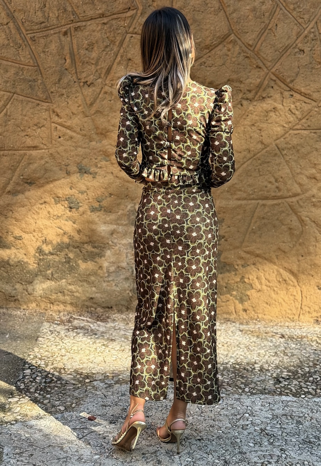 Conjunto falda midi con goma en cintura y corte detrás, top manga larga con volante en cintura y botones en espalda.