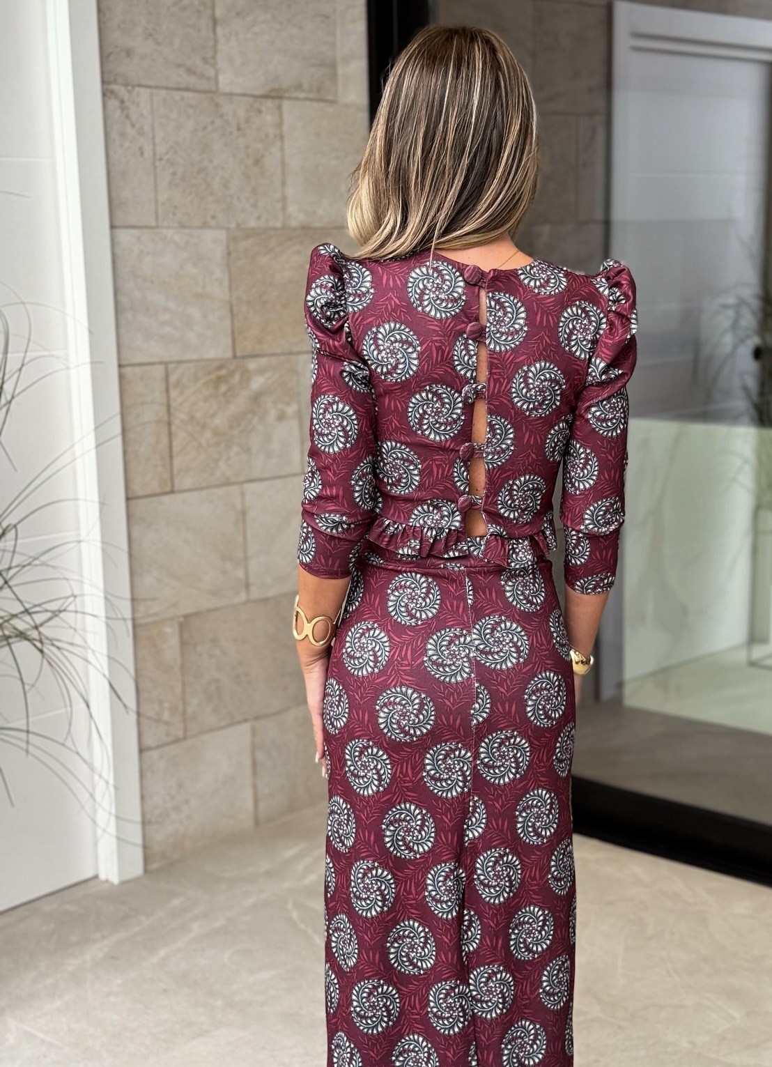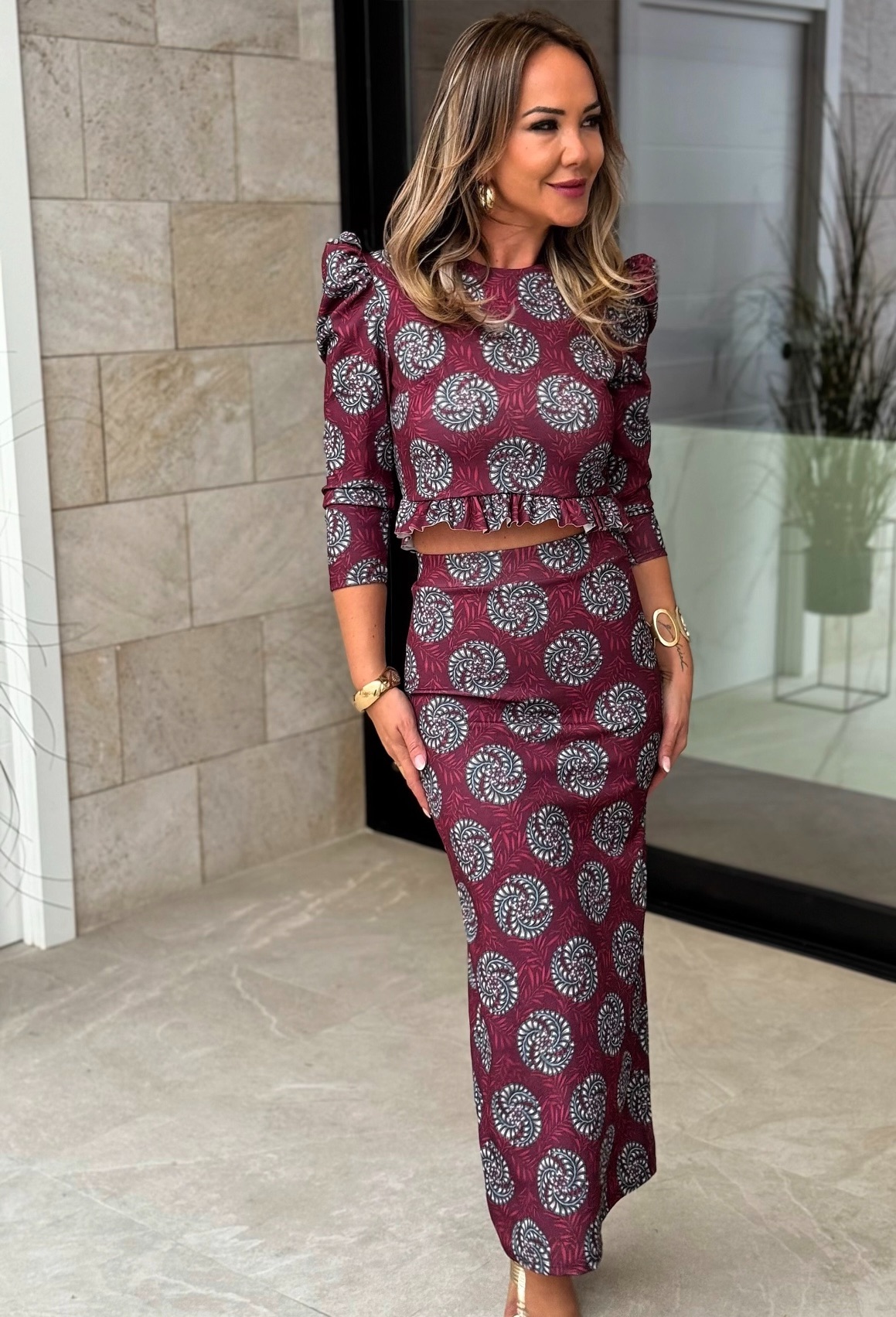 Conjunto falda midi con goma en cintura y corte detrás, top manga larga con volante en cintura y botones en espalda.