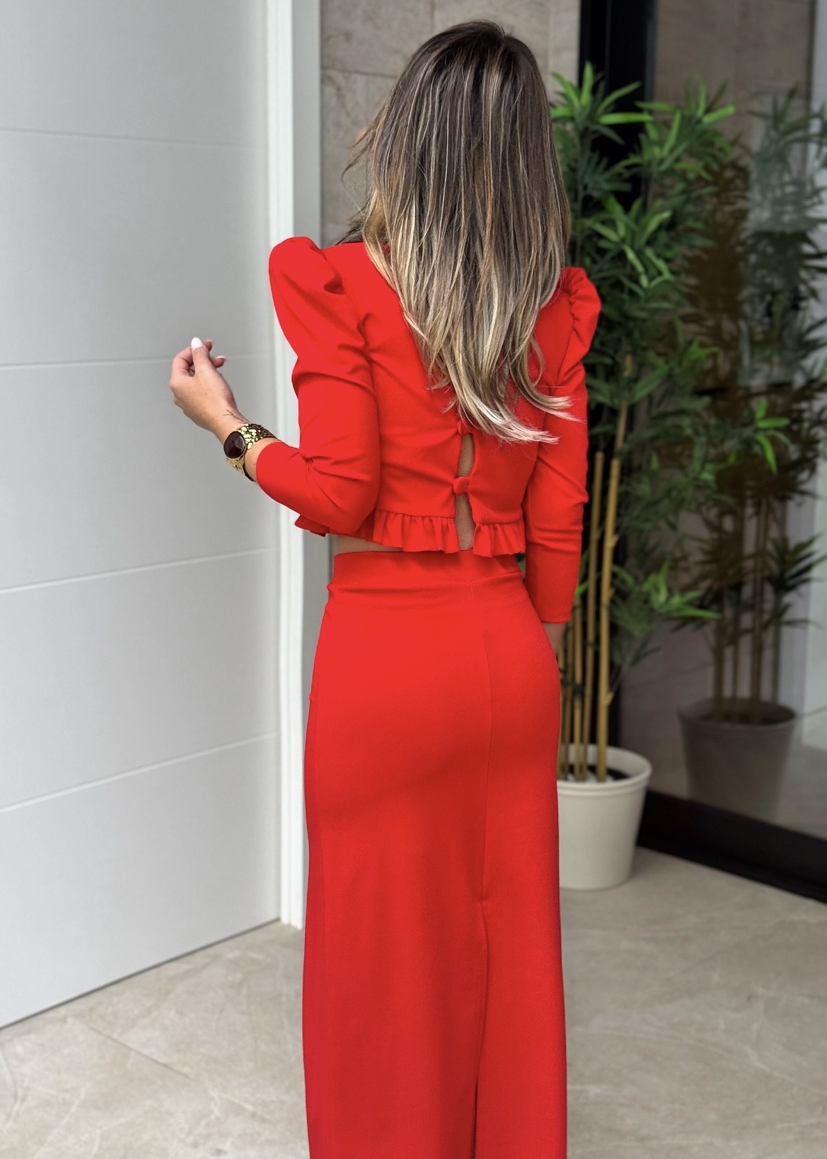 Conjunto falda midi con goma en cintura y corte detrás, top manga larga con volante en cintura y botones en espalda.