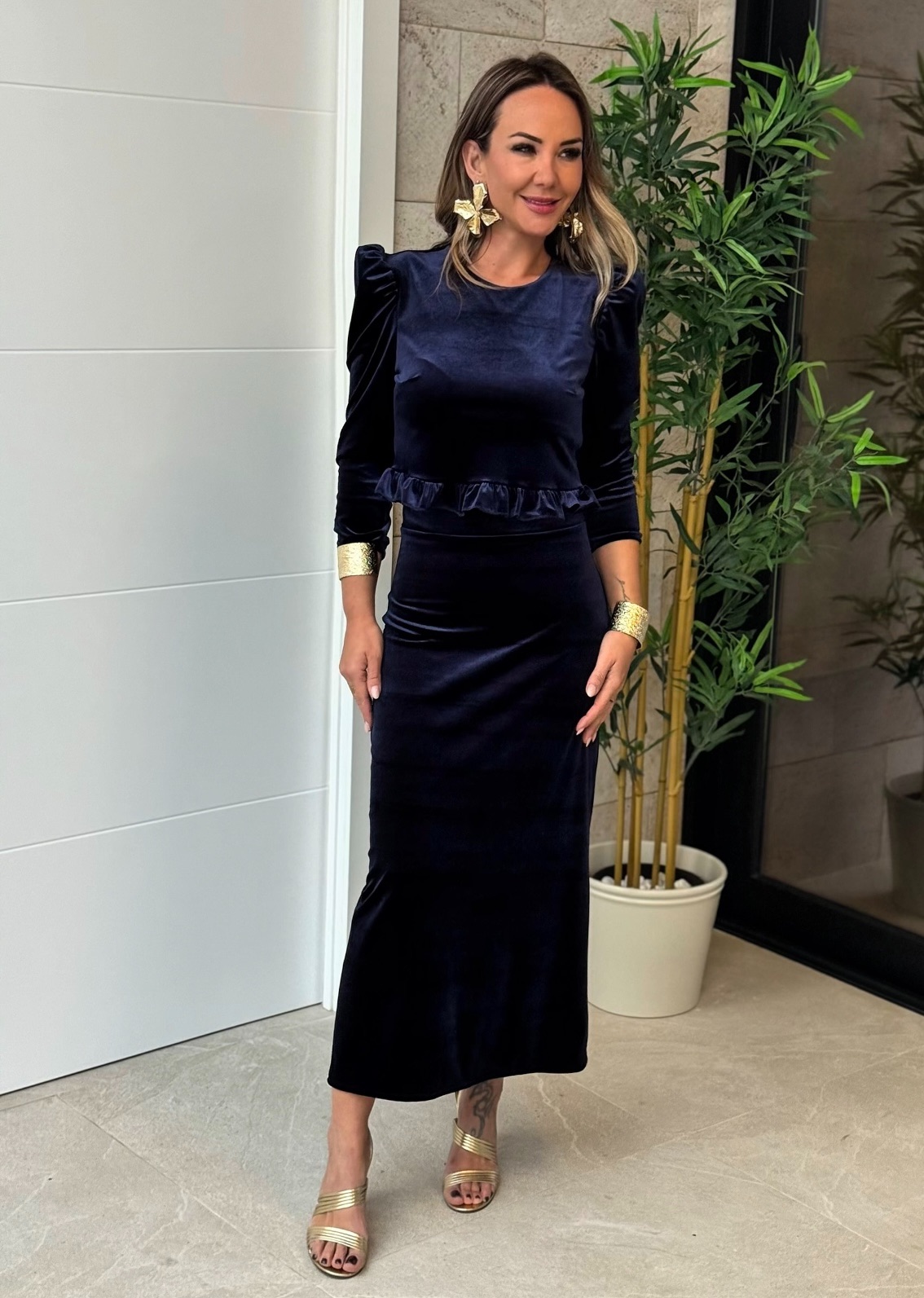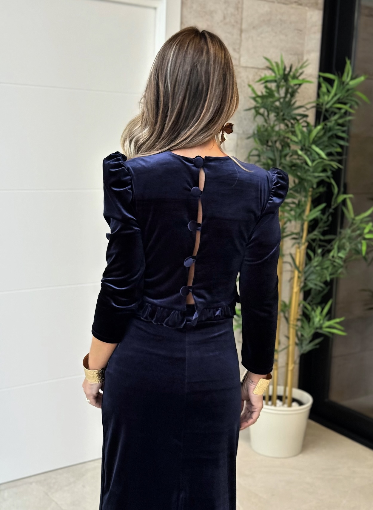 Conjunto top manga larga abullonada con volante bajo, botones en espalda y falda midi con goma en cintura y corte detrás.
