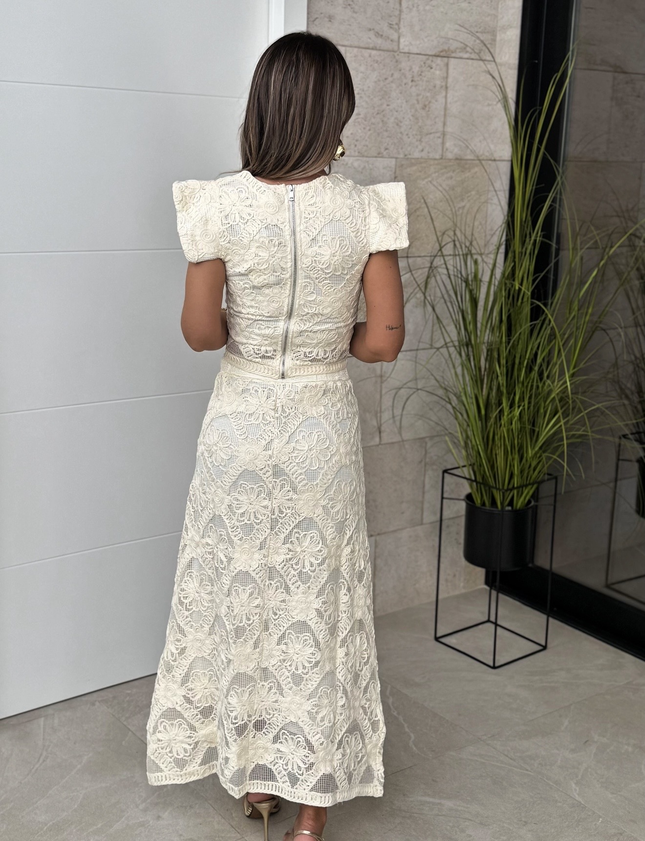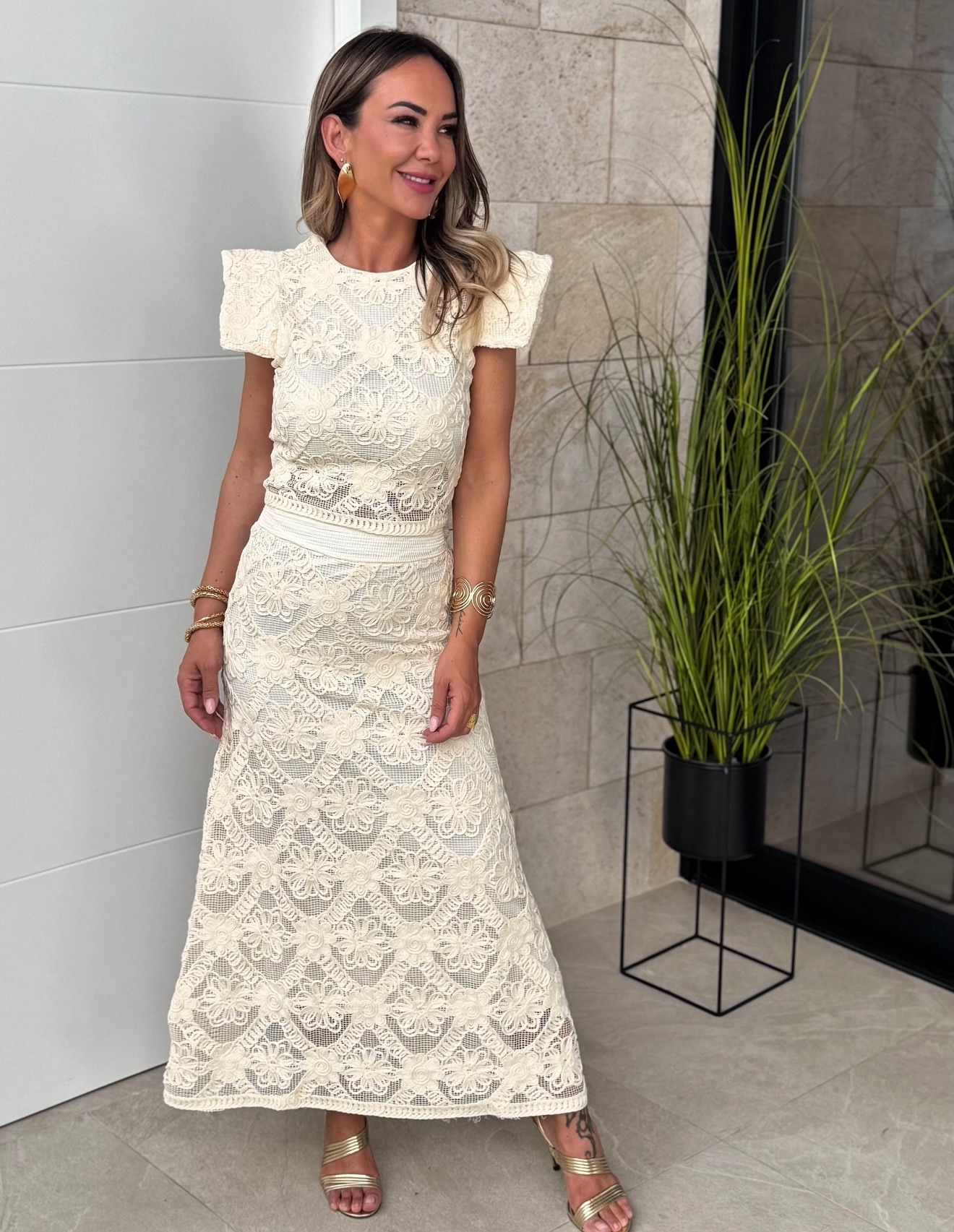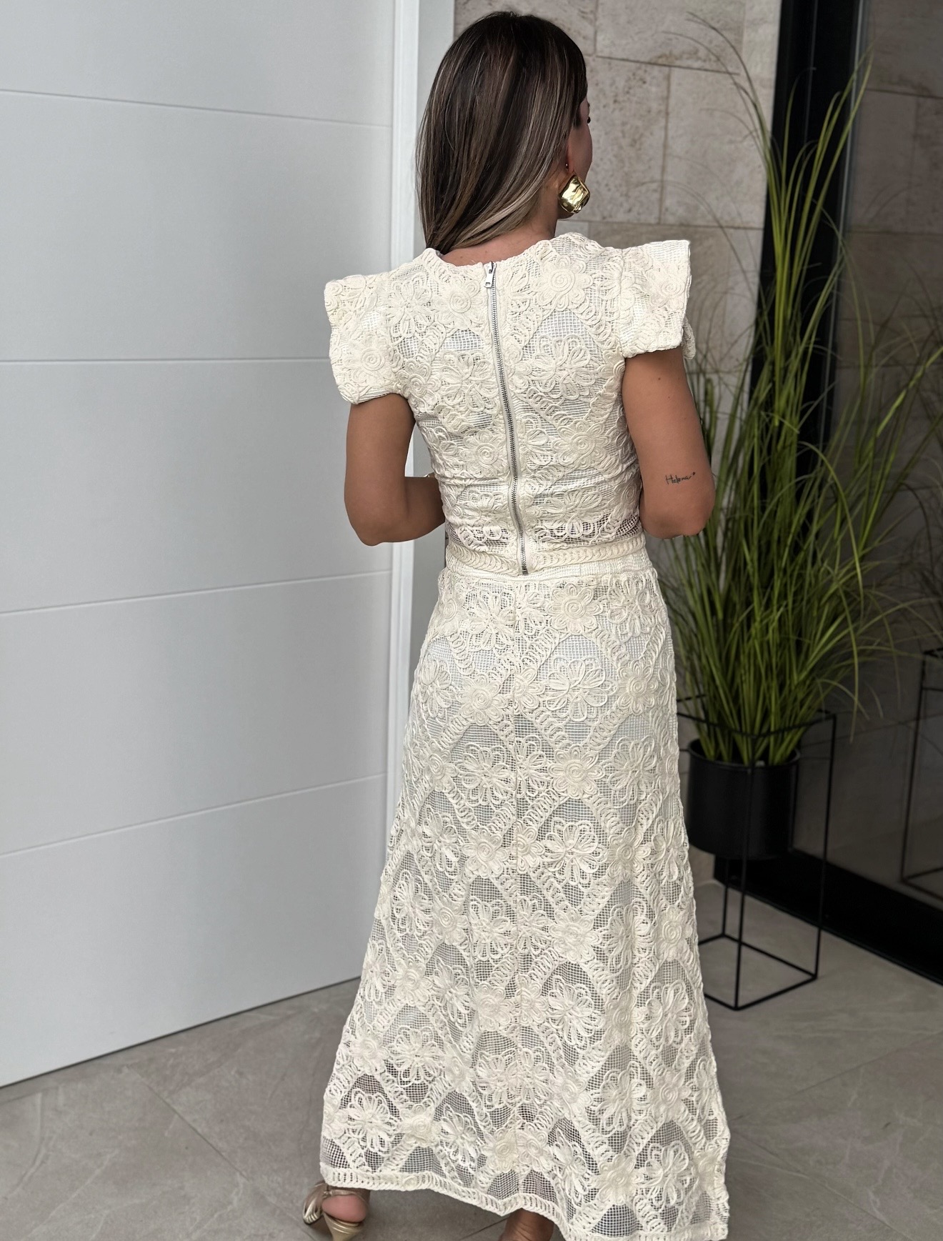 Conjunto top y falda con bordado sobrepuesto encima de forro, espalda con cremallera visible y falda con goma trasera.