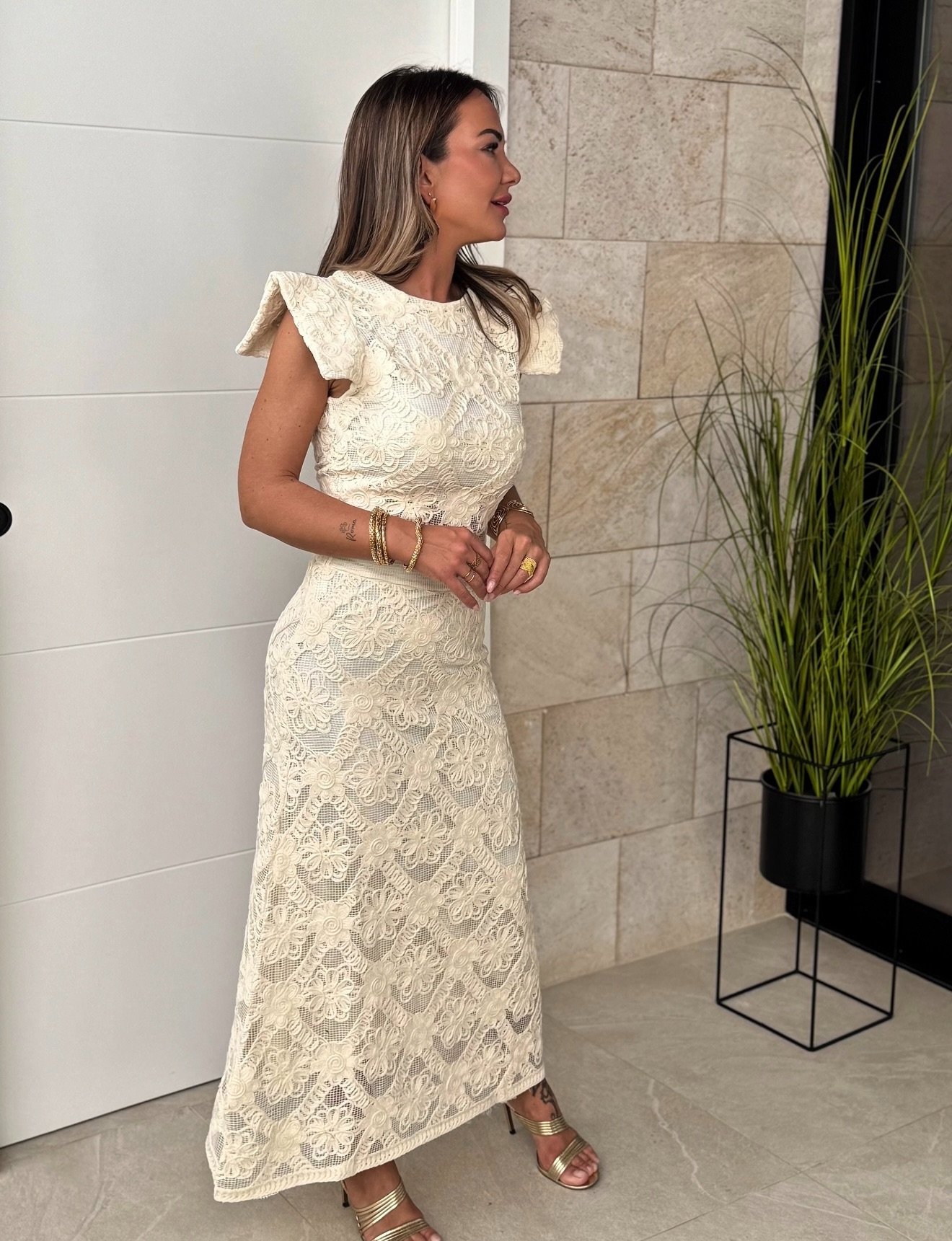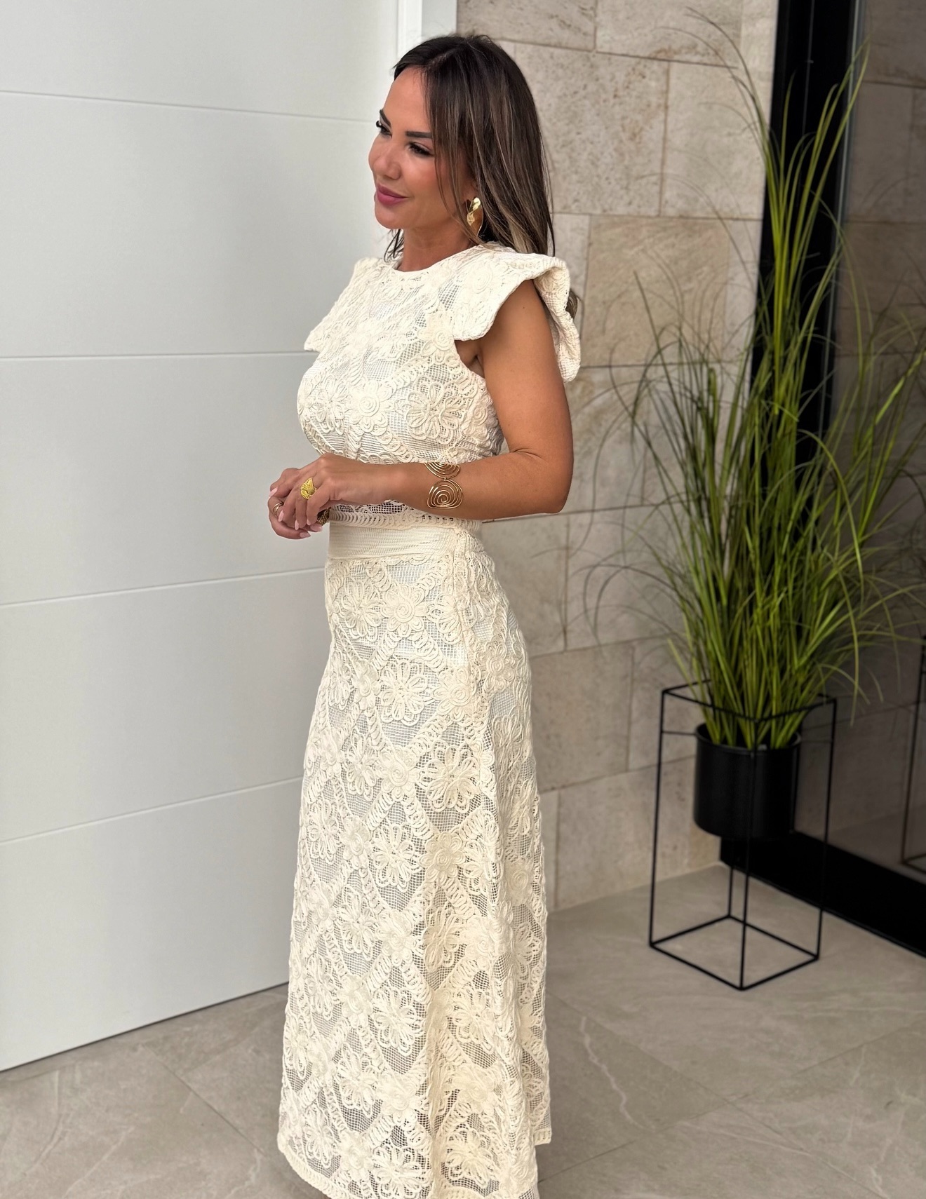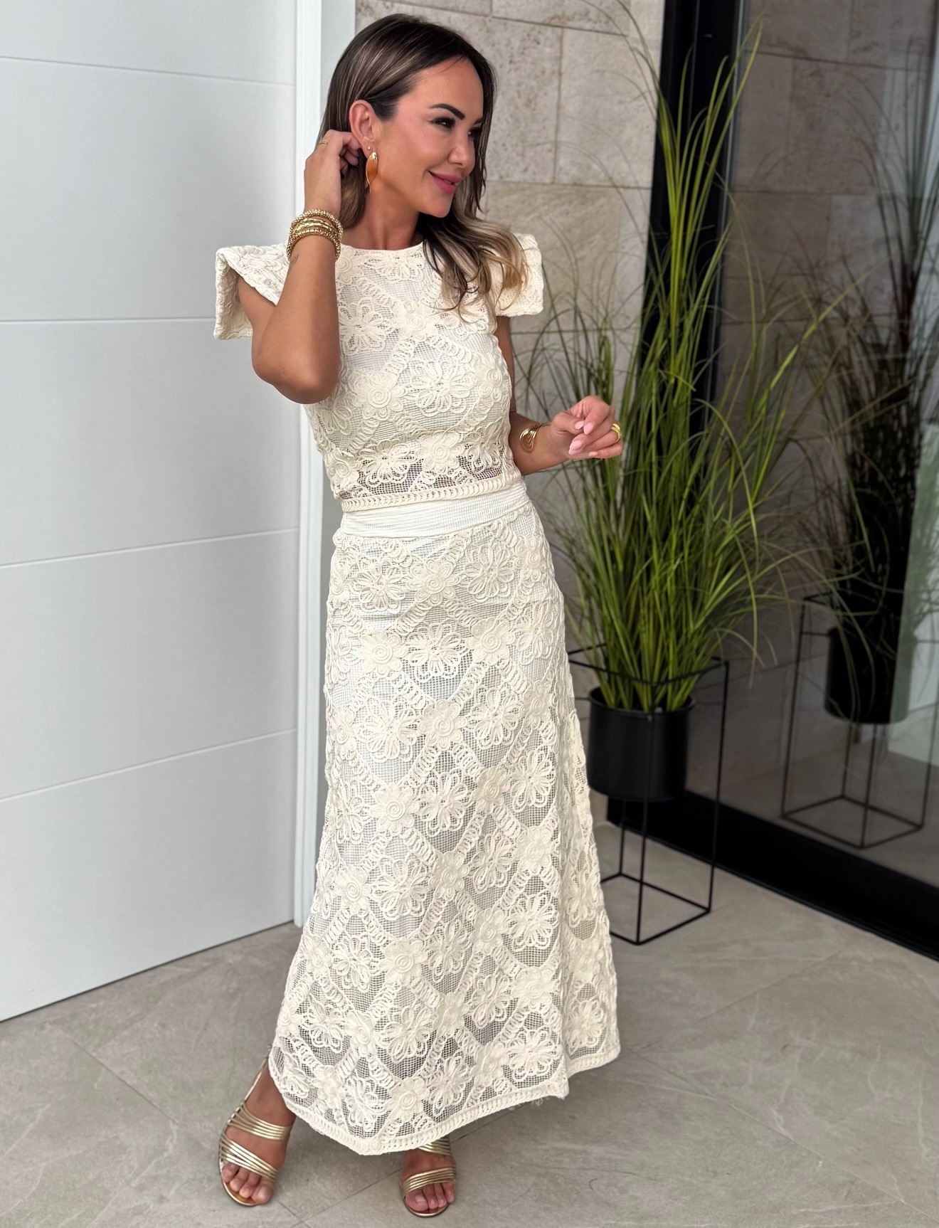 Conjunto top y falda con bordado sobrepuesto encima de forro, espalda con cremallera visible y falda con goma trasera.