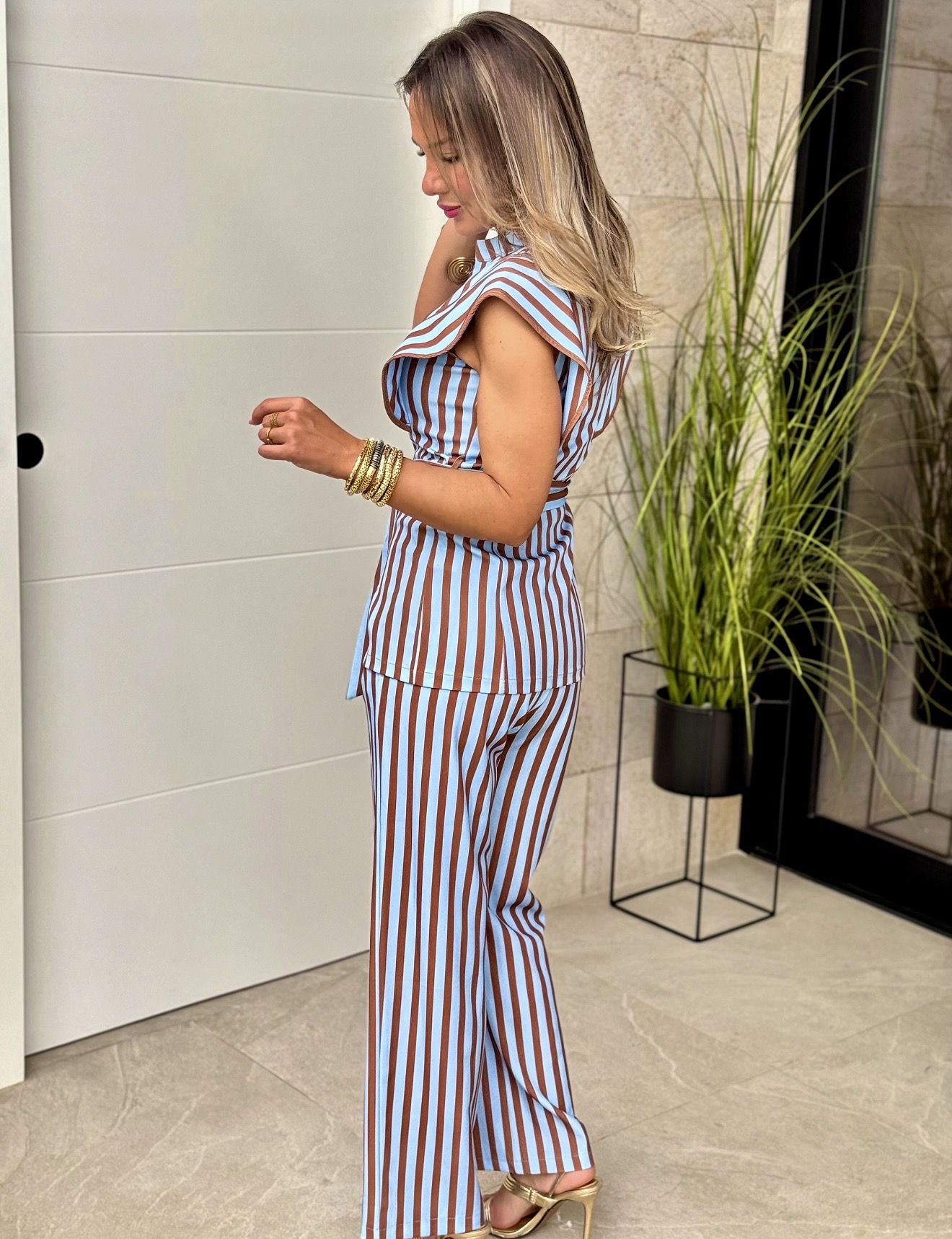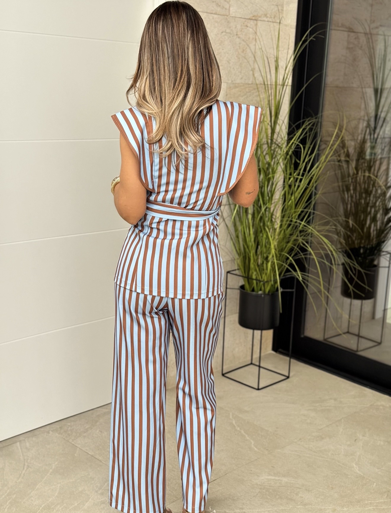 Conjunto Romina Celeste Marrón Sin Mangas