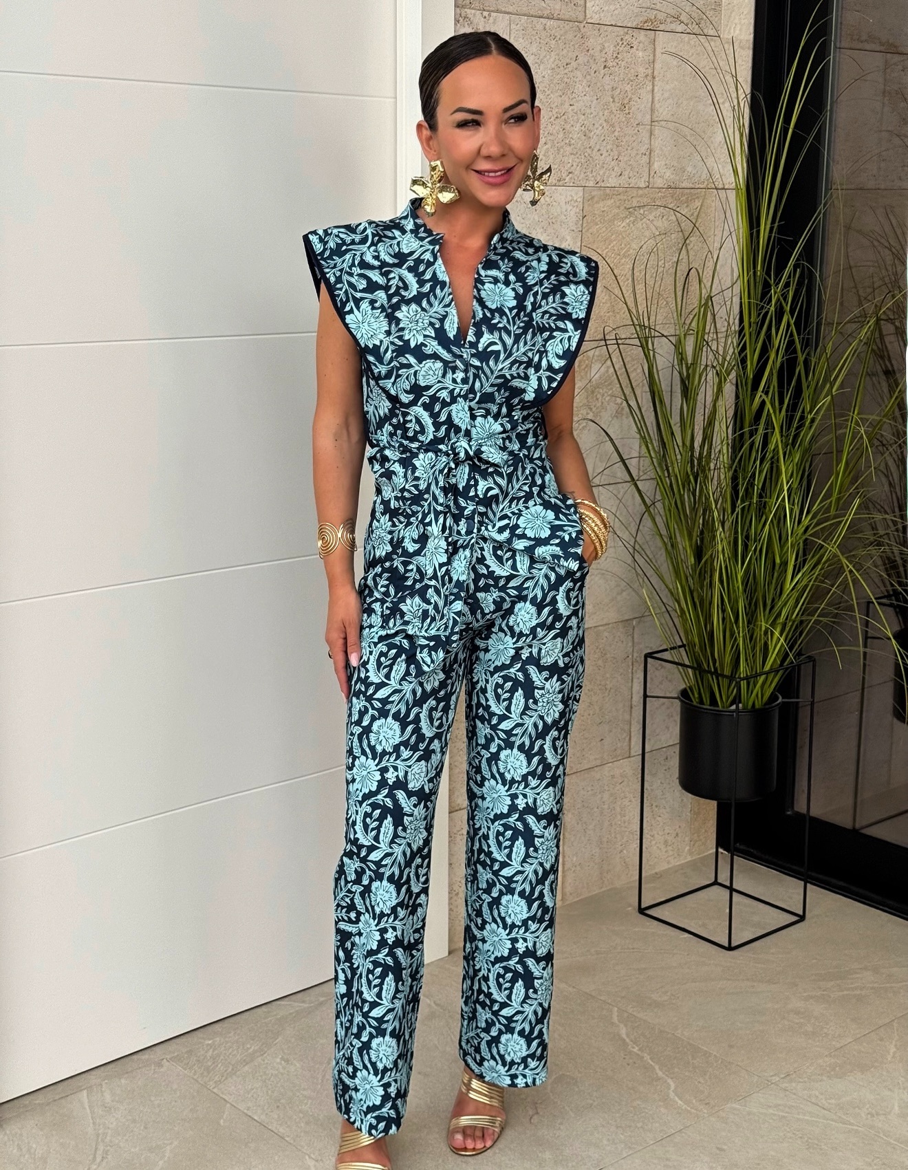 Conjunto chaqueta manga larga cuello maho botones y lazada, pantalón recto tobillero con botón, cremallera y goma en cintura.
