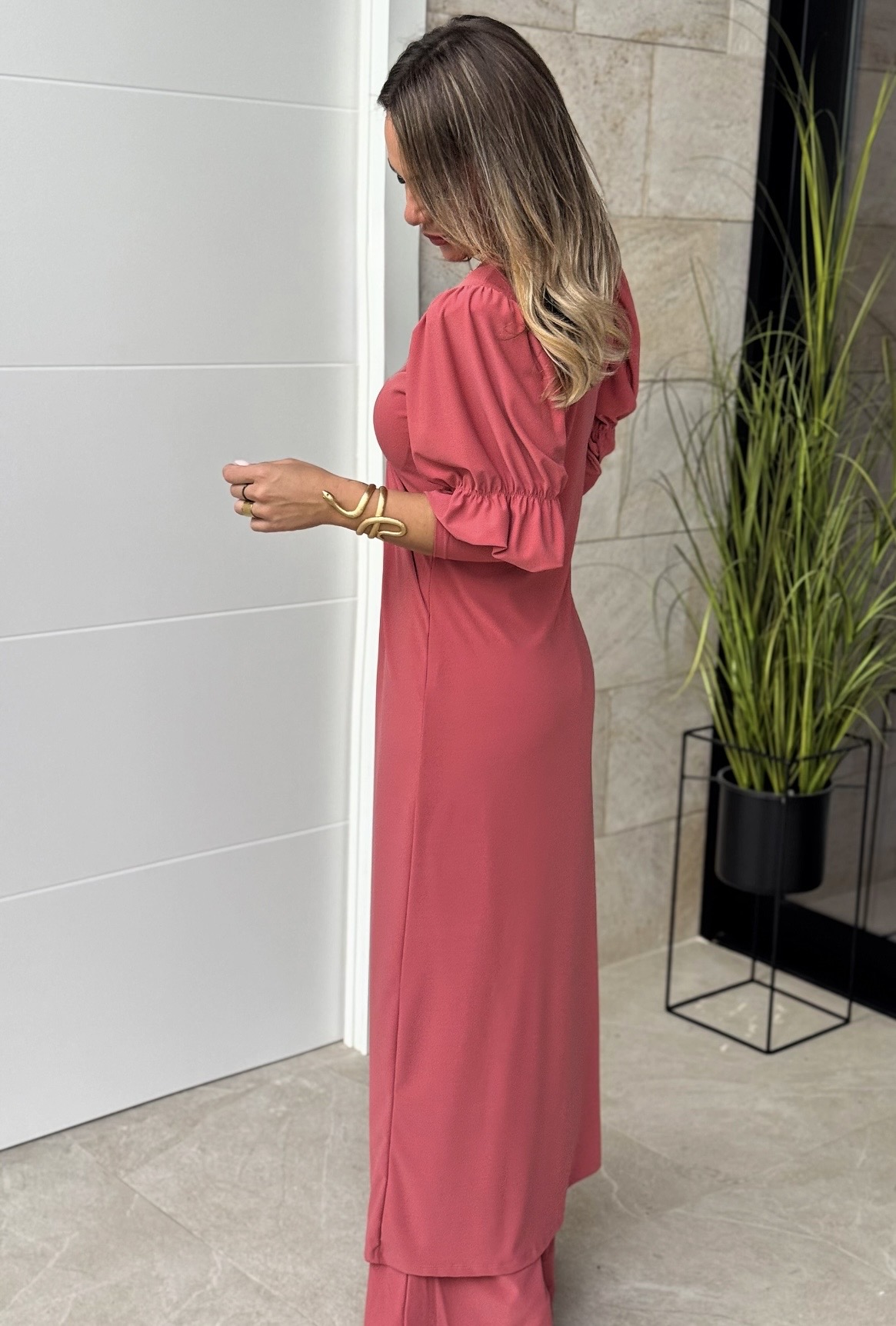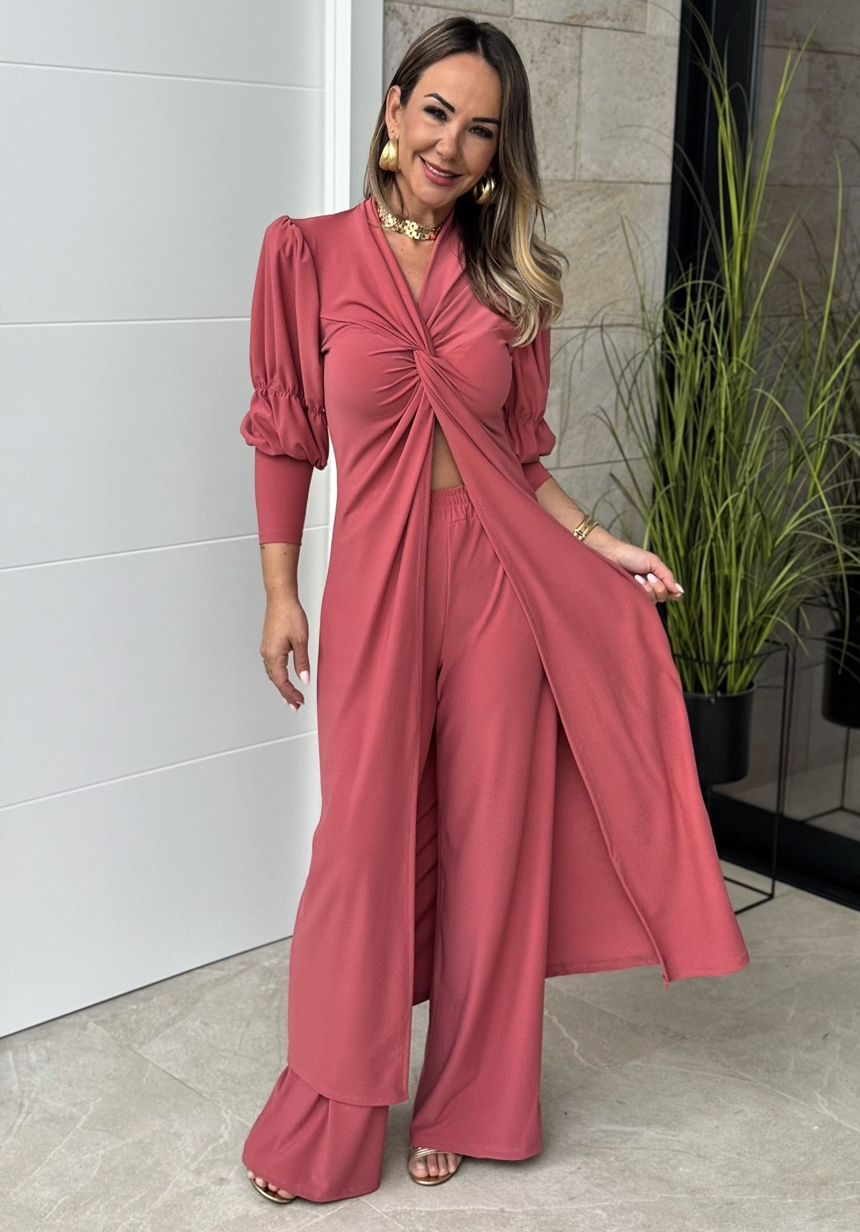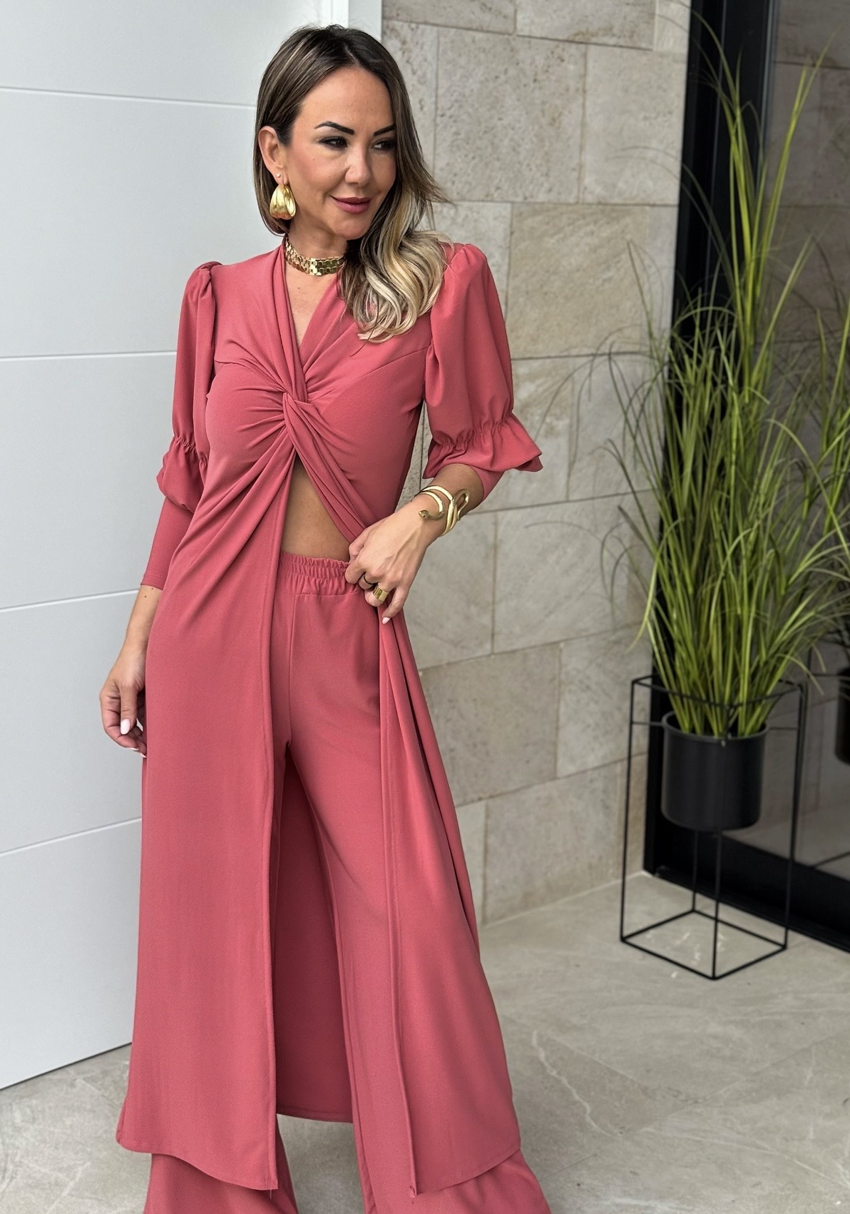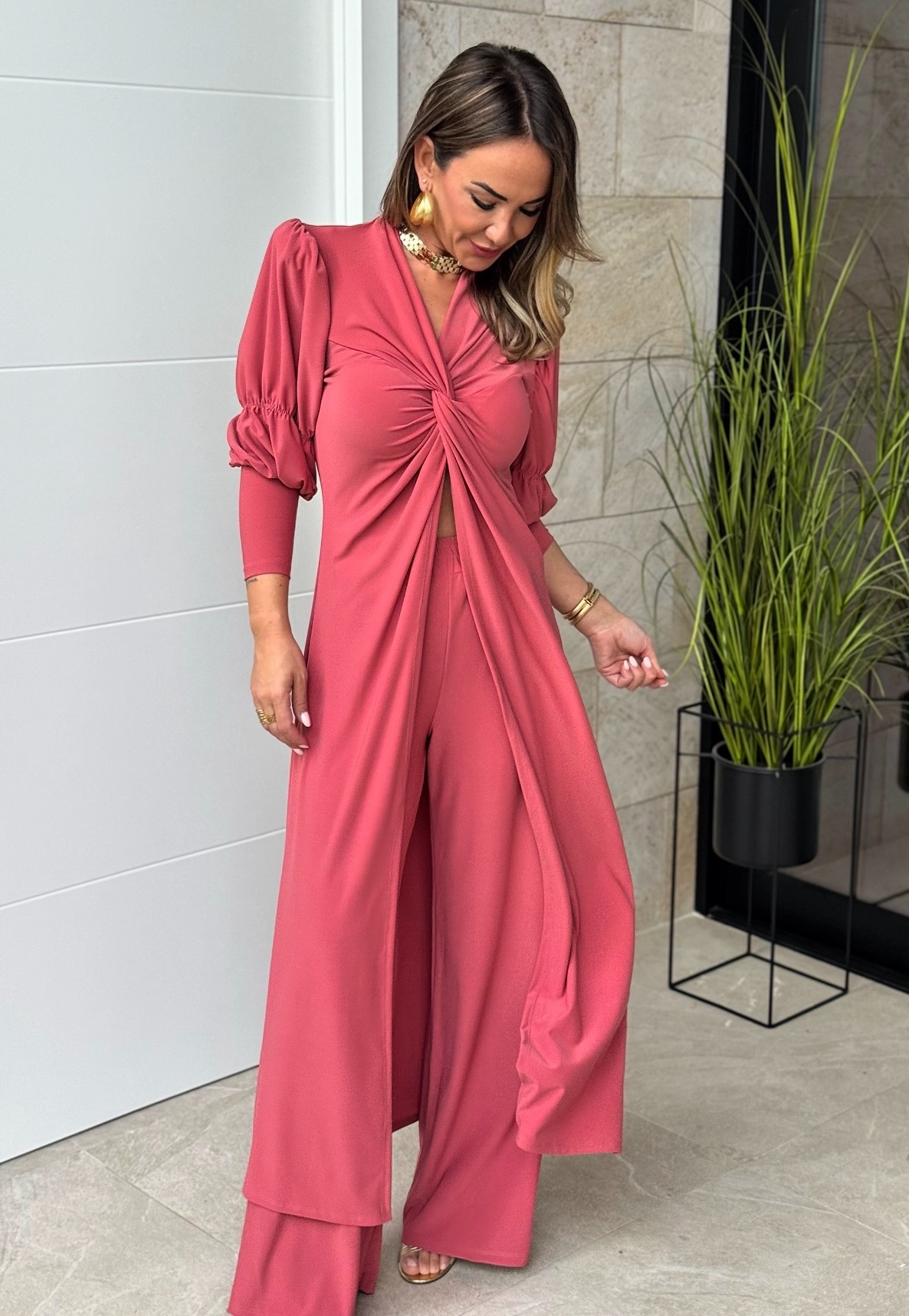 Conjunto top largo manga larga con frunces y nudo central, pantalón con goma en cintura recto.