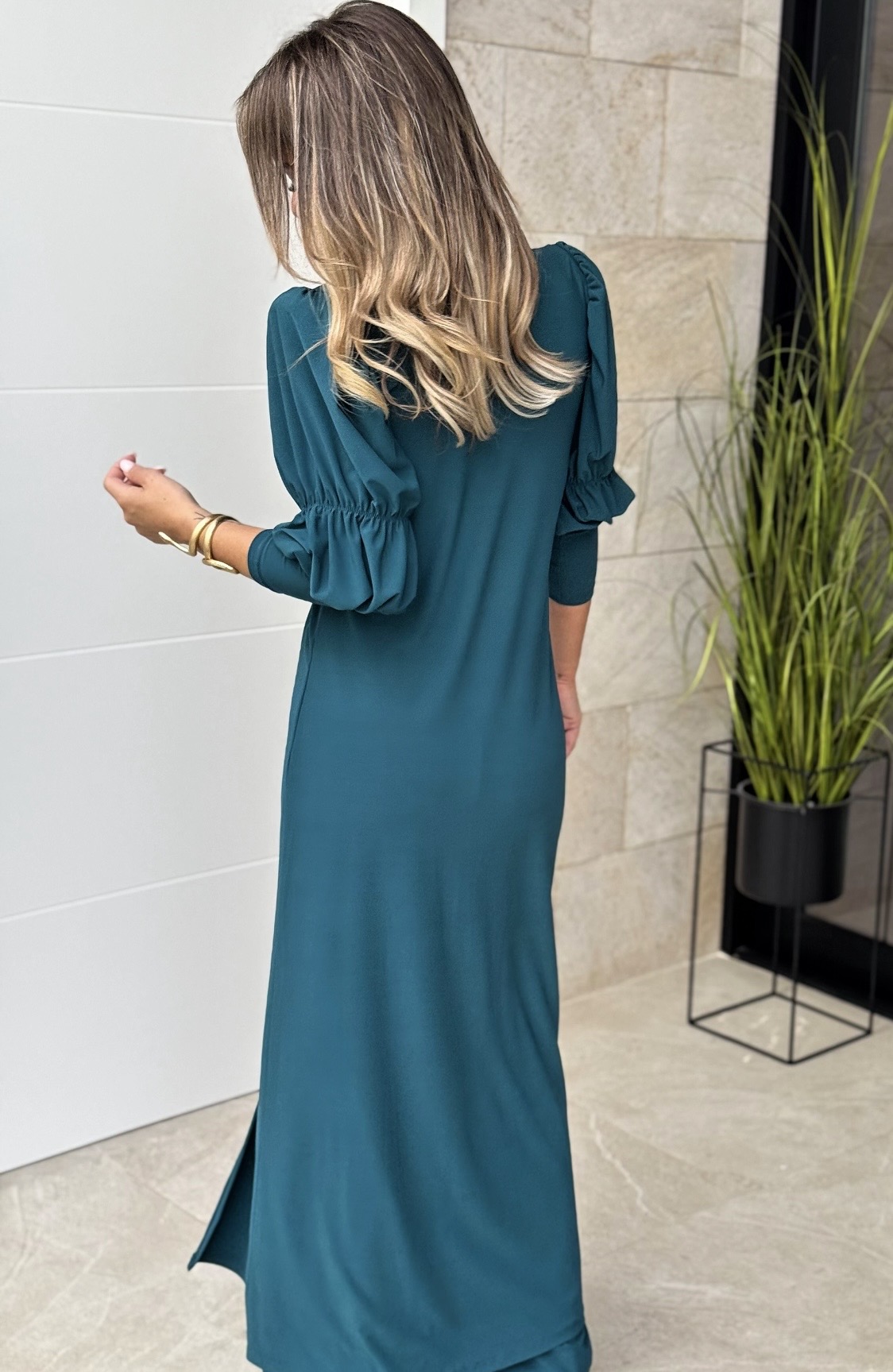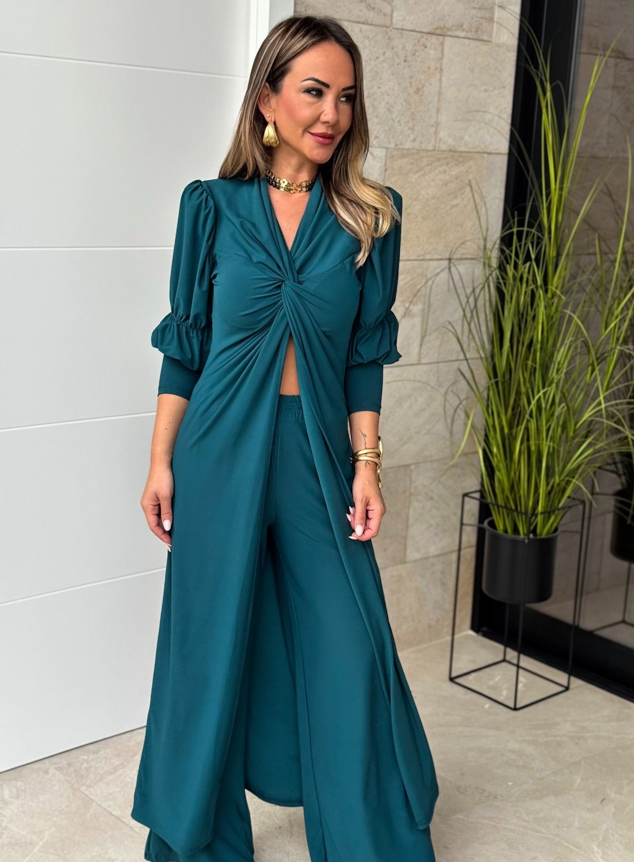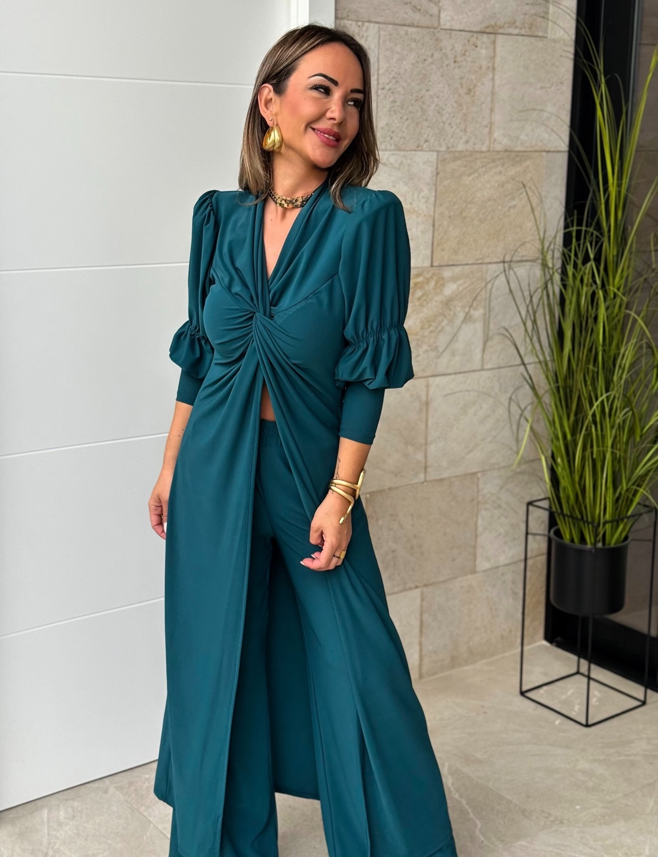 Conjunto top largo manga larga con frunces y nudo central, pantalón con goma en cintura recto.