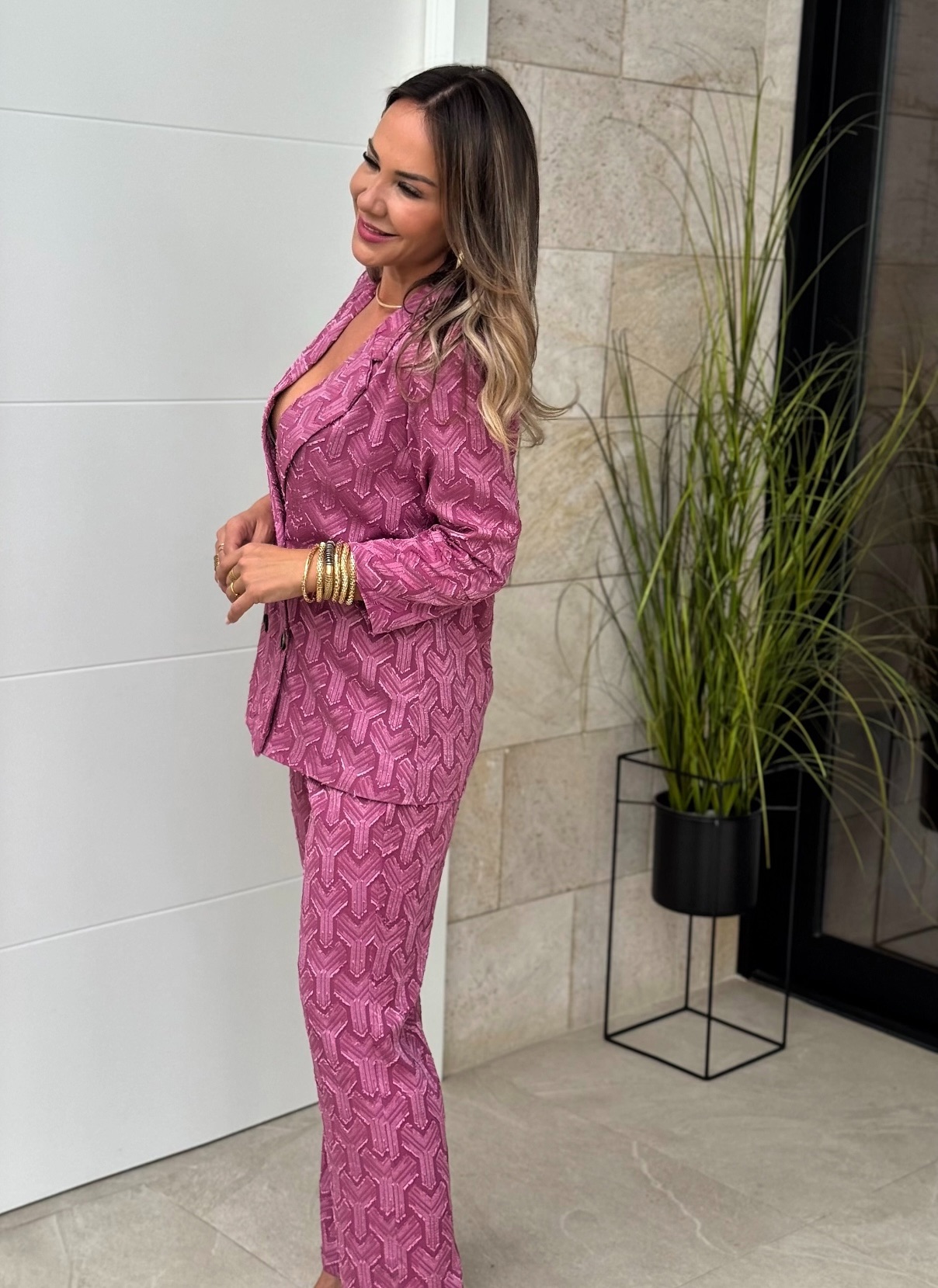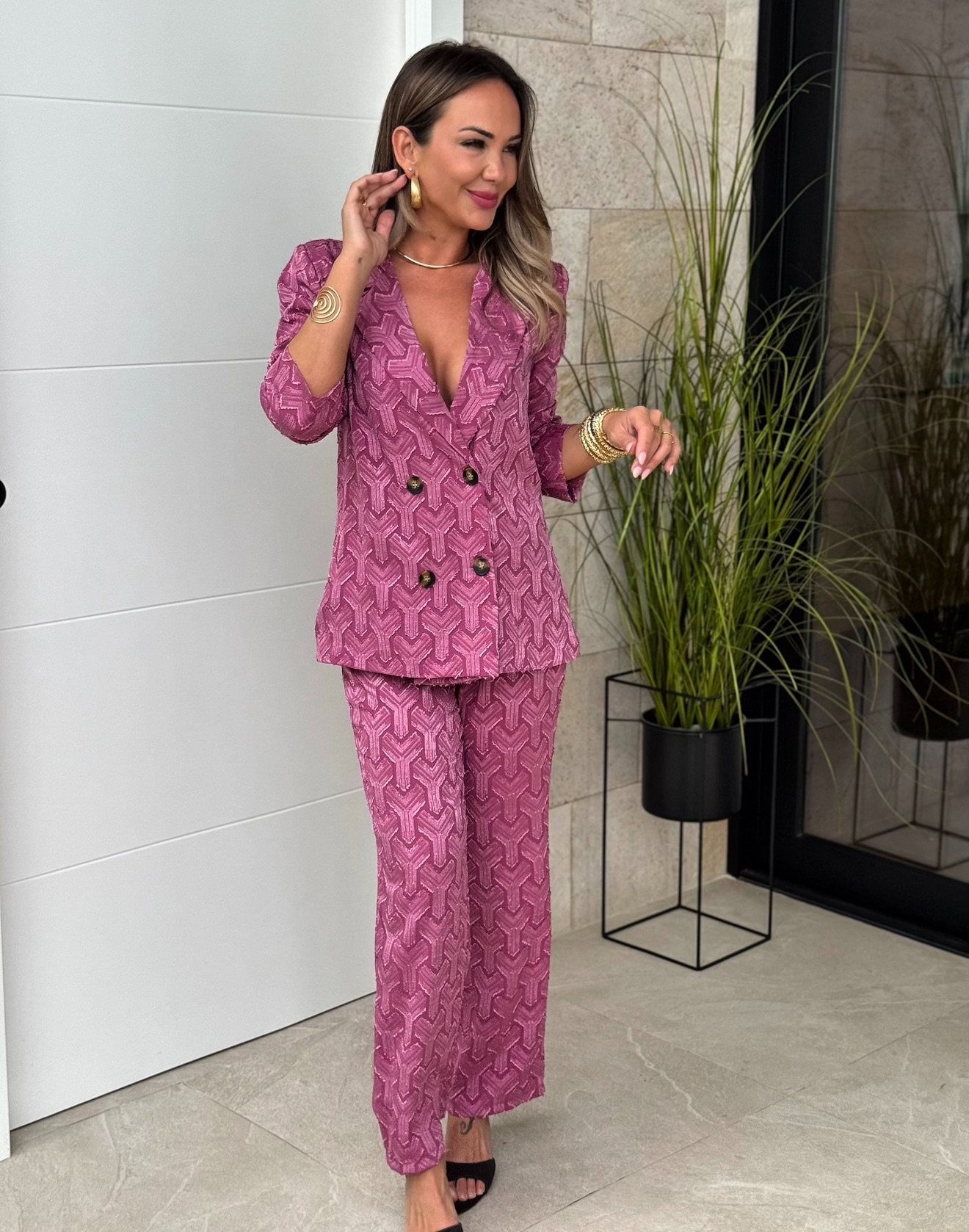 Conjunto blazer cruzada con botones marrones y pantalón con goma en cintura recto.