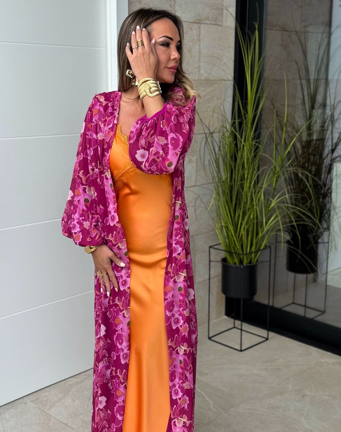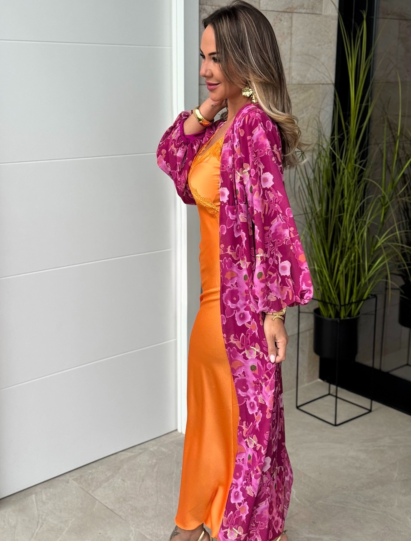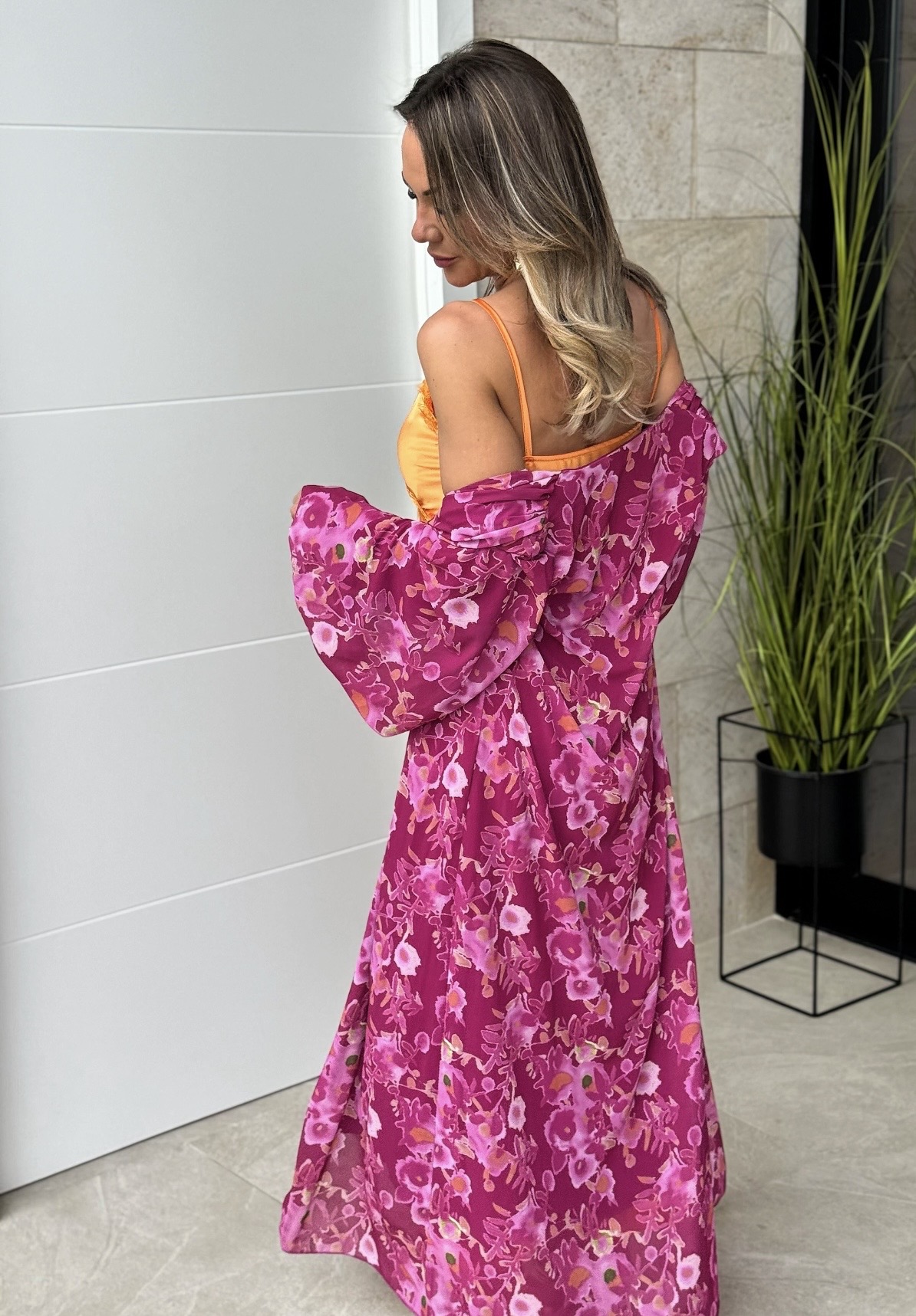 Vestido de tirante fino ajustable con escote pico lencero satinado y caftan media manga largo.