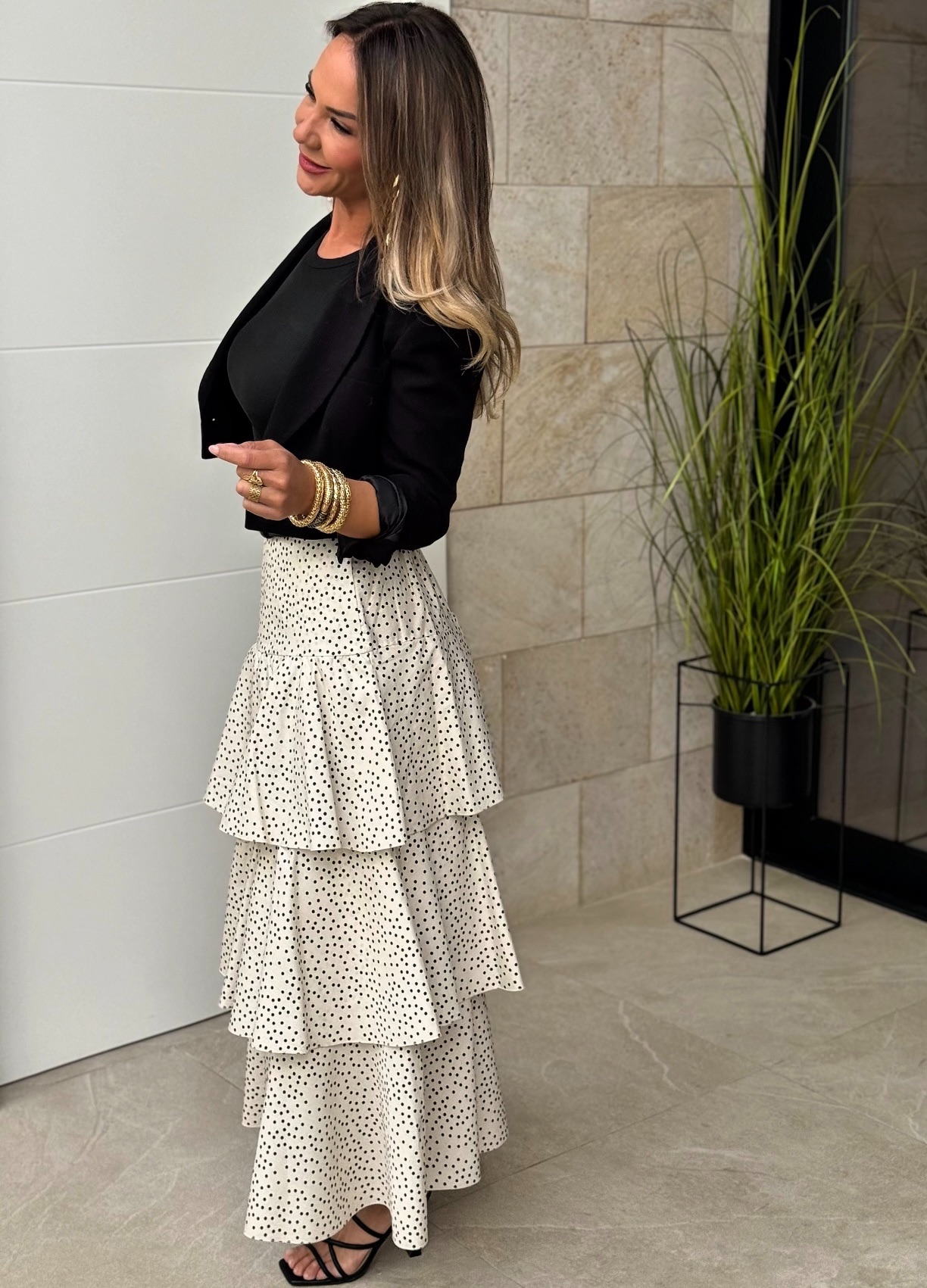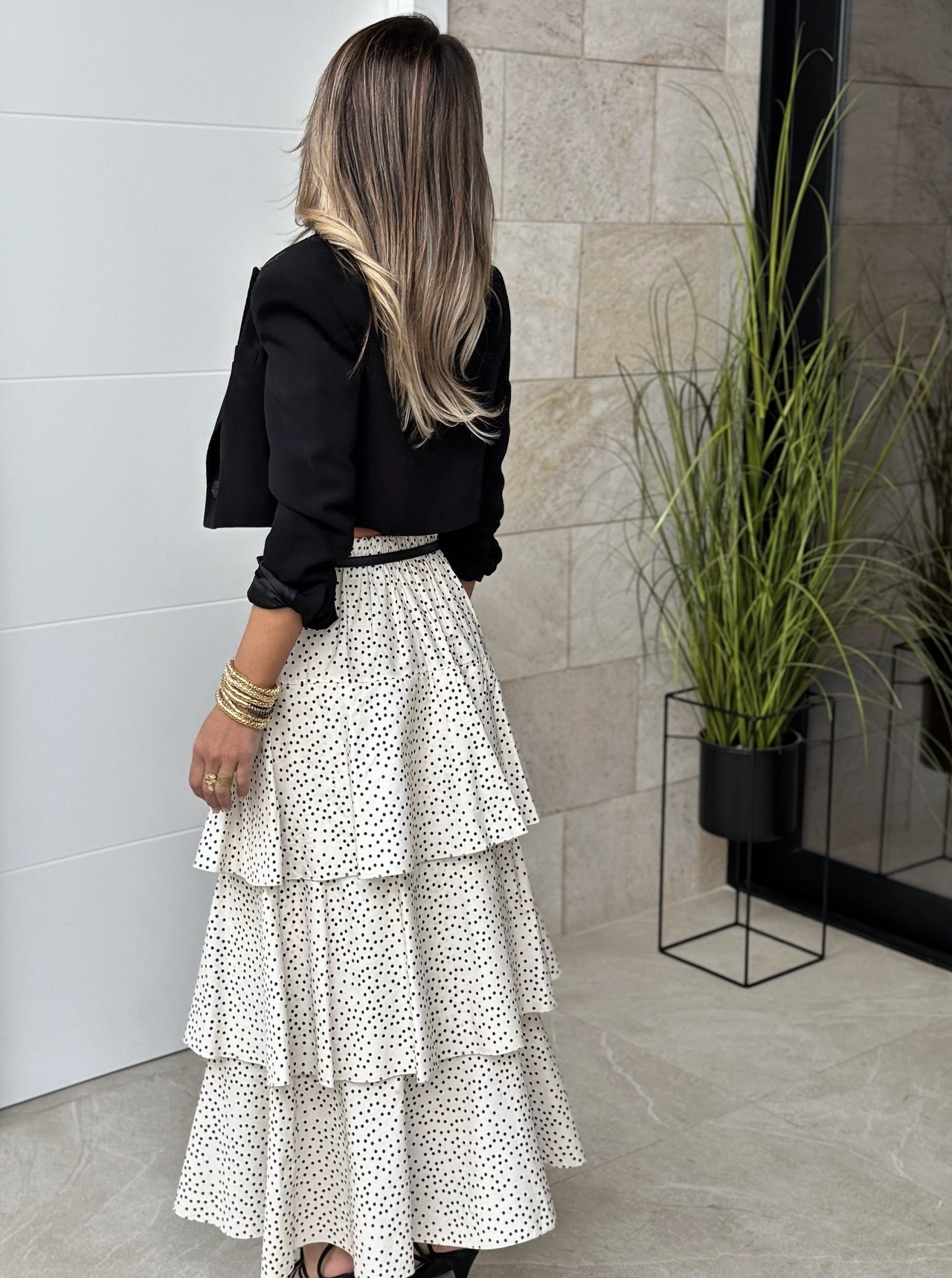 Falda larga de volantes anchos con goma en cintura.