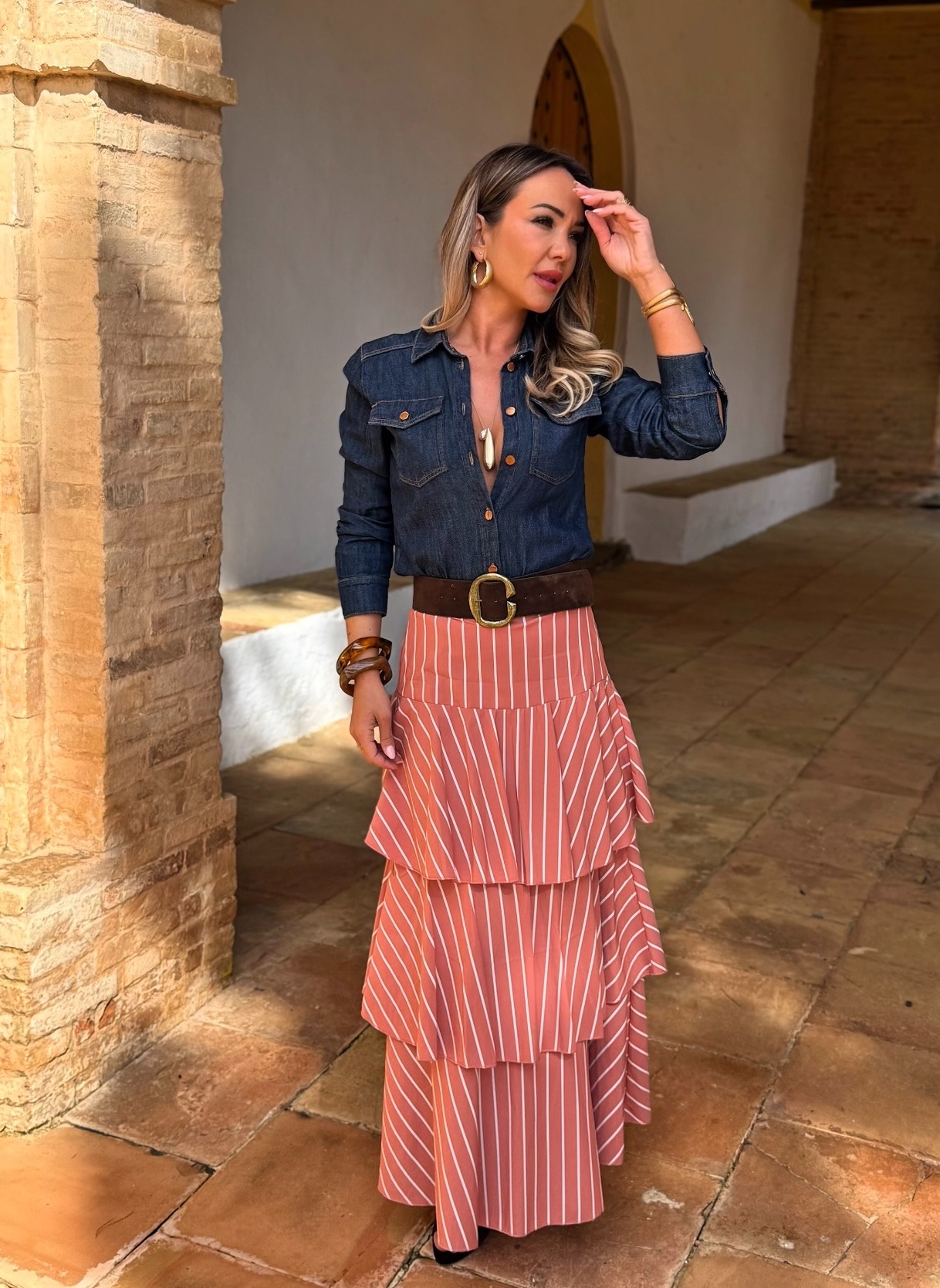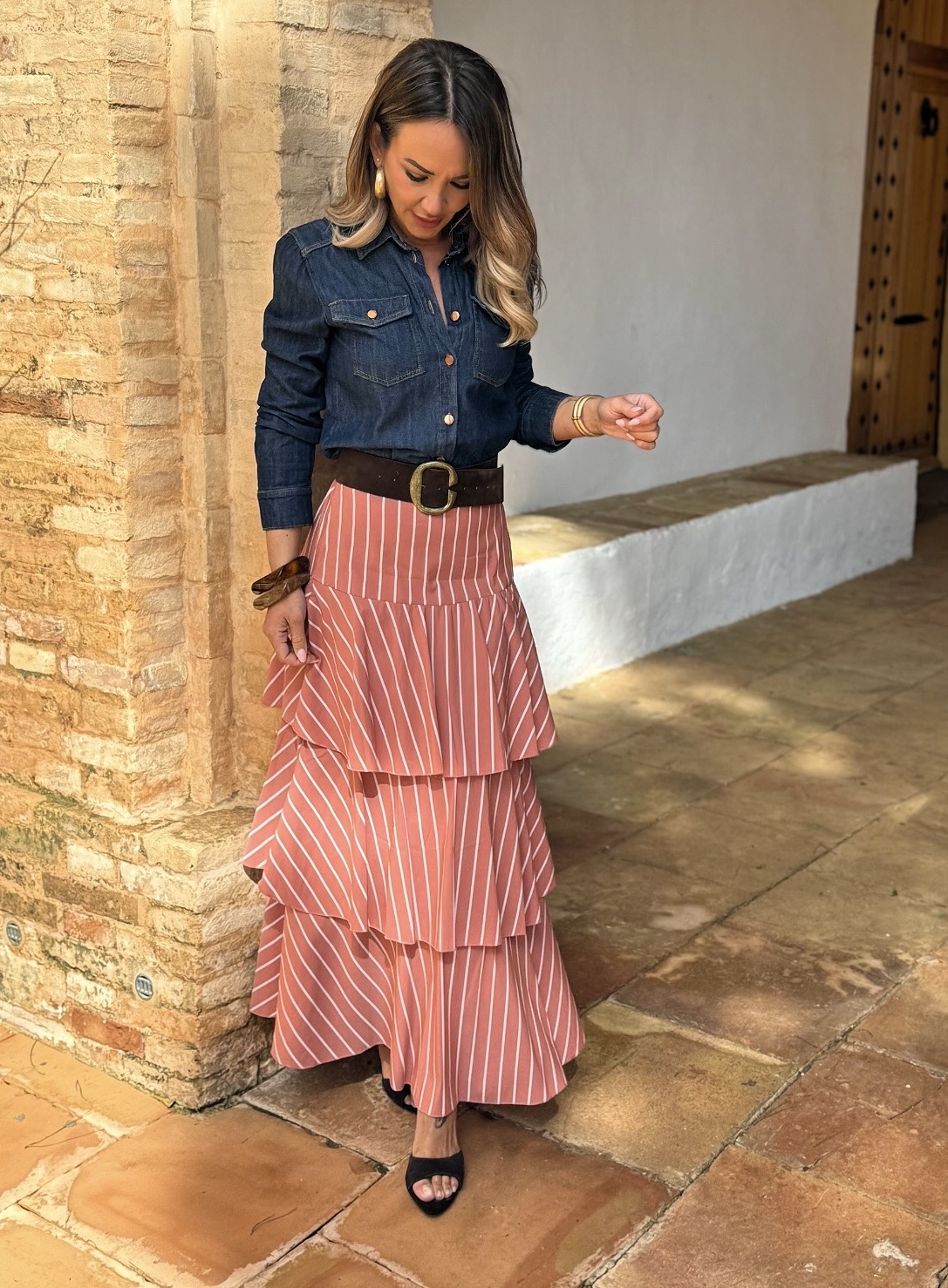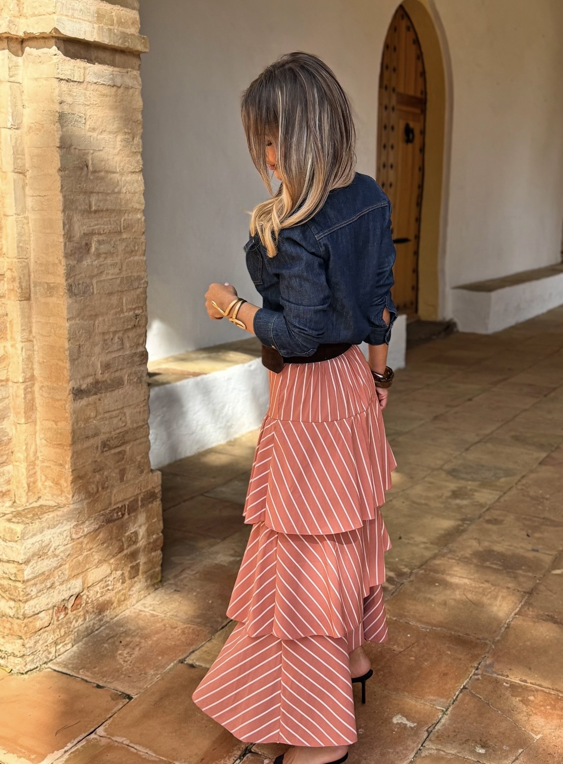 Falda Larga Rayas Volantes Teja