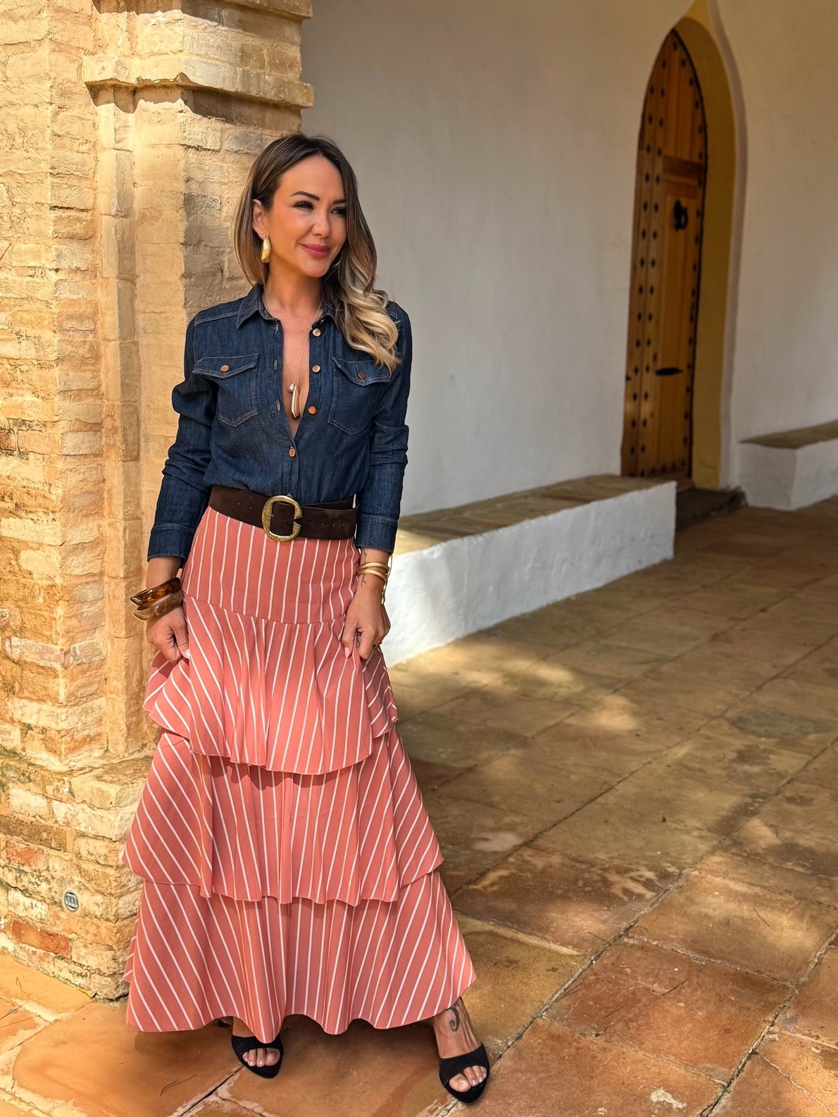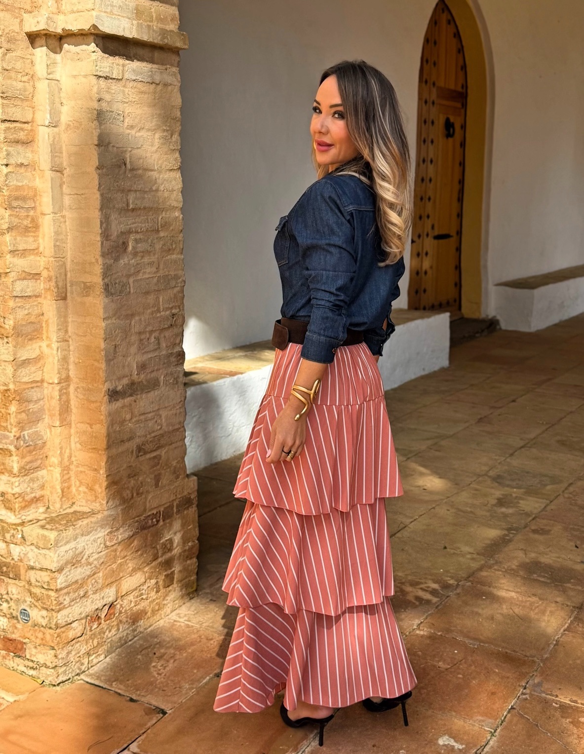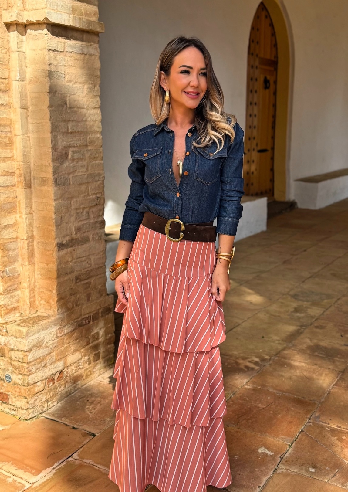 Falda Larga Rayas Volantes Teja