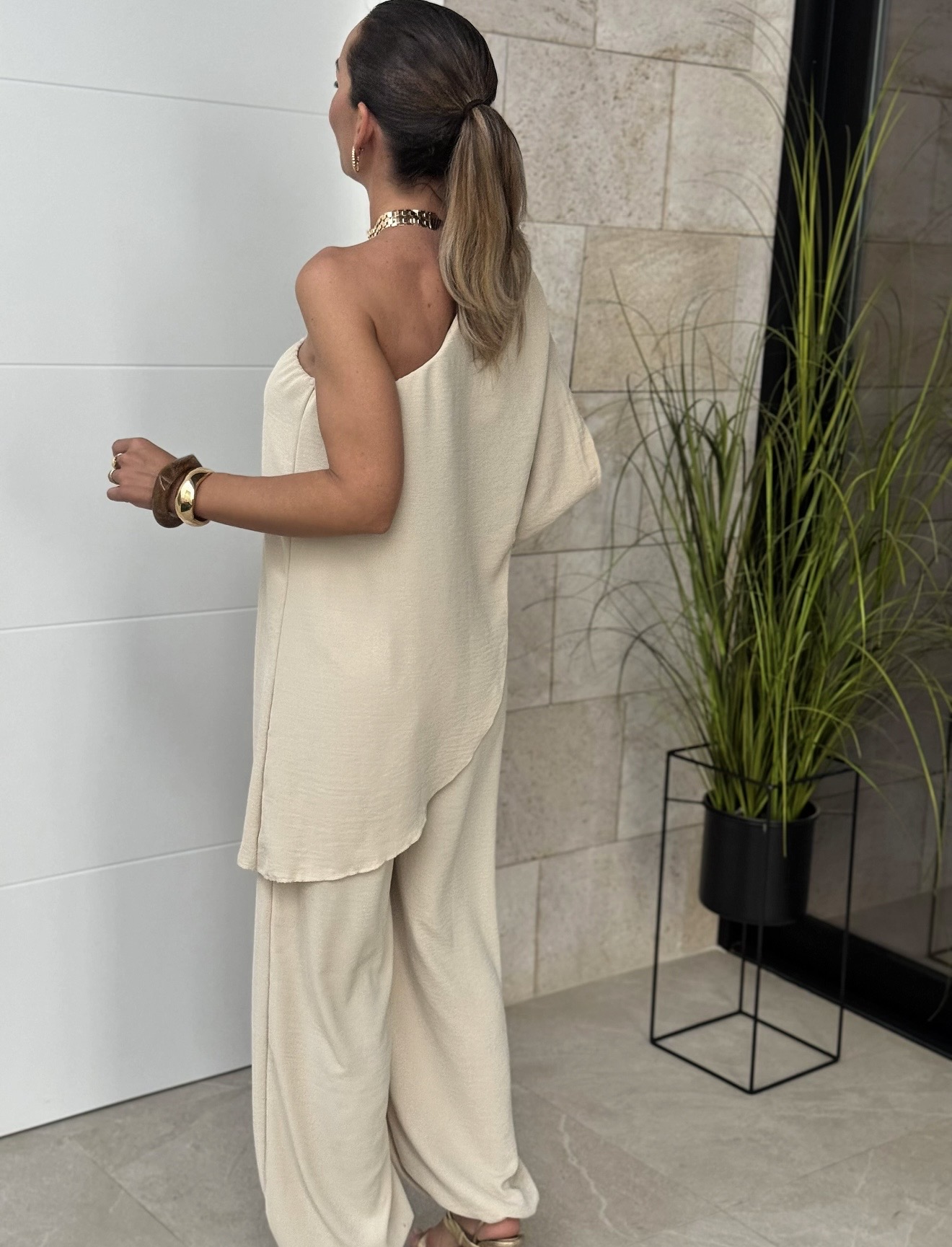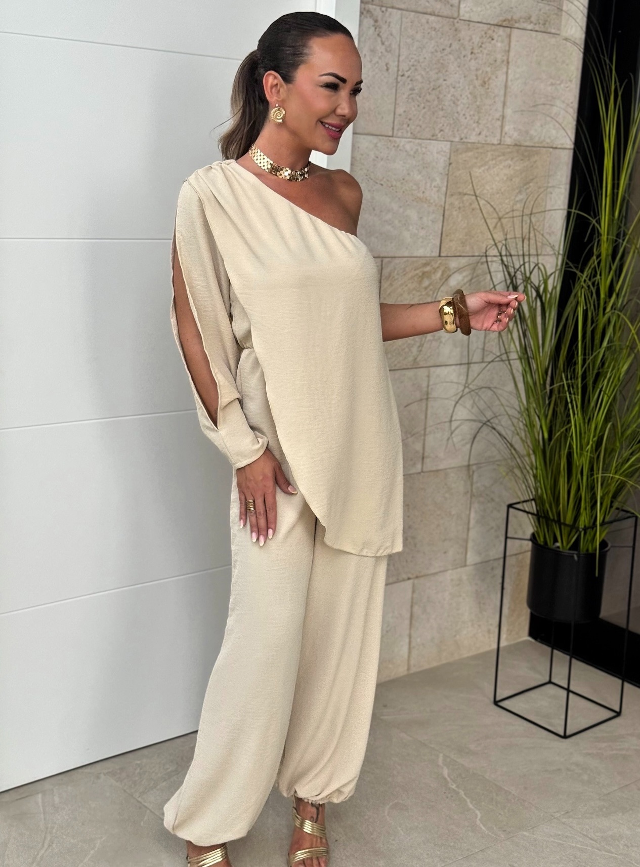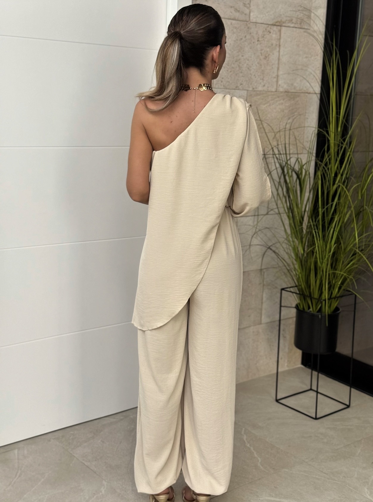 Mono asimétrico con capa, pantalón bombacho y goma en cintura y tobillos.