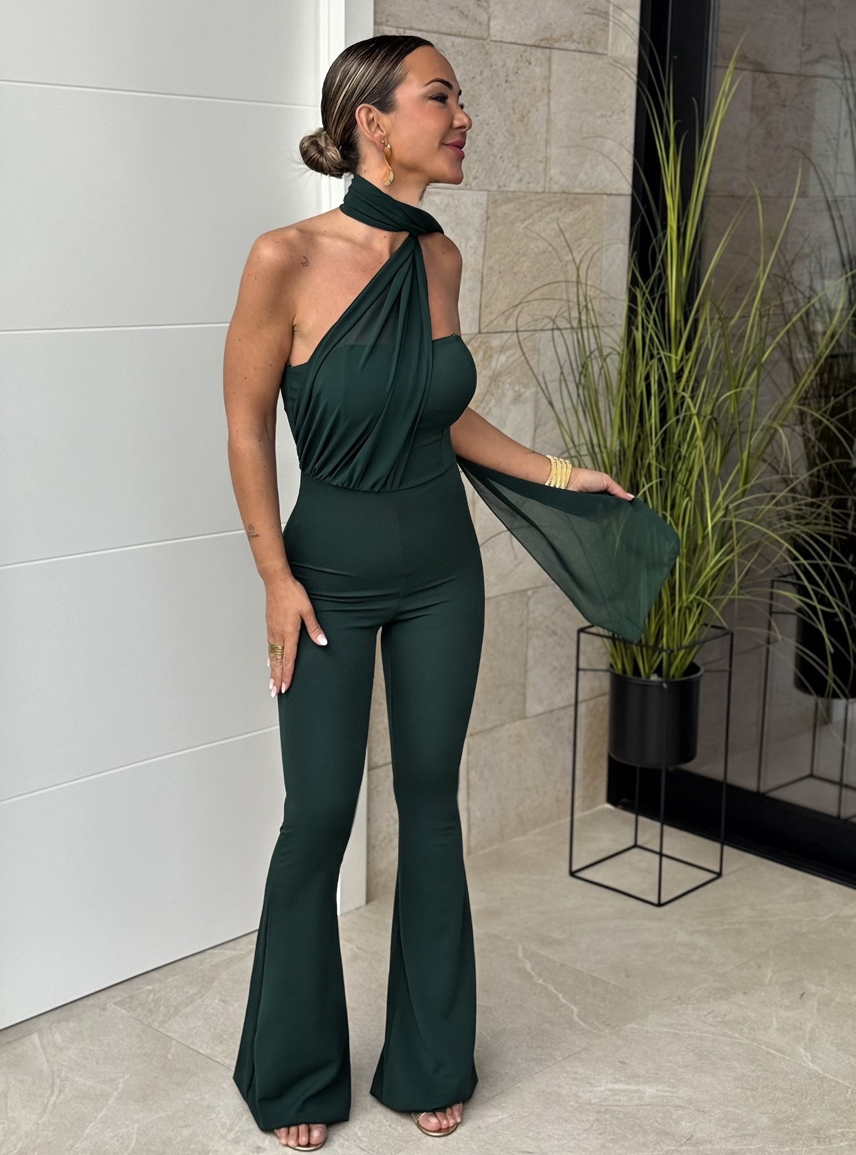 Mono largo palabra de honor con tirante fino ajustable, cremallera en espalda y detalle fular gasa en cuello.