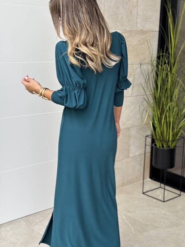 Mono largo cuello subido halter con espalda descubierta y solapas como detalle, cremallera detrás.