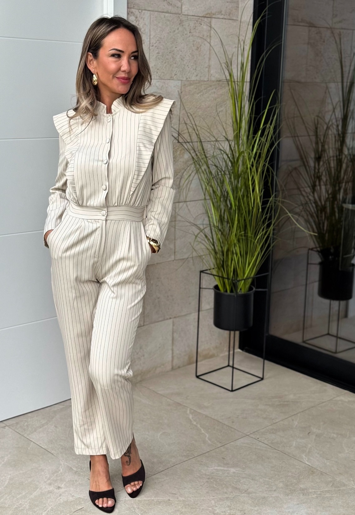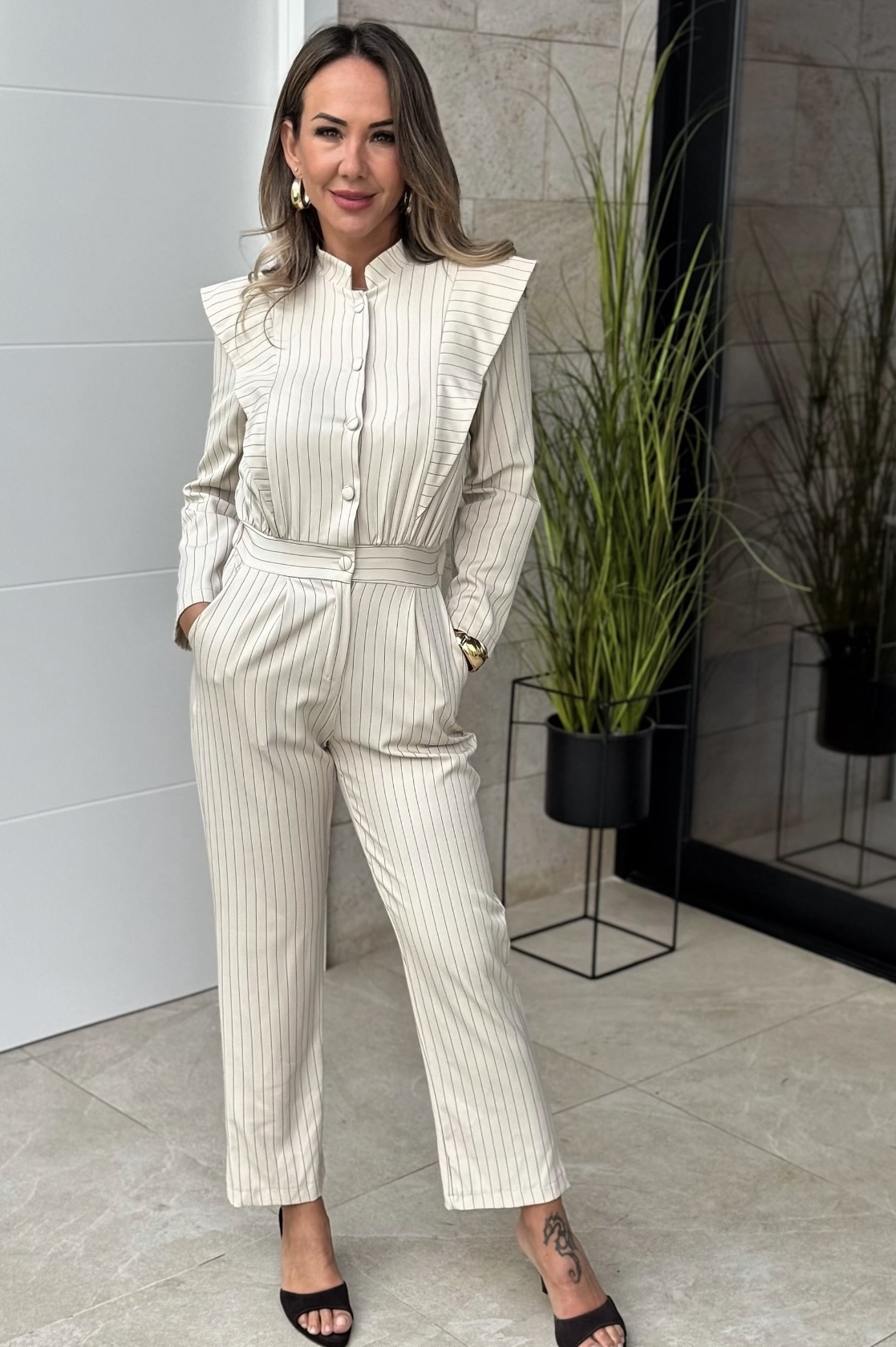 Mono manga larga con cuello subido y botones y solapas en hombros, pantalón con cremallera y bolsillos, goma detrás.